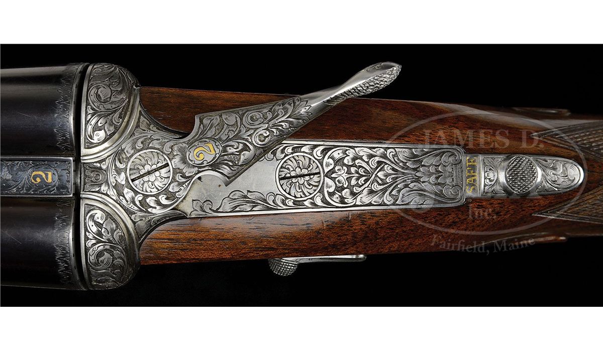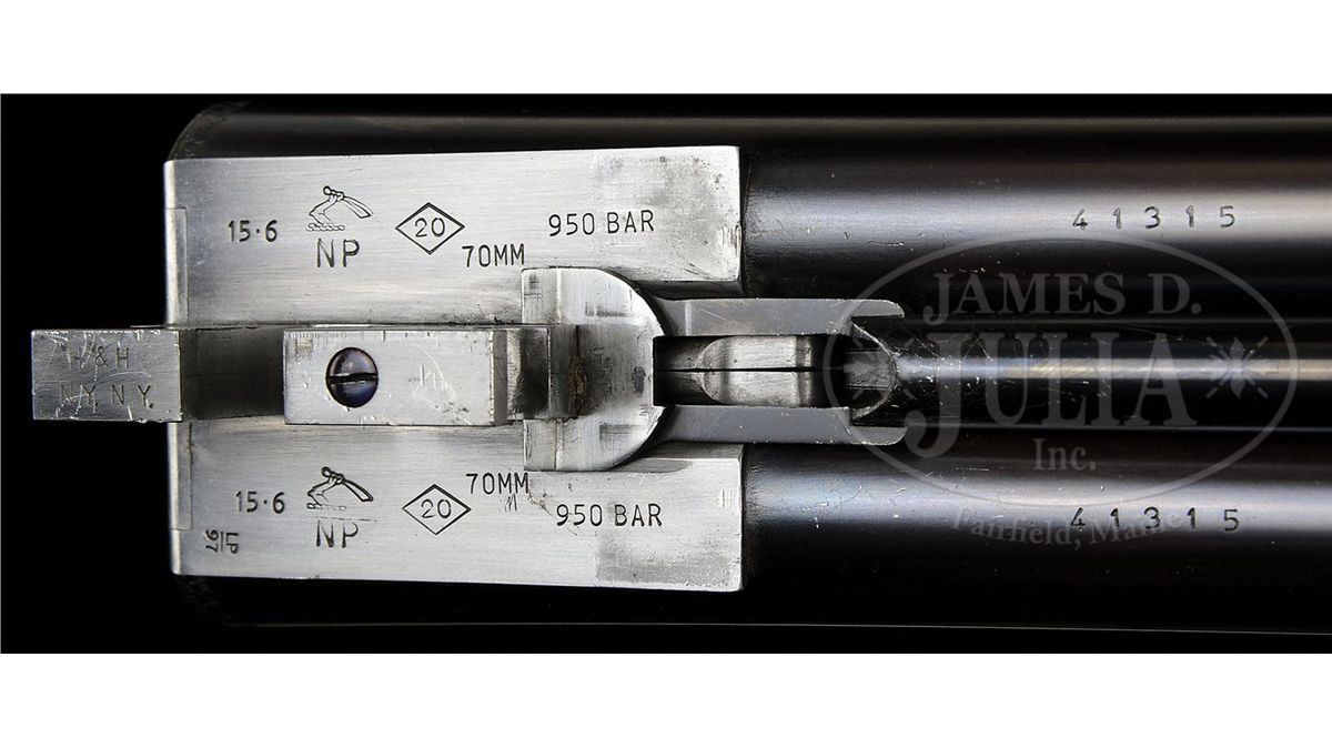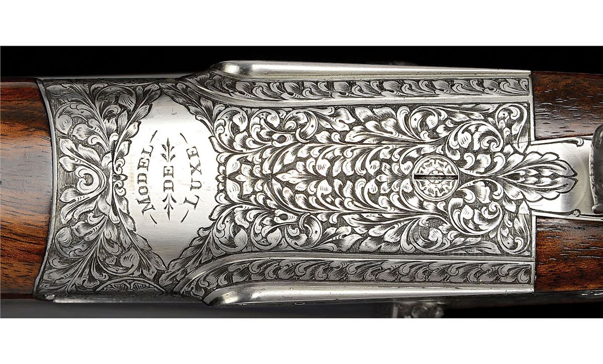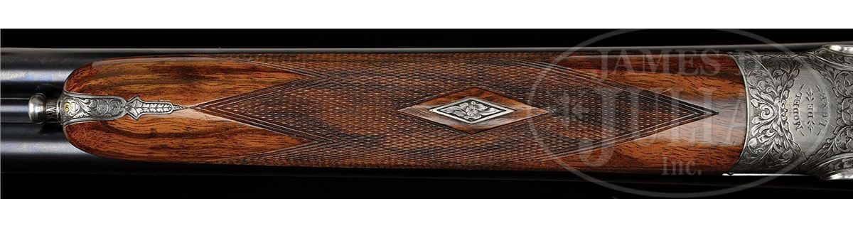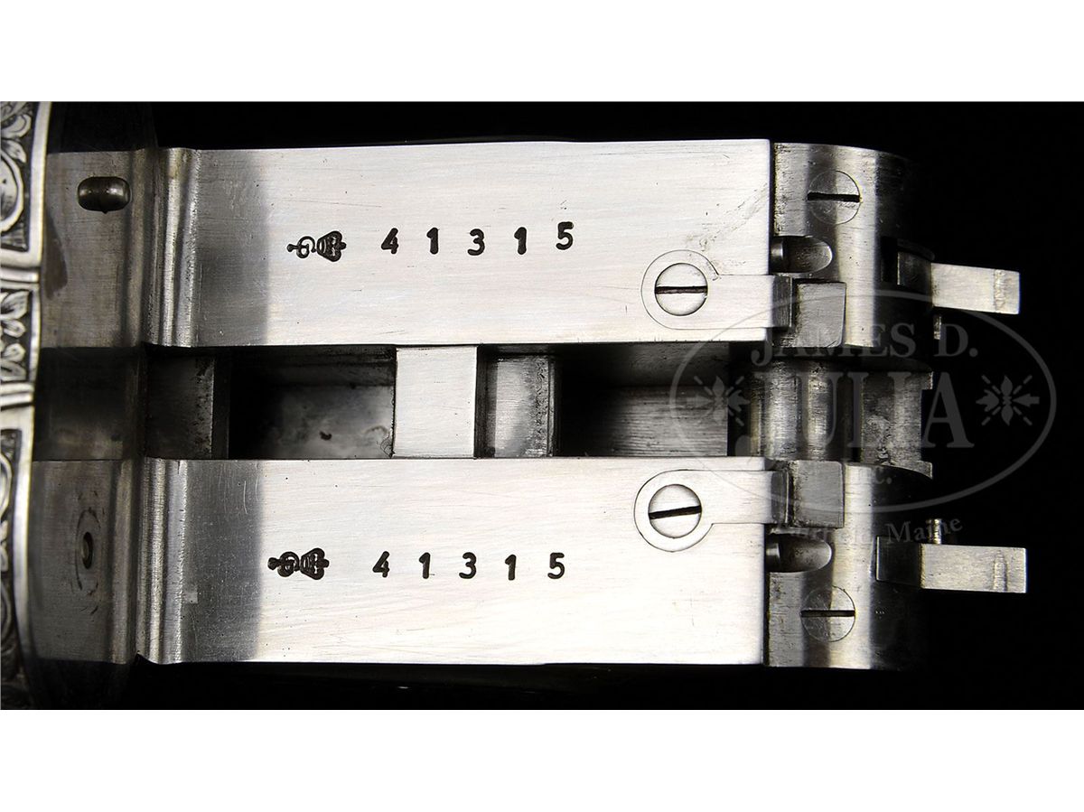 SN 41315. (1997) Cal. 20 ga. 2-3/4" Chambers. 28" Beautifully struck chopper lump bbls are engraved "Holland & Holland" and "Bruton Street. London." on tops. Rear portion of concave game rib is engraved "Model Deluxe". Gun is no. "2" of a pair (number "1" is also in this auction) with "2" gold inlaid on rear of rib, top lever, and forend tip. Bbl flats are stamped with 1997 London nitro proofs. Bottom of rear lump is stamped "H & H NY. NY." Bottoms of bbls are stamped with SN, and fitted with self-opening assist spring. Small coin finished action is nicely filed and features automatic safety (SAFE inlaid in gold), single non-selective trigger, gold band tumbler end cocking indicators, and hand detachable sidelocks. Action and lockplates are engraved with exceptionally well cut, large, shaded, open, scrolled acanthus with strapwork highlights within foliate borders. "Holland & Holland" is in large, scrolled riband on each lockplate. Bottom of action is engraved "Model Deluxe". Small bow single beaded trigger guard is also scroll engraved, and has SN gold inlaid at grip. Well marbled, and nicely figured, flesh-toned European walnut straight grip buttstock measures 14-5/8" over traditional checkered wood butt, and features diamond grip with point pattern checkering and mullered borders, drop points, and a gold oval on toe line engraved "J. W. H". Matching splinter ejector forend has Anson release. Bore diameter: left-.610, right -.610. Bore restrictions: left -.011 (Lt mod), right -.008 (IC). Wall thickness: left -.036, right -.035. Drop at heel: 2", drop at comb: 1-1/4". Weight: 5 lbs. 10 oz. LOP: 14-5/8". Gun is accompanied by 1920's vintage leather two gun motor case with stitched leather corners, lined in green cloth, having black leather gold embossed H & H label in lid, along with gun cleaning information label, and charge card for gun no. "25741". Case contains black morocco wallet with pull through cleaning kit, round H & H marked oil bottle, and a pair of H & H marked snap caps, in covered compartment. Another compartment contains horn handled H & H marked turnscrew. CONDITION: Excellent, showing slight use. Bbls retain 98% orig blue with silvering at muzzles and breech ends, and a few very light marks. Action retains essentially all of its coin finish. Stocks have a few light scratches. There are two somewhat deeper compressions on right side of butt. Bores are excellent. Mechanically crisp. Case leather is darkening, with a few scuffs on edges and corners, some grain lifting. One strap is broken, handle is good. Interior cloth is fine with compressions and areas rubbed through from contact with bbls. Labels are excellent. Paper labels are slightly foxed and soiled. Turnscrew is fine. Other accessories are "as new". 4-49114 MGM309