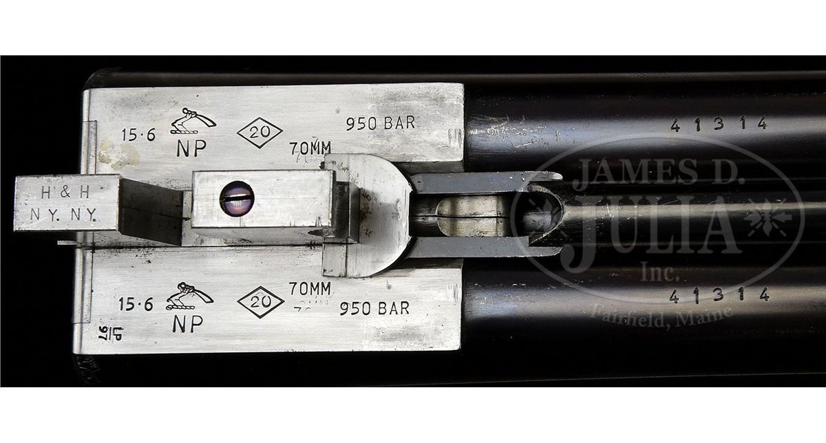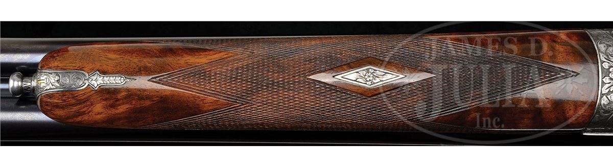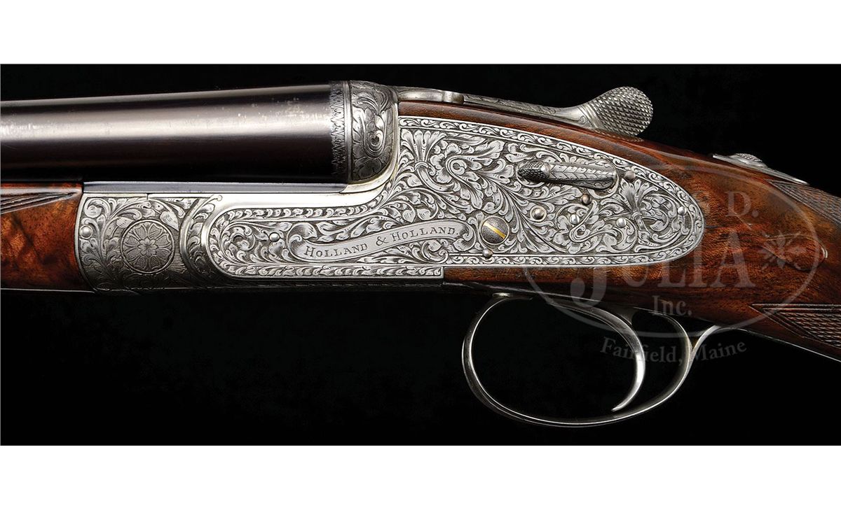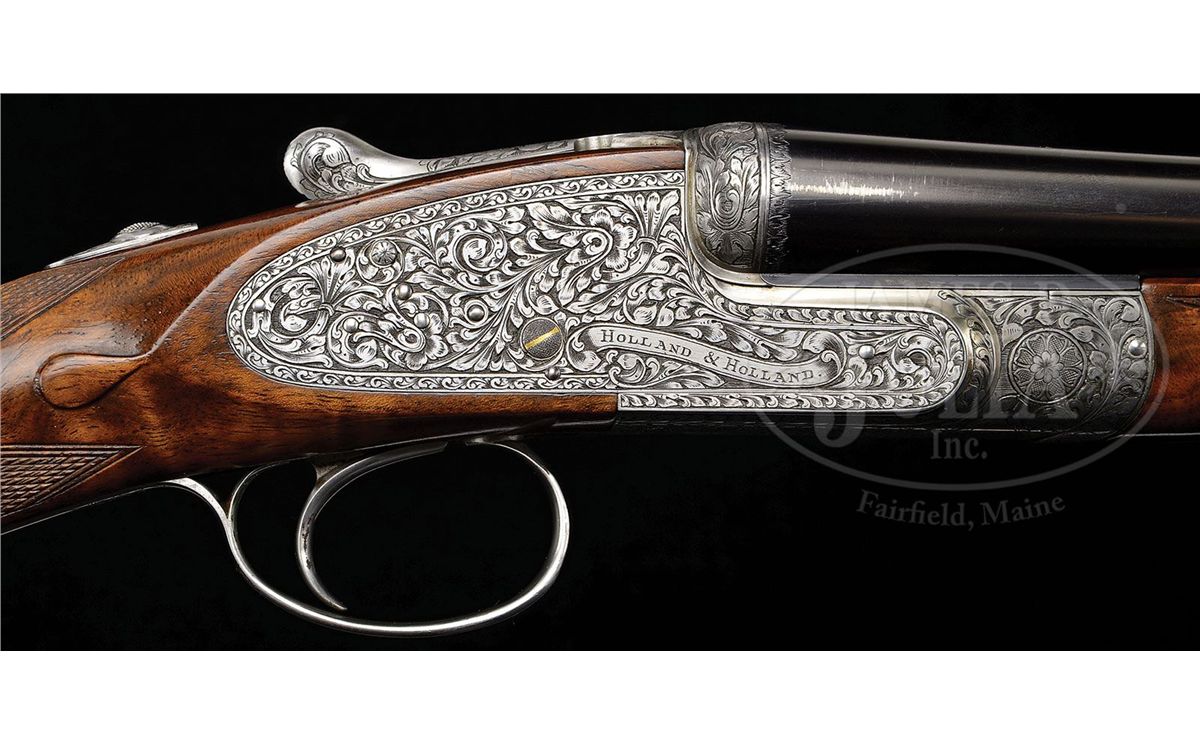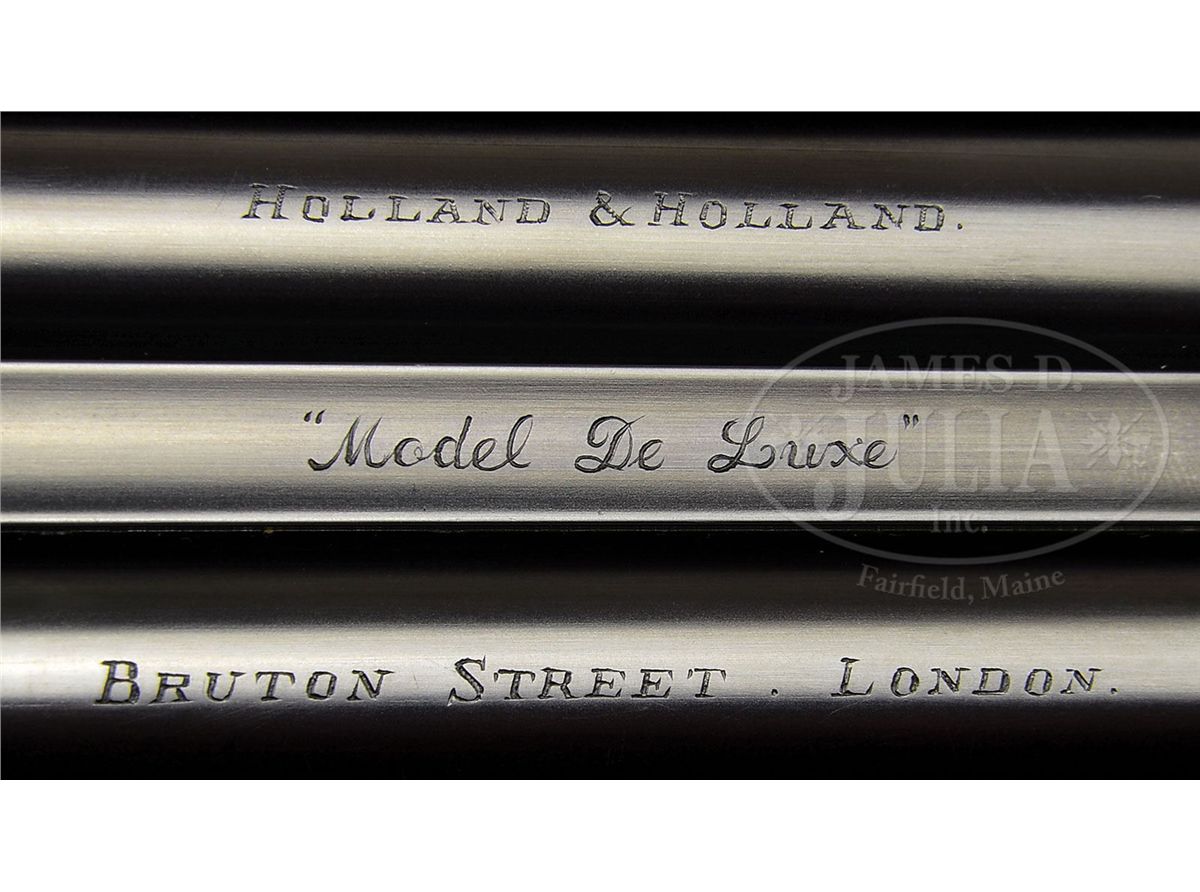 PLEASE NOTE (10-13-13): The original factory casing for this gun is included with this lot. SN 41314. (1997) Cal. 20 ga. 2-3/4" Chambers. 28" Beautifully struck chopper lump bbls are engraved "Holland & Holland" and "Bruton Street. London." on tops. Rear portion of concave game rib is engraved "Model Deluxe". Gun is no. "1" of a pair (number "2" is also in this auction) with "1" gold inlaid on rear of rib, top lever, and forend tip. Bbl flats are stamped with 1997 London nitro proofs. Bottom of rear lump is stamped "H & H NY. NY." Bottoms of bbls are stamped with SN, and fitted with self-opening assist spring. Small coin finished action is nicely filed and features automatic safety (SAFE inlaid in gold), single non-selective trigger, gold band tumbler end cocking indicators, and hand detachable sidelocks. Action and lockplates are engraved with exceptionally well cut, large, shaded, open, scrolled acanthus with strapwork highlights within foliate borders. "Holland & Holland" is in large, scrolled riband on each lockplate. Bottom of action is engraved "Model Deluxe". Small bow. single beaded trigger guard is also scroll engraved, and has SN gold inlaid at grip. Well marbled, and nicely figured, flesh-toned European walnut straight grip buttstock measures 14-5/8" over traditional checkered wood butt, and features diamond grip with point pattern checkering and mullered borders, drop points, and a gold oval on toe line engraved "J. W. H". Matching splinter ejector forend has Anson release. Bore diameter: left-.610, right -.610. Bore restrictions: left -.006 (IC), right -.005 (IC). Wall thickness: left -.036, right -.032. Drop at heel: 1-15/16", drop at comb: 1-1/4". Weight: 5 lbs. 12 oz. LOP: 14-5/8". CONDITION: Excellent, with evidence of much field use. Bbls retain 85 - 90% orig blue, considerably silvered at muzzles, thinning at breech ends, which are also slightly scuffed. Action retains essentially all of its coin finish. Stocks retain nearly all of their orig rubbed oil finish, worn through on sharp edges, and considerably marked and lightly scratched. Bores are excellent. Mechanically crisp. 4-49113 MGM308