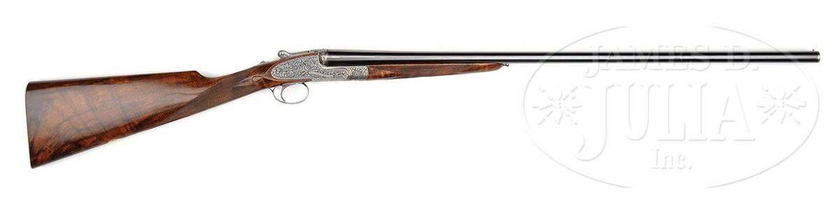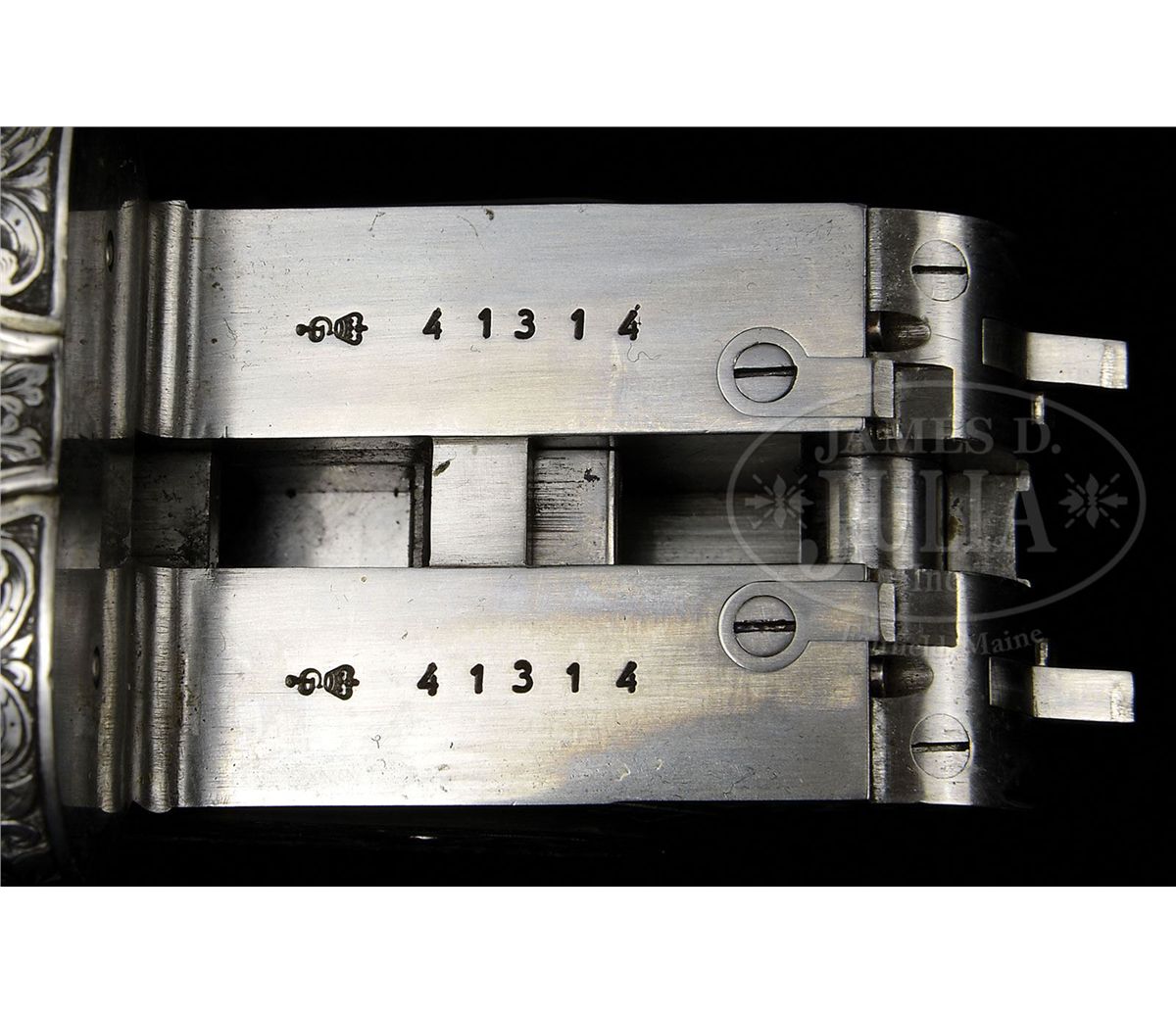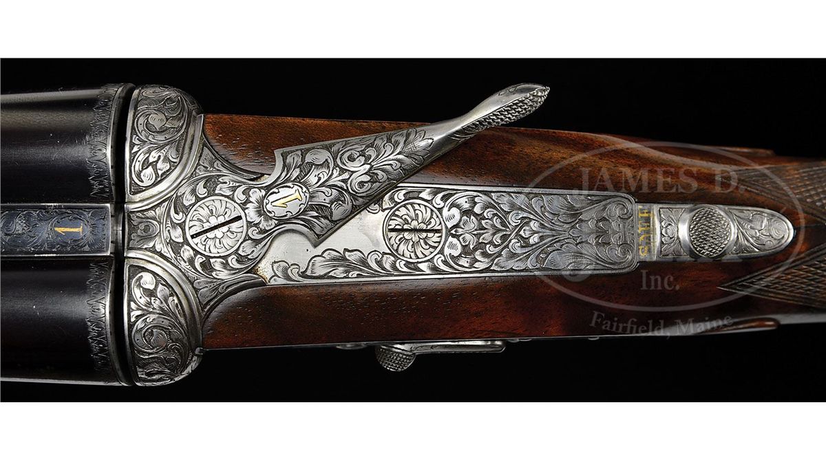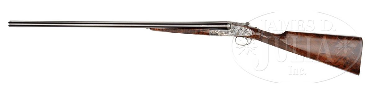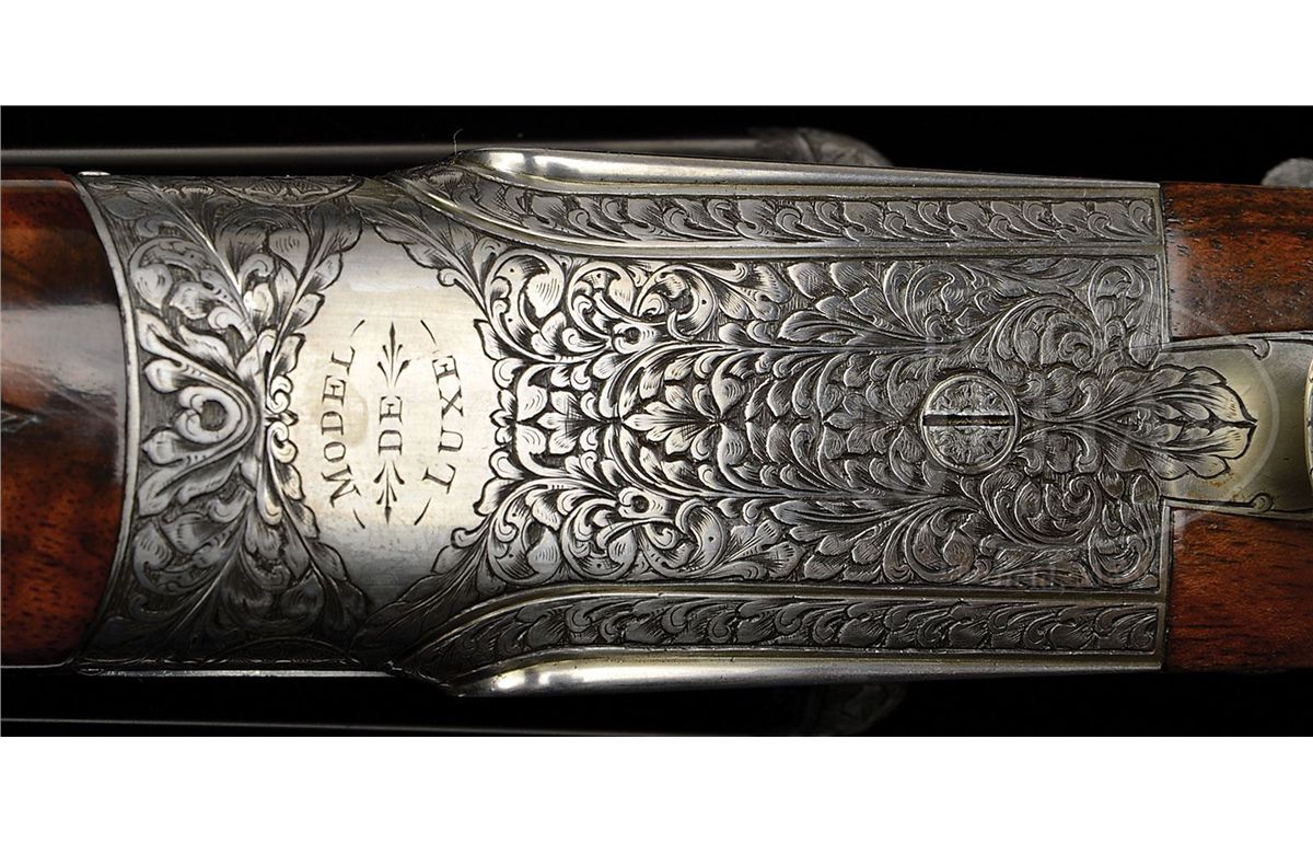 PLEASE NOTE (10-13-13): The original factory casing for this gun is included with this lot. SN 41314. (1997) Cal. 20 ga. 2-3/4" Chambers. 28" Beautifully struck chopper lump bbls are engraved "Holland & Holland" and "Bruton Street. London." on tops. Rear portion of concave game rib is engraved "Model Deluxe". Gun is no. "1" of a pair (number "2" is also in this auction) with "1" gold inlaid on rear of rib, top lever, and forend tip. Bbl flats are stamped with 1997 London nitro proofs. Bottom of rear lump is stamped "H & H NY. NY." Bottoms of bbls are stamped with SN, and fitted with self-opening assist spring. Small coin finished action is nicely filed and features automatic safety (SAFE inlaid in gold), single non-selective trigger, gold band tumbler end cocking indicators, and hand detachable sidelocks. Action and lockplates are engraved with exceptionally well cut, large, shaded, open, scrolled acanthus with strapwork highlights within foliate borders. "Holland & Holland" is in large, scrolled riband on each lockplate. Bottom of action is engraved "Model Deluxe". Small bow. single beaded trigger guard is also scroll engraved, and has SN gold inlaid at grip. Well marbled, and nicely figured, flesh-toned European walnut straight grip buttstock measures 14-5/8" over traditional checkered wood butt, and features diamond grip with point pattern checkering and mullered borders, drop points, and a gold oval on toe line engraved "J. W. H". Matching splinter ejector forend has Anson release. Bore diameter: left-.610, right -.610. Bore restrictions: left -.006 (IC), right -.005 (IC). Wall thickness: left -.036, right -.032. Drop at heel: 1-15/16", drop at comb: 1-1/4". Weight: 5 lbs. 12 oz. LOP: 14-5/8". CONDITION: Excellent, with evidence of much field use. Bbls retain 85 - 90% orig blue, considerably silvered at muzzles, thinning at breech ends, which are also slightly scuffed. Action retains essentially all of its coin finish. Stocks retain nearly all of their orig rubbed oil finish, worn through on sharp edges, and considerably marked and lightly scratched. Bores are excellent. Mechanically crisp. 4-49113 MGM308
