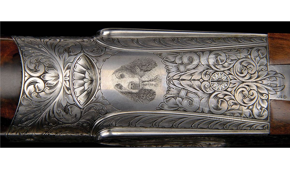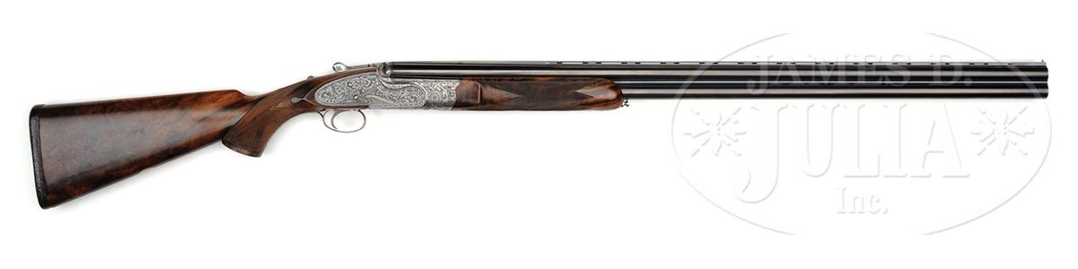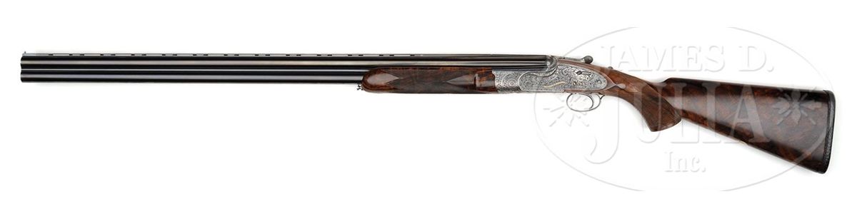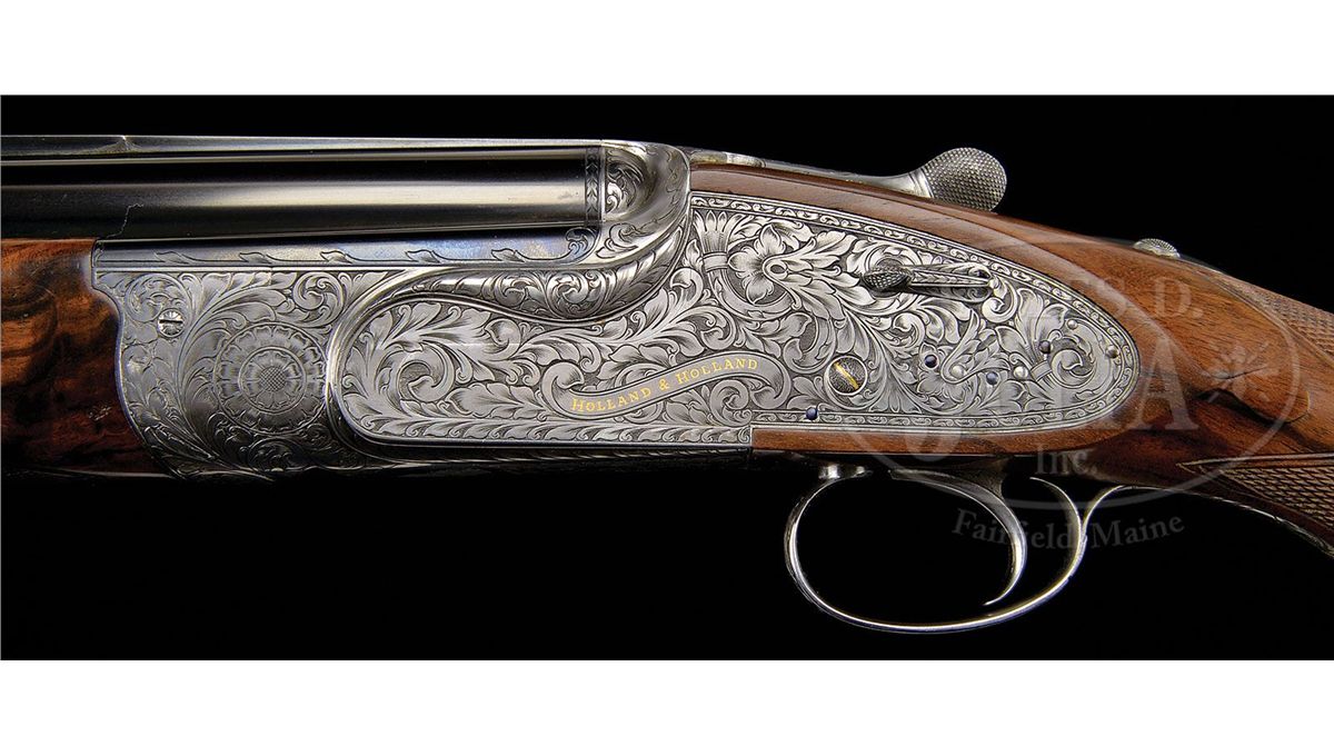 SN 51160. Cal. 12 ga. 2-3/4" Chambers. Finely struck 32" demi-bloc bbls with matted, ventilated rib are engraved "Holland & Holland London" on rear portion of rib. Flat of bottom bbl is stamped with London 2005 nitro proofs for each bbl. SN is stamped on bottom of bottom bbl. Beautifully sculpted, coin finished, low profile, O/U sidelock action is fitted with automatic safety (SAFE inlaid in gold), and single non-selective trigger. Action also features side bolsters, gold line tumbler end cocking indicators, and H & H detachable locks. Action and lockplates are engraved with extremely well cut, large, flowing, open, scrolled acanthus, with nicely shaded backgrounds. "Holland & Holland" is gold inlaid on each lockplate. Bottom of action has Bulino portrait of a spaniel. Engravers initials "A G" are on trigger plate. Small bow, single beaded trigger guard is also scroll engraved, with SN gold inlaid on tang. Superb burl grained, well marbled European walnut full flared pistol grip buttstock is set up for a left hand shooter, with slight palm swell at right grip, slightly cast-on, and with trigger guard bead on left side. Stock also features thin, dark brown leather covered pad, drop points, point pattern checkering with mullered borders and gold oval on toe line engraved "R M". Matching, small, one piece, slightly beavertailed forend has Anson release. Bore diameter: top -.734, bottom -.735. Bore restrictions: Screw chokes. Bbls are fitted with Briley thin wall chokes, 7 tubes are included. Wall thickness: top-.030, bottom -.030. Drop at heel: 2-1/8", drop at comb: 1-3/8". Weight: 8 lbs. 1 oz. LOP: 14-7/8". Gun comes in its orig Holland & Holland embossed black ABS case with three combination locks, lined in green felt, and containing bags for action and bbls. PROVENANCE: Hang tag and choke tubes. CONDITION: Excellent, showing evidence of limited use. Bbls retain nearly all of their orig factory blue, with a hint of silvering on sharp edges of rib. Coin finish of action remains bright. Stocks retain nearly all of their orig finish, with a few light handling marks, mostly on forend. Bores are excellent. Action is tight. Ejectors are in time. Trigger works. Case is very fine, with a few scuffs on exterior. Interior cloth is fine. Bbl partition is broken away at one end. Bags are fine, lightly soiled. This would make a great sporting clays gun. 4-49362 MGM261