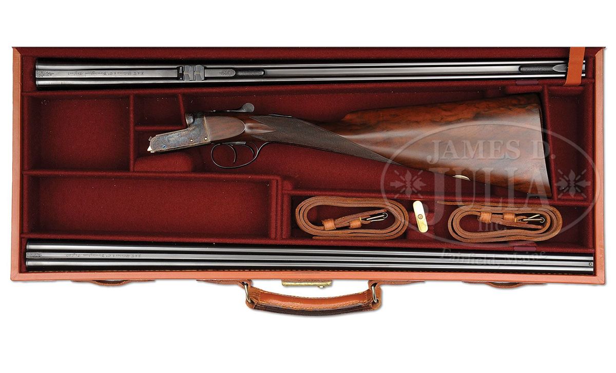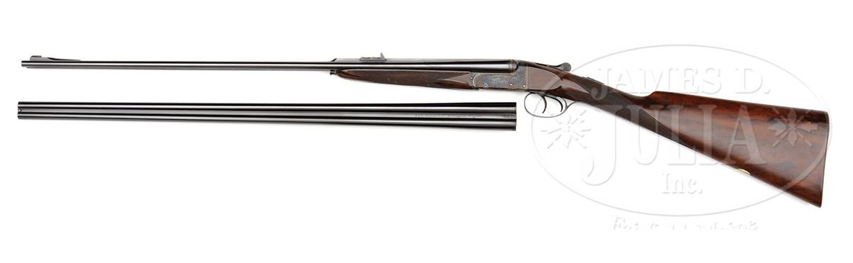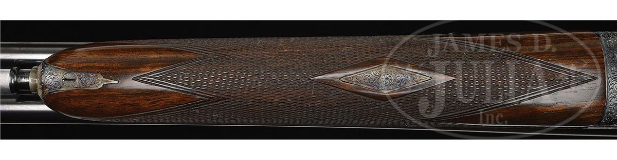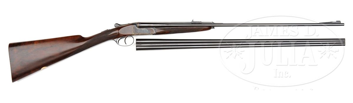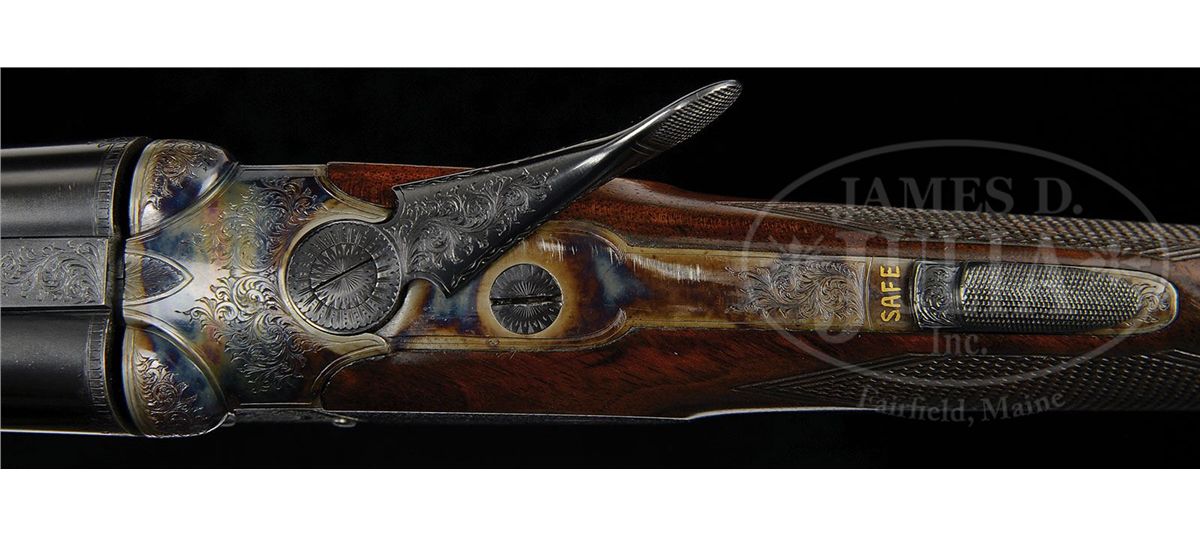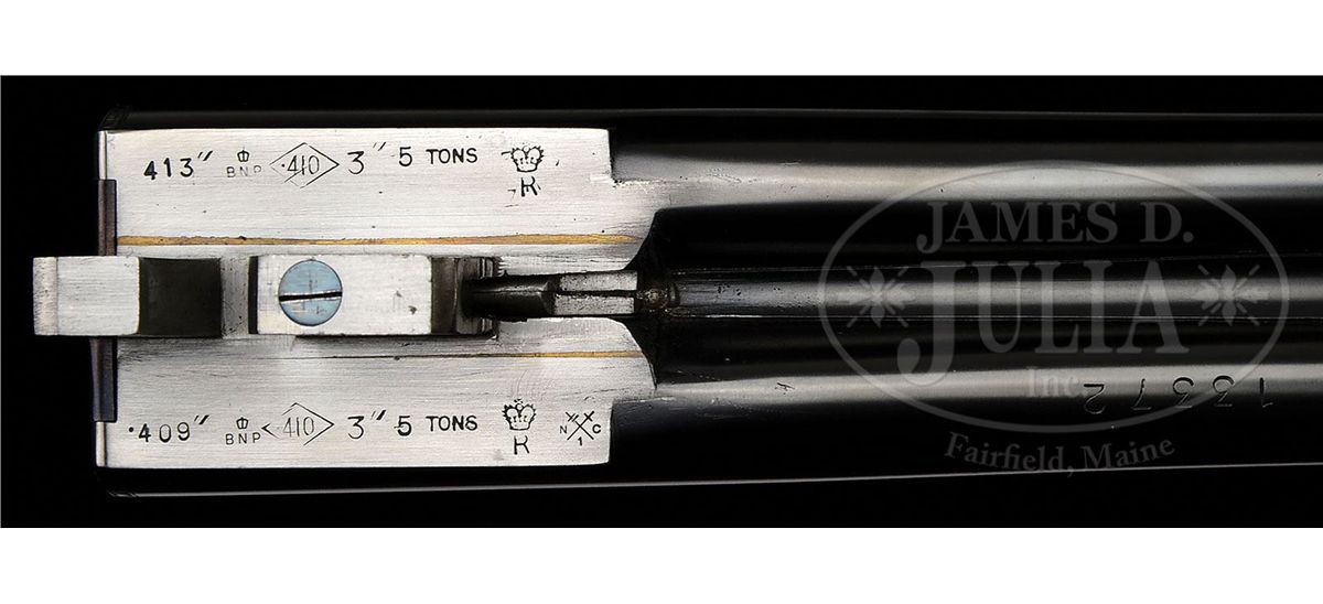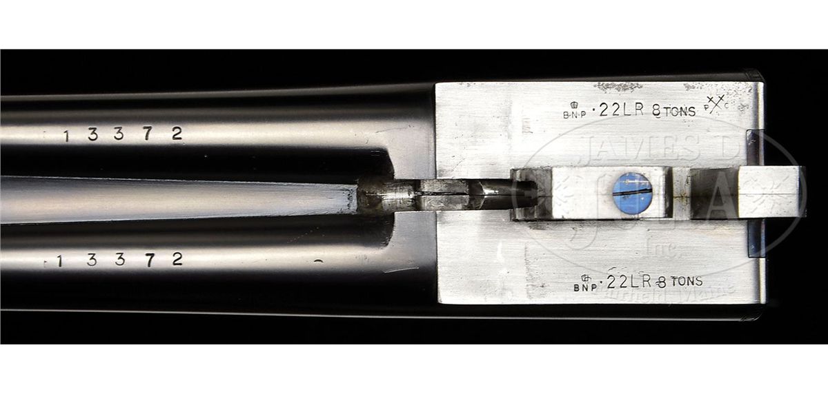 SN 13372. (1989 and 1987) Cal. 22 LR and .410. 25-1/2" Chopper lump double rifle bbls fitted with quarter rib and matching ramp front sight base are engraved "J & L Wilkins & Co. Birmingham England." on top of quarter rib, which is fitted with one standing, two folding gold line leaf express sight. Standing leaf is marked for 40 yards. Gold bead front sight is longitudinally dovetailed into ramp base. Bbl flats are stamped with 1989 Birmingham nitro proofs. SNs are on bottom of bbls. 26" Dovetailed .410 bbls are marked with makers name and address on narrow, concave game rib. Bbl flats are stamped with 1987 Birmingham re-proofs for 3" chambers. Tiny case hardened boxlock action features automatic safety (SAFE inlaid in gold), gold washed internals, and double triggers. Action is engraved with very well cut medium scroll framing vignettes of antlered game; a standing roebuck and doe on left, and a recumbent roebuck with standing doe on right. "J & L Wilkins" is in arched riband toward rear of each side of action. Scroll engraved top lever, floorplate, and trigger guard are blued. Fine European walnut straight grip stock with smoky marbling, measures 14-1/2" over checkered wood butt, and features side panels, flat top point pattern checkering, and a vacant silver oval on toe line. Shared matching splinter ejector forend has Anson release. Rifle Bbls: Drop at heel: approx 3", drop at comb: approx 1-7/8". Weight: 5 lbs. 1 oz. LOP: 14-1/2". .410 Bbls: Bore diameter at muzzles: left-.392, right -.402. Wall thickness: left -.023, right -.021. Drop at heel: 2-3/4", drop at comb: 1-5/8". Weight: 4 lbs. 1 oz. LOP: 14-1/2". Brady leather case with stitched leather corners has central brass medallion on lid. Case is lined in burgundy cloth, and has space for action and both sets of bbls. Case contains outer security straps and two keys. CONDITION: Excellent, near new. Metal parts retain essentially all of their highest quality finishes. Appears nearly unfired. Stocks have only a few very minor marks and nicks in their rubbed oil finish. Bores are excellent. Action is tight with both sets of bbls. Ejectors are in time. Case leather is excellent with one or two minor scuffs. Interior cloth is excellent with compressions from sights of rifle bbl. A really neat petite combination treat. 4-48991 MGM190