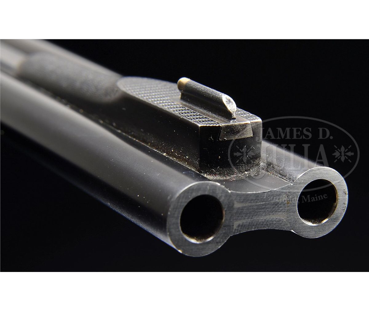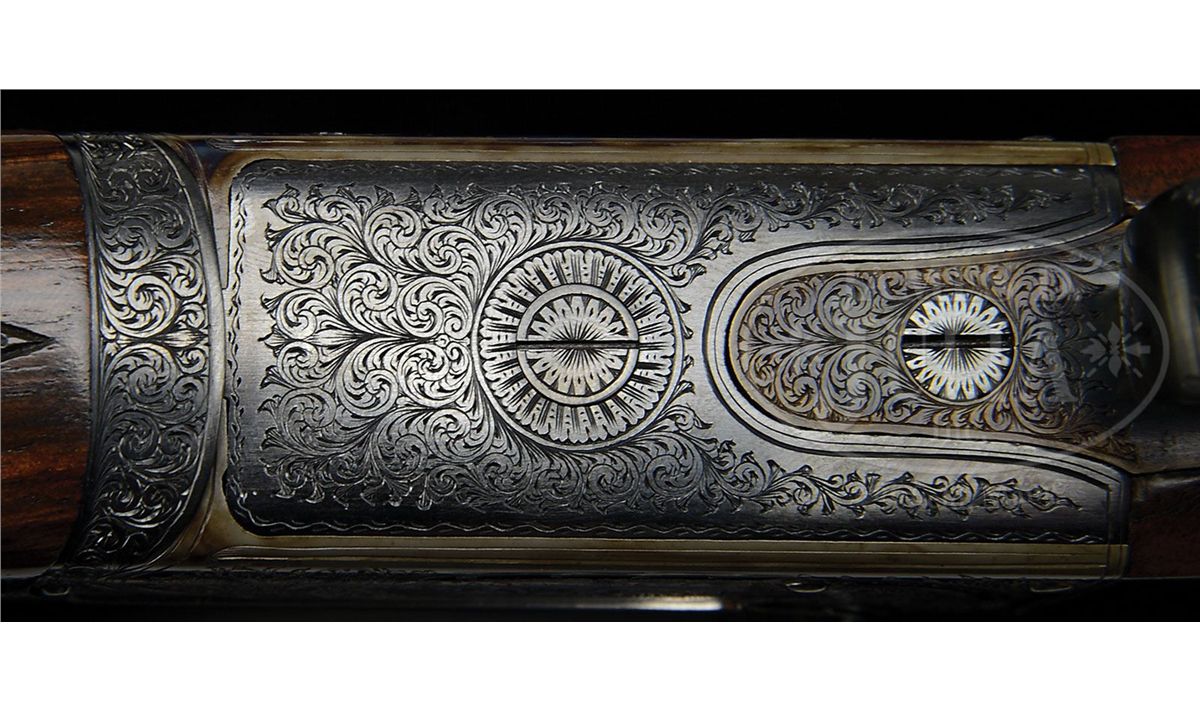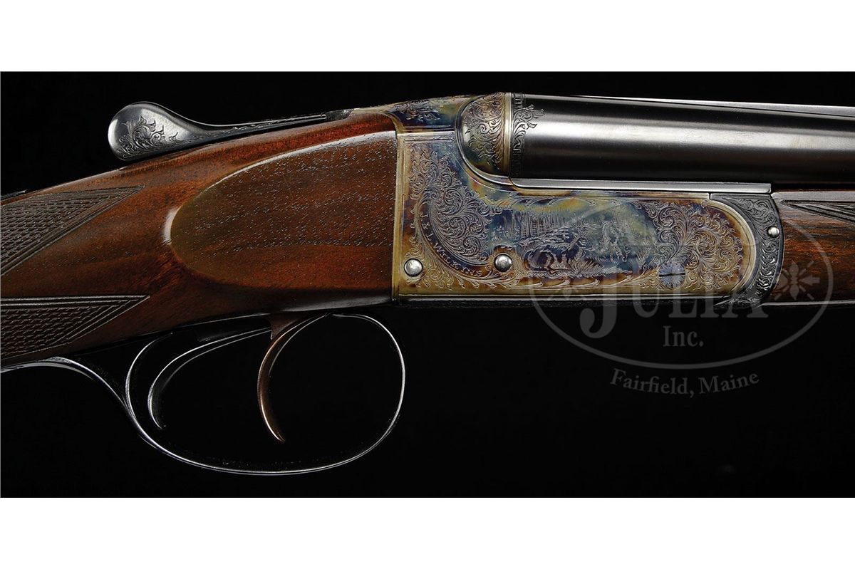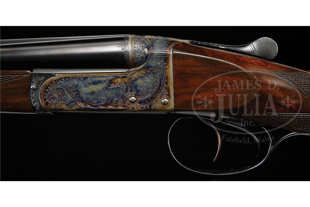 SN 13372. (1989 and 1987) Cal. 22 LR and .410. 25-1/2" Chopper lump double rifle bbls fitted with quarter rib and matching ramp front sight base are engraved "J & L Wilkins & Co. Birmingham England." on top of quarter rib, which is fitted with one standing, two folding gold line leaf express sight. Standing leaf is marked for 40 yards. Gold bead front sight is longitudinally dovetailed into ramp base. Bbl flats are stamped with 1989 Birmingham nitro proofs. SNs are on bottom of bbls. 26" Dovetailed .410 bbls are marked with makers name and address on narrow, concave game rib. Bbl flats are stamped with 1987 Birmingham re-proofs for 3" chambers. Tiny case hardened boxlock action features automatic safety (SAFE inlaid in gold), gold washed internals, and double triggers. Action is engraved with very well cut medium scroll framing vignettes of antlered game; a standing roebuck and doe on left, and a recumbent roebuck with standing doe on right. "J & L Wilkins" is in arched riband toward rear of each side of action. Scroll engraved top lever, floorplate, and trigger guard are blued. Fine European walnut straight grip stock with smoky marbling, measures 14-1/2" over checkered wood butt, and features side panels, flat top point pattern checkering, and a vacant silver oval on toe line. Shared matching splinter ejector forend has Anson release. Rifle Bbls: Drop at heel: approx 3", drop at comb: approx 1-7/8". Weight: 5 lbs. 1 oz. LOP: 14-1/2". .410 Bbls: Bore diameter at muzzles: left-.392, right -.402. Wall thickness: left -.023, right -.021. Drop at heel: 2-3/4", drop at comb: 1-5/8". Weight: 4 lbs. 1 oz. LOP: 14-1/2". Brady leather case with stitched leather corners has central brass medallion on lid. Case is lined in burgundy cloth, and has space for action and both sets of bbls. Case contains outer security straps and two keys. CONDITION: Excellent, near new. Metal parts retain essentially all of their highest quality finishes. Appears nearly unfired. Stocks have only a few very minor marks and nicks in their rubbed oil finish. Bores are excellent. Action is tight with both sets of bbls. Ejectors are in time. Case leather is excellent with one or two minor scuffs. Interior cloth is excellent with compressions from sights of rifle bbl. A really neat petite combination treat. 4-48991 MGM190