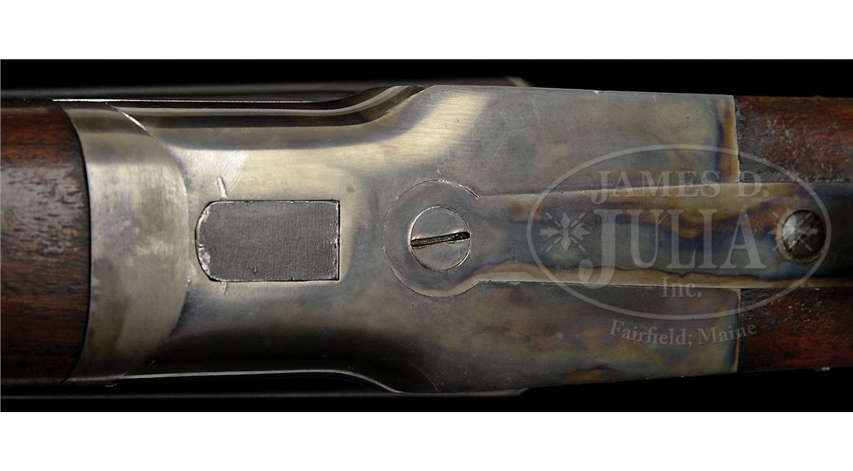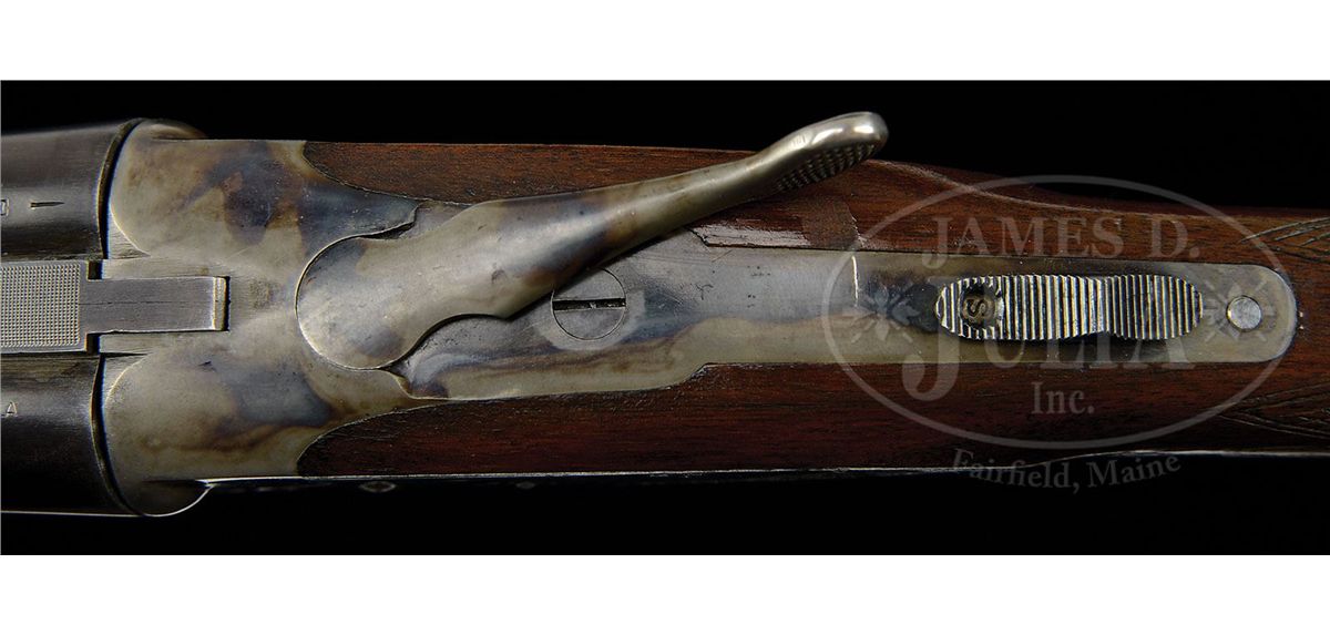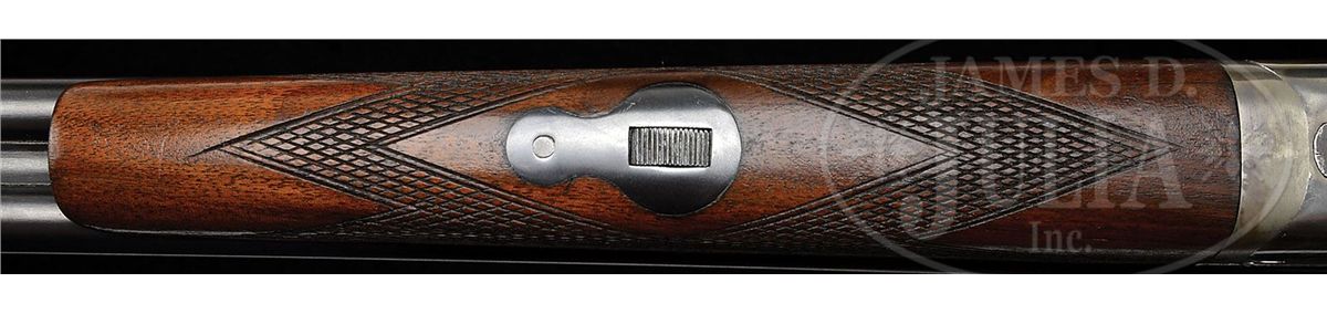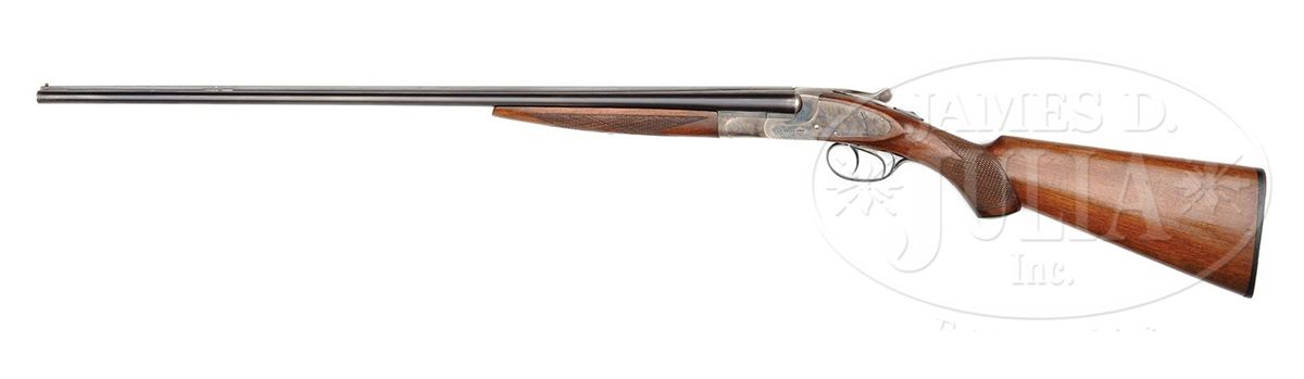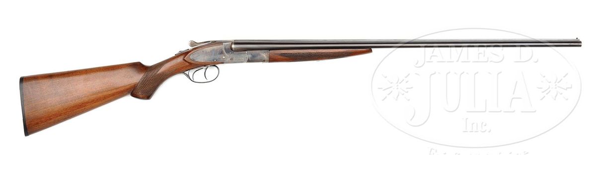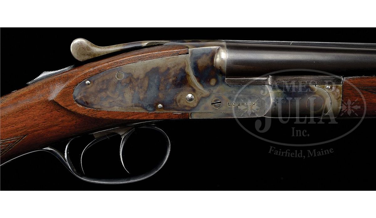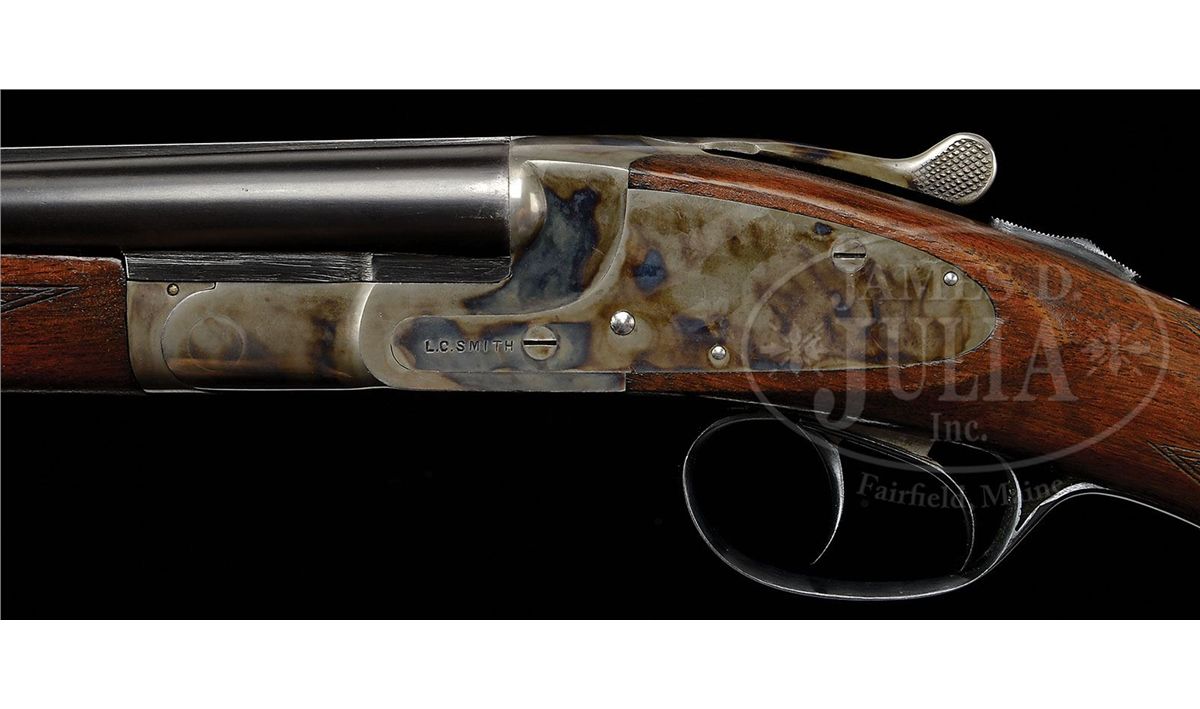 SN FWE110239. Cal. .410. 3" Chambers. 26" Bbls have raised, flat, matted rib and standard Hunter Arms Co. markings and grade on tops. Bbl flats are stamped with SN, Hunter proofs, and grade; bottoms of bbls "Armor Steel". Small, case hardened, unadorned action features non-automatic safety and double triggers. "L. C. SMITH" is on each lockplate. Plain American walnut capped and coarsely checkered pistol grip buttstock measures 14" over ribbed buttplate. Matching splinter ejector forend has typical J-spring and secondary knurled latch release in guitar shaped escutcheon. Bore diameter at muzzles: left-.384, right -.394. Drop at heel: 2-3/4", drop at comb: 1-3/4". Weight: 5 lbs. 10 oz. LOP: 14". CONDITION: Excellent. Bbls retain approx 95% orig blue, thinning slightly overall, silvered on sides at rear and at muzzles, with some solder showing on left side of rib 6" back from muzzles. Action and lockplates retain most of their orig color, fading somewhat overall. There is some slight freckling on right lockplate. Blue on triggers, trigger guard, and forend escutcheon, is bright. Stocks retain most of their orig finish, crazed and lifted slightly overall. Bores are excellent. Action is tight. Ejectors are in time. 4-49105 MGM296