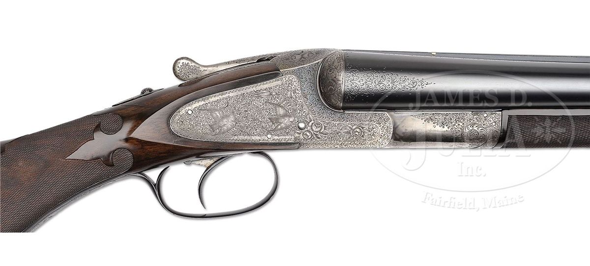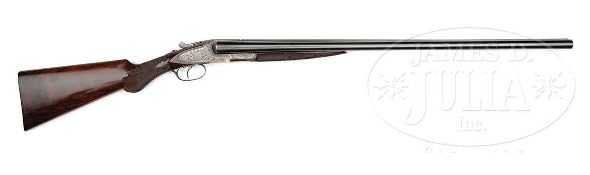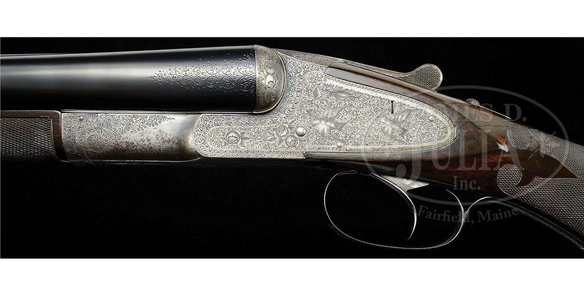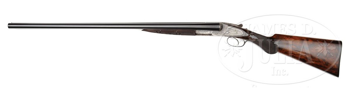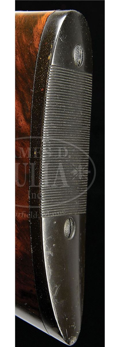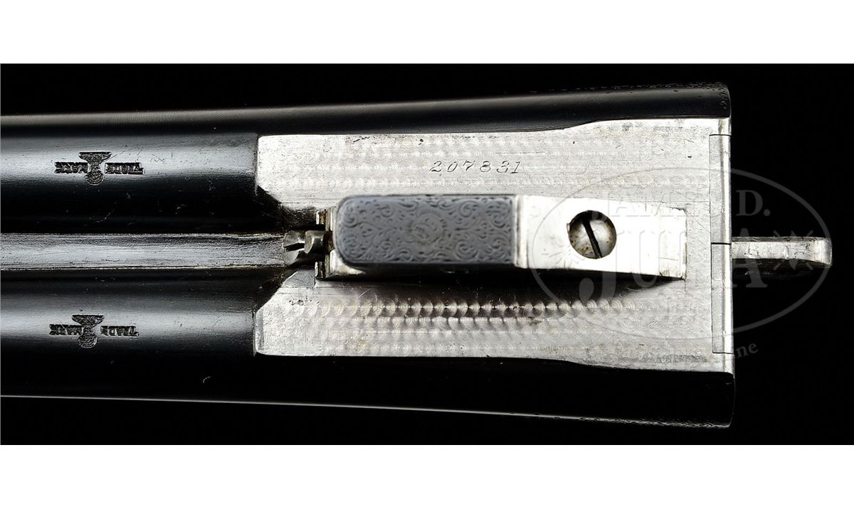 SN 207831. Cal. 12 ga. 2-3/4" Chambers. 30" Bbls with slightly raised, matted, concave rib are engraved on tops "SIR JOSEPH WHITWORTH FLUID COMPRESSED STEEL" and "MADE TO ORDER BY THE Hunter Arms Co FULTON, N.Y." (Rib extension is unmarked.) Bbl flats are engine turned and have SN engraved. Bottoms of bbls are deeply struck with Whitworth sheaf of wheat trademarks. Regular weight action is engraved with patent dates and SN on water table, has well filed beads around fences, and features non-automatic safety and "Hunter One Trigger". Action is engraved with about 80% coverage small scroll with rose highlights on front of lockplates, fences, and top of action, as well as bottom, where they are above and below a flying duck. Lockplates each have a pair of pigeons flying through scroll, and with "L. C. Smith" at bottoms. Trigger guard has matching scroll and roses, with SN at grip. Very fine stump figured and marbled European walnut semi-pistol grip buttstock measures 14-3/8" over ribbed composition buttplate. Borderless 30 LPI checkering has fleur-di-lis piercing fancy bordered pattern, with ribbons through at knob. A gold oval at top near heel is engraved "R. M. E." Matching splinter ejector forend has near full checkering with fleur-di-lis ribbons through pattern, inset ebony tip, banjo shaped secondary release escutcheon, and with ejector patent information engraved on iron. Bore diameter: left-.727, right -.726. Bore restrictions: left -.032 (Full), right -.011 (IC). Wall thickness: left -.033, right -.033. Drop at heel: 2-5/8", drop at comb: 1-5/8". Weight: 7 lbs. 12 oz. LOP: 14-3/8". PROVENANCE: Cody Museum records stating finished inspection was Mar 23, 1907. CONDITION: Very fine, as partially refinished. Bbls retain nearly all of a fine quality rust blue, engraving still clear. Action retains most of its orig case hardening color which doesn't appear to have ever really been bright. Bottom of action is silvered with some brown spotting. Tails of lockplates and top tang are also silver to brown. Trigger guard has been re-blued, and retains nearly all of that blue. Stocks have been nicely refinished with gloss oil, and have a few light subsequent marks. Checkering has been expertly re-cut. There is a repaired crack around entire top of action area running from the rear of one lockplate around to the other, does not flex. Bores are excellent, with some slight frosting. Action is tight. Ejectors are in time. Trigger works. A total of 266 Monogram grade guns were made between 1890 and 1945. It was always a high grade custom order gun, and the only L. C. Smith grade that the designation never changed from beginning of production to end. 4-49270 MGM136