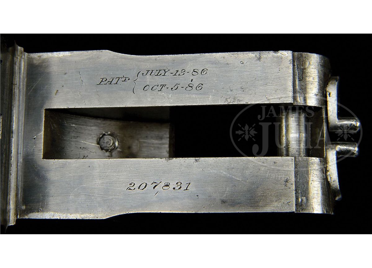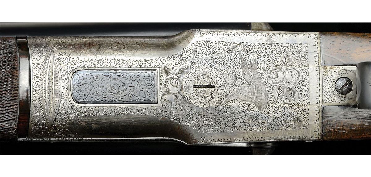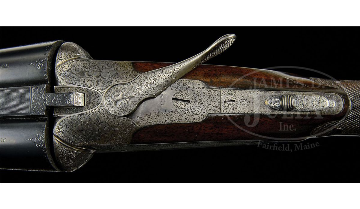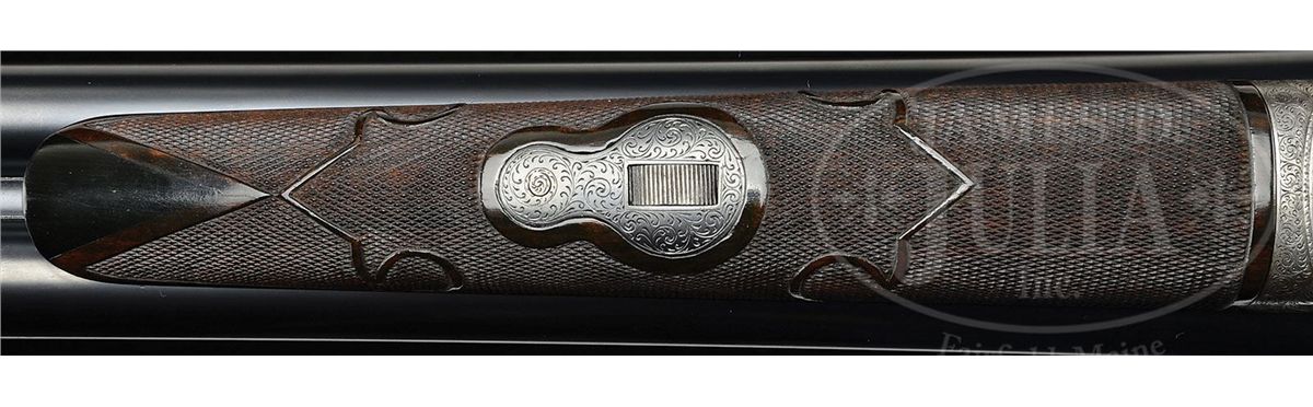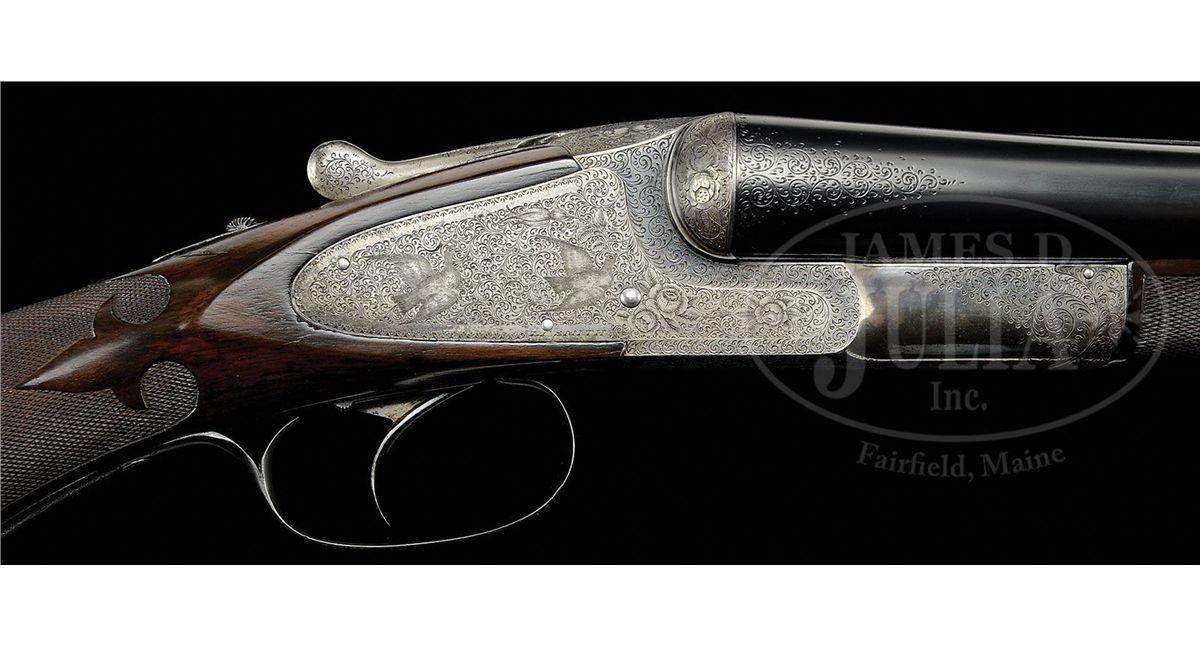 SN 207831. Cal. 12 ga. 2-3/4" Chambers. 30" Bbls with slightly raised, matted, concave rib are engraved on tops "SIR JOSEPH WHITWORTH FLUID COMPRESSED STEEL" and "MADE TO ORDER BY THE Hunter Arms Co FULTON, N.Y." (Rib extension is unmarked.) Bbl flats are engine turned and have SN engraved. Bottoms of bbls are deeply struck with Whitworth sheaf of wheat trademarks. Regular weight action is engraved with patent dates and SN on water table, has well filed beads around fences, and features non-automatic safety and "Hunter One Trigger". Action is engraved with about 80% coverage small scroll with rose highlights on front of lockplates, fences, and top of action, as well as bottom, where they are above and below a flying duck. Lockplates each have a pair of pigeons flying through scroll, and with "L. C. Smith" at bottoms. Trigger guard has matching scroll and roses, with SN at grip. Very fine stump figured and marbled European walnut semi-pistol grip buttstock measures 14-3/8" over ribbed composition buttplate. Borderless 30 LPI checkering has fleur-di-lis piercing fancy bordered pattern, with ribbons through at knob. A gold oval at top near heel is engraved "R. M. E." Matching splinter ejector forend has near full checkering with fleur-di-lis ribbons through pattern, inset ebony tip, banjo shaped secondary release escutcheon, and with ejector patent information engraved on iron. Bore diameter: left-.727, right -.726. Bore restrictions: left -.032 (Full), right -.011 (IC). Wall thickness: left -.033, right -.033. Drop at heel: 2-5/8", drop at comb: 1-5/8". Weight: 7 lbs. 12 oz. LOP: 14-3/8". PROVENANCE: Cody Museum records stating finished inspection was Mar 23, 1907. CONDITION: Very fine, as partially refinished. Bbls retain nearly all of a fine quality rust blue, engraving still clear. Action retains most of its orig case hardening color which doesn't appear to have ever really been bright. Bottom of action is silvered with some brown spotting. Tails of lockplates and top tang are also silver to brown. Trigger guard has been re-blued, and retains nearly all of that blue. Stocks have been nicely refinished with gloss oil, and have a few light subsequent marks. Checkering has been expertly re-cut. There is a repaired crack around entire top of action area running from the rear of one lockplate around to the other, does not flex. Bores are excellent, with some slight frosting. Action is tight. Ejectors are in time. Trigger works. A total of 266 Monogram grade guns were made between 1890 and 1945. It was always a high grade custom order gun, and the only L. C. Smith grade that the designation never changed from beginning of production to end. 4-49270 MGM136