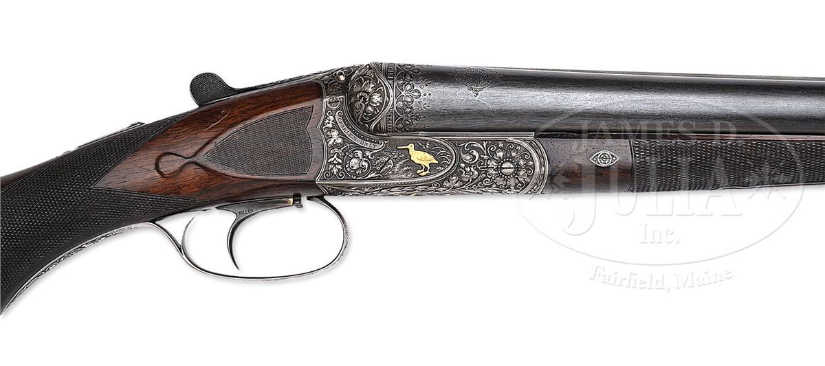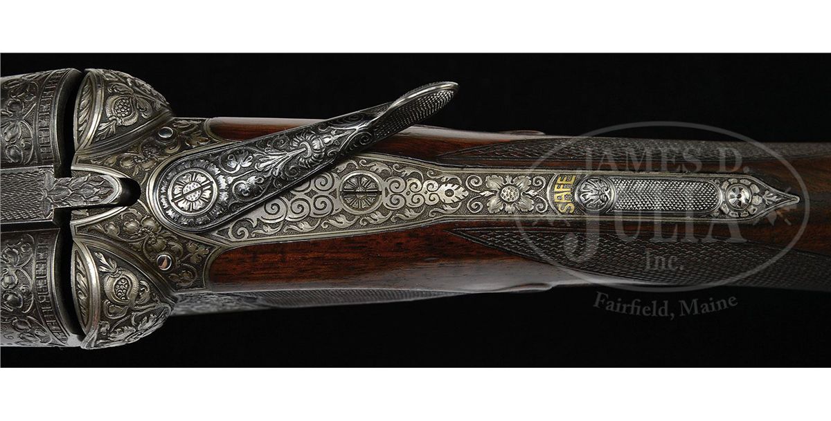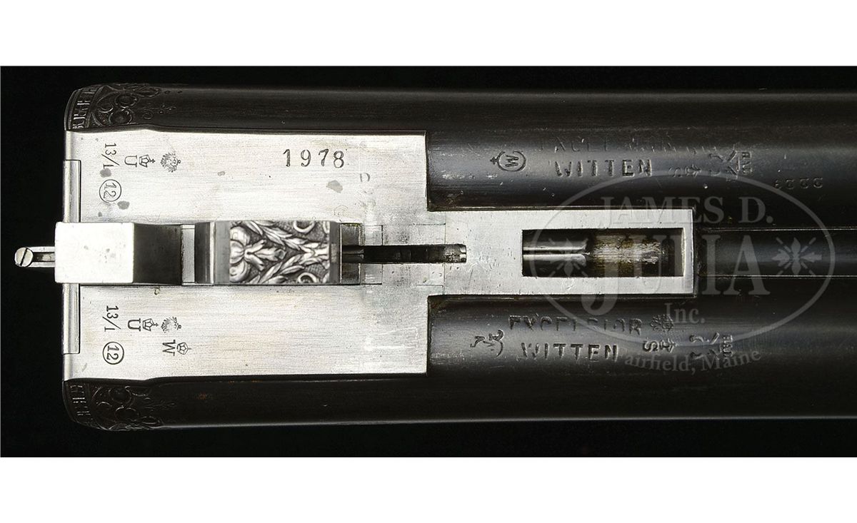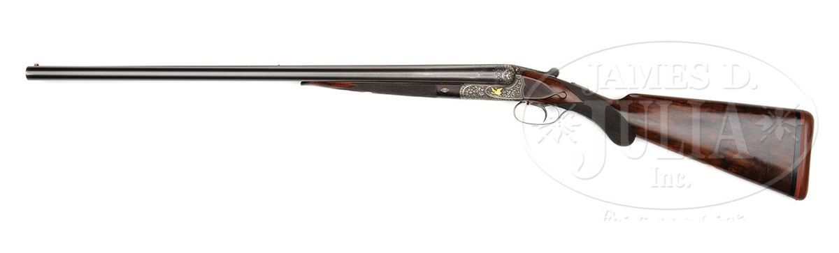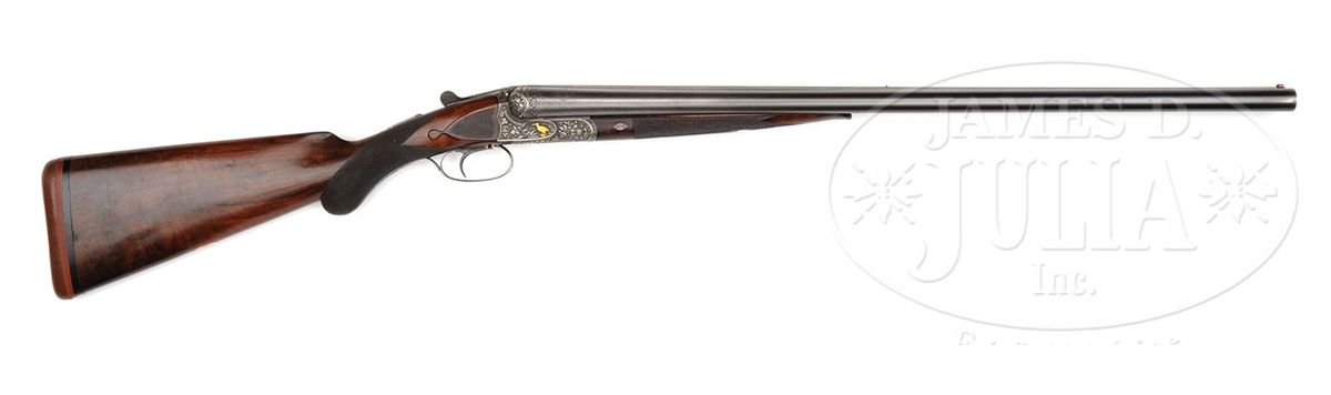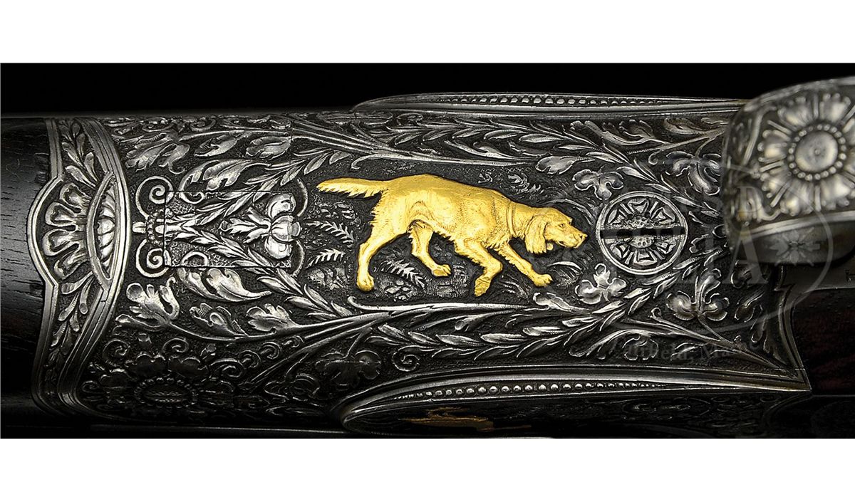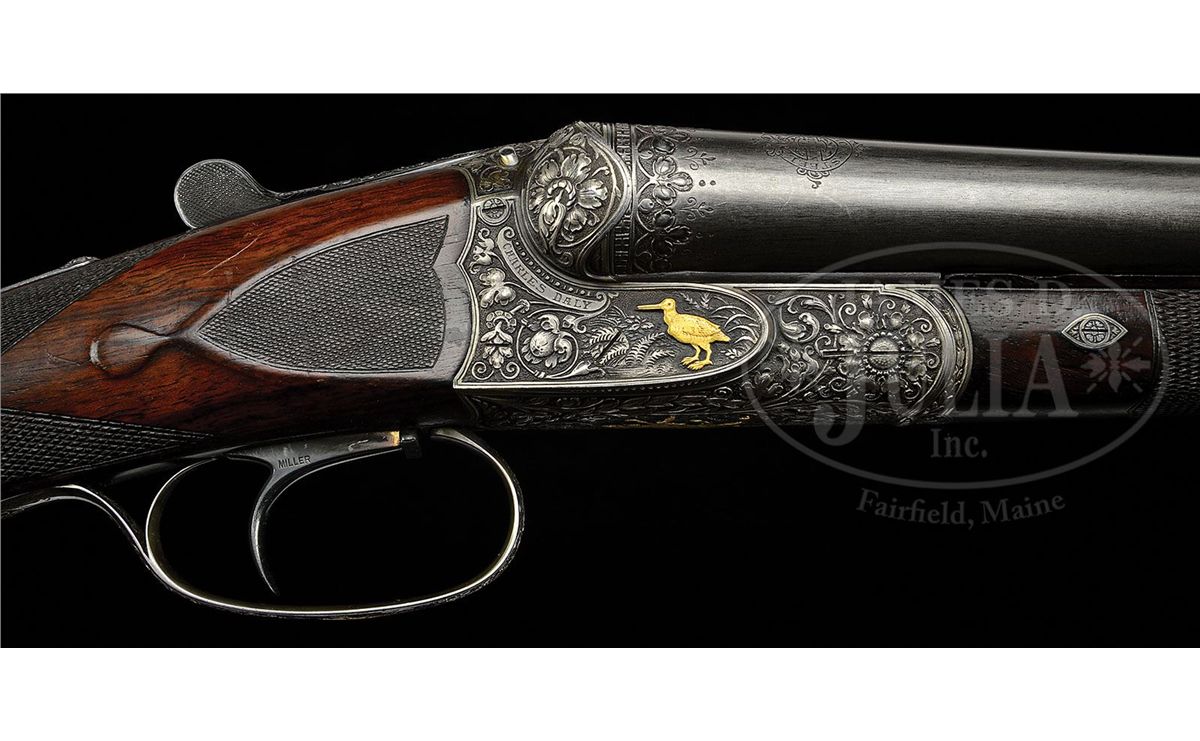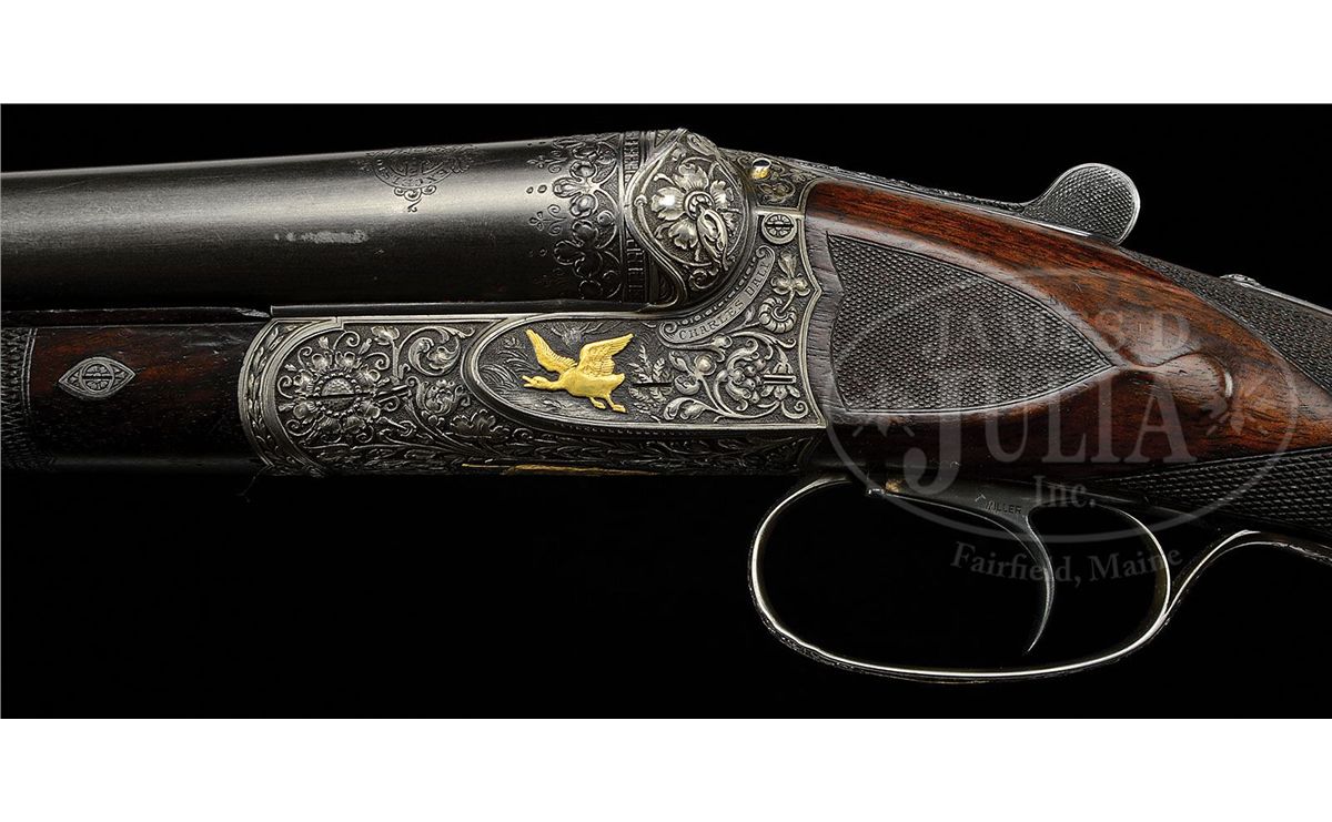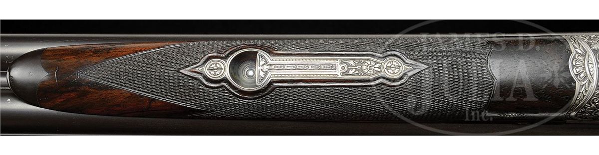 SN 1978. Cal. 12 ga. 2-3/4" Chambers. 26" Dovetailed bbls are inlaid in gold "Charles Daly Diamond Quality" on unmatted portion of high, concave, game rib mounted with red, Bradley type front, and mid bead. Breech ends of bbls have bands of deep relief, geometric, and trefoil engraving surmounted by Witten Excelsior Steel logos. Bbl flats are stamped with German imperial proofs, bottoms of bbls with Witten steel information, and crossed pistol logos surmounted by "HAL" (Lindner). Scallop-backed boxlock action has been fitted with Miller selective single trigger, and features side clips, square crossbolt third fastener, cocking indicators, and non-automatic safety (SAFE inlaid in gold). Action is engraved with truly exceptional, full relief, open, scrolled acanthus with large, floral highlights on fences. Leaves and tendrils are very well cut and give dramatic background to relief gold inlays of dog and game birds, with duck on left, snipe on right, and pointing setter on bottom. "Charles Daly" is in arched ribands on each side of action behind fences. A standing cock pheasant is on trigger guard bow. Well marbled and lightly figured European walnut round knob semi-pistol grip buttstock measures 14-1/2" over leather-covered Silver type pad over 1-1/4" nicely matching extension (12-1/8" from single trigger to extension). Stock features checkered side panels with short drop points, point pattern checkering, and a gold oval on toe line engraved "G. P." Matching splinter ejector forend has scalloped hard rubber tip, and Deeley release. An Abercrombie & Fitch green hang tag is affixed to trigger guard outlining specifications of this gun. Bore diameter: left-.725, right -.730. Bore restrictions: left -.018 (Mod), right -.008 (IC). Wall thickness: left -.022, right -.020. Drop at heel: 2-9/16", drop at comb: 1-5/8". Weight: 5 lbs. 9 oz. LOP: 14-1/2". CONDITION: Very fine, as found. Bbls retain 75 - 80% of what appears to be orig blue, considerably silvered at normal carry and wear points, around forend and action, as well as muzzles. Action retains a considerable amount of its orig case hardening color, high points of engraving beautifully silvered, giving fine effect. High points of gold inlays show some wear. Stocks retain most of an old rubbed oil finish, worn through on forend from normal handling and wear, checkering somewhat worn. Horn button at tip of grip is missing, and is replaced by a piece of walnut (?). Action is tight. Right bbl is slightly off face. Bores are excellent. Ejectors are strong and in time, trigger works. Hang tag is excellent, with some slight creases. A well balanced, fast handling, very attractive, gun. 4-47866 MGM50