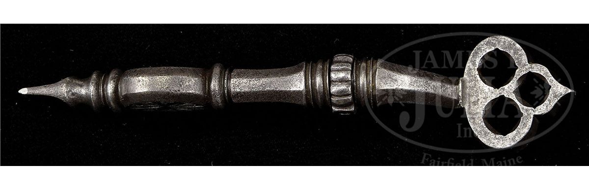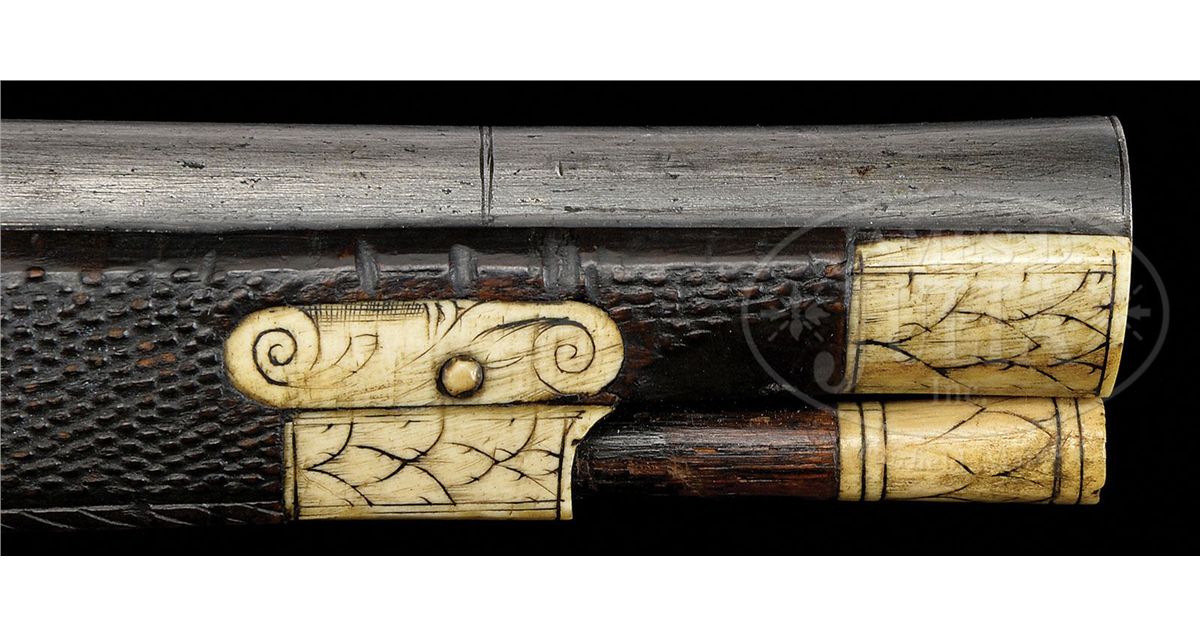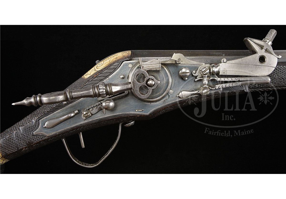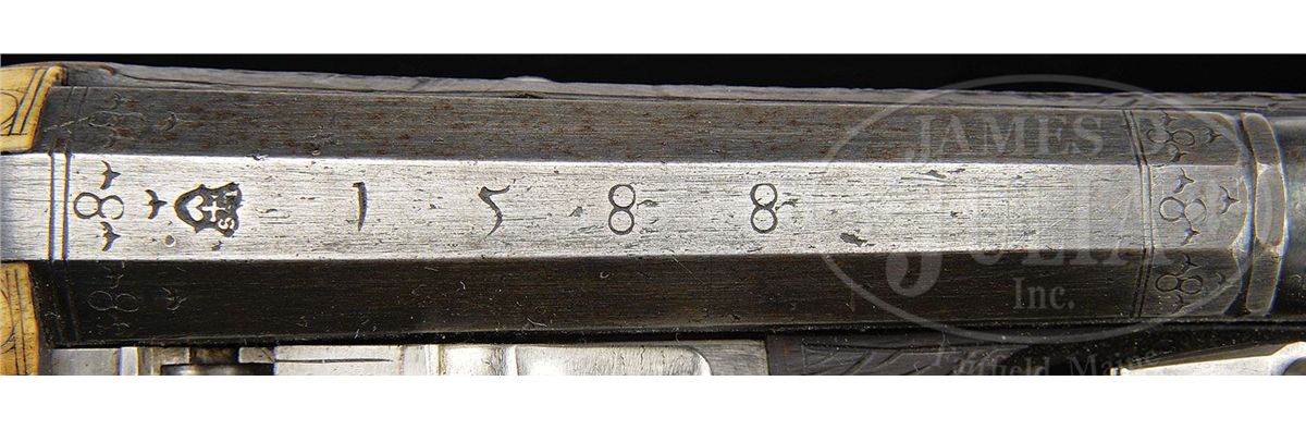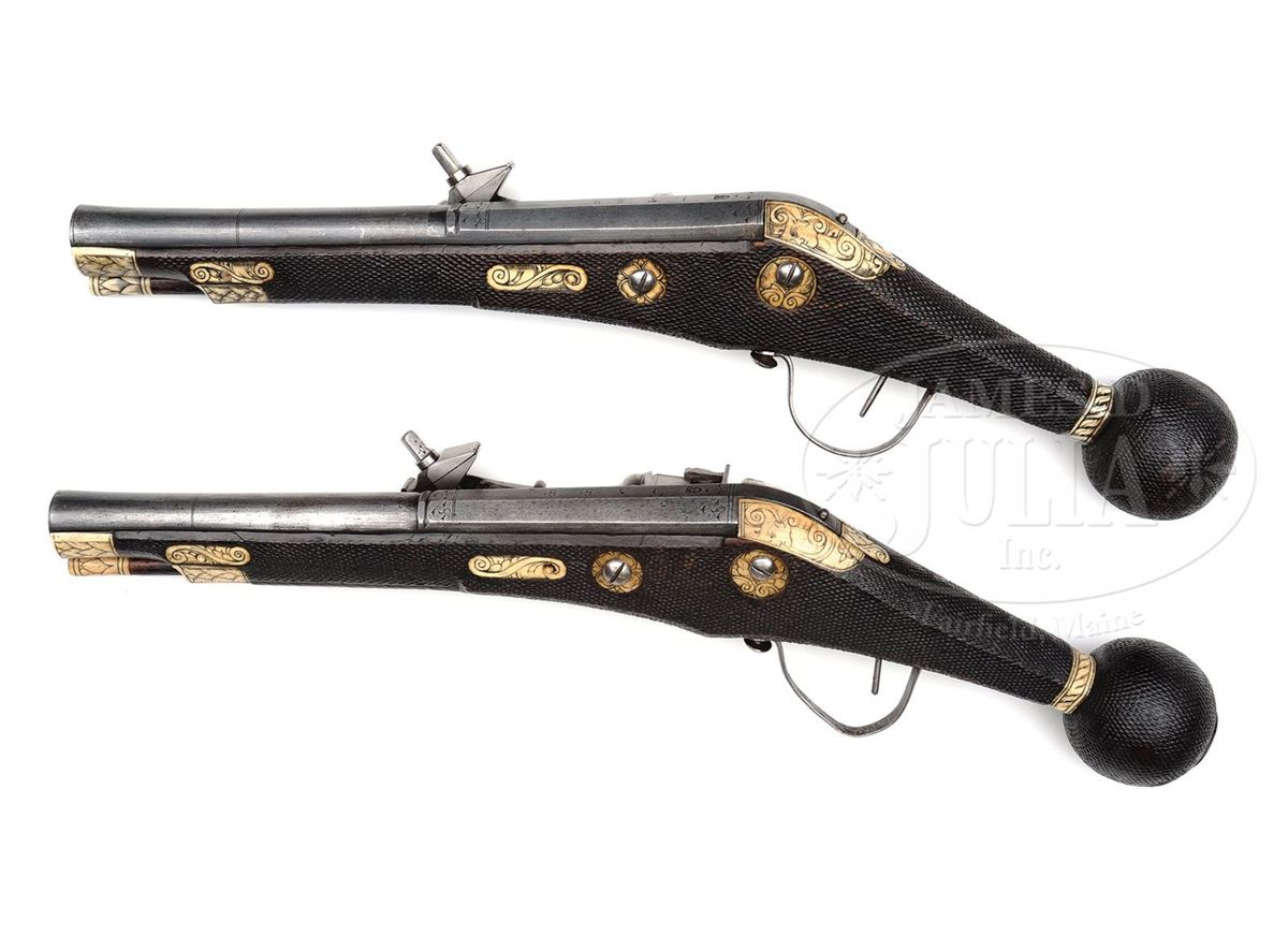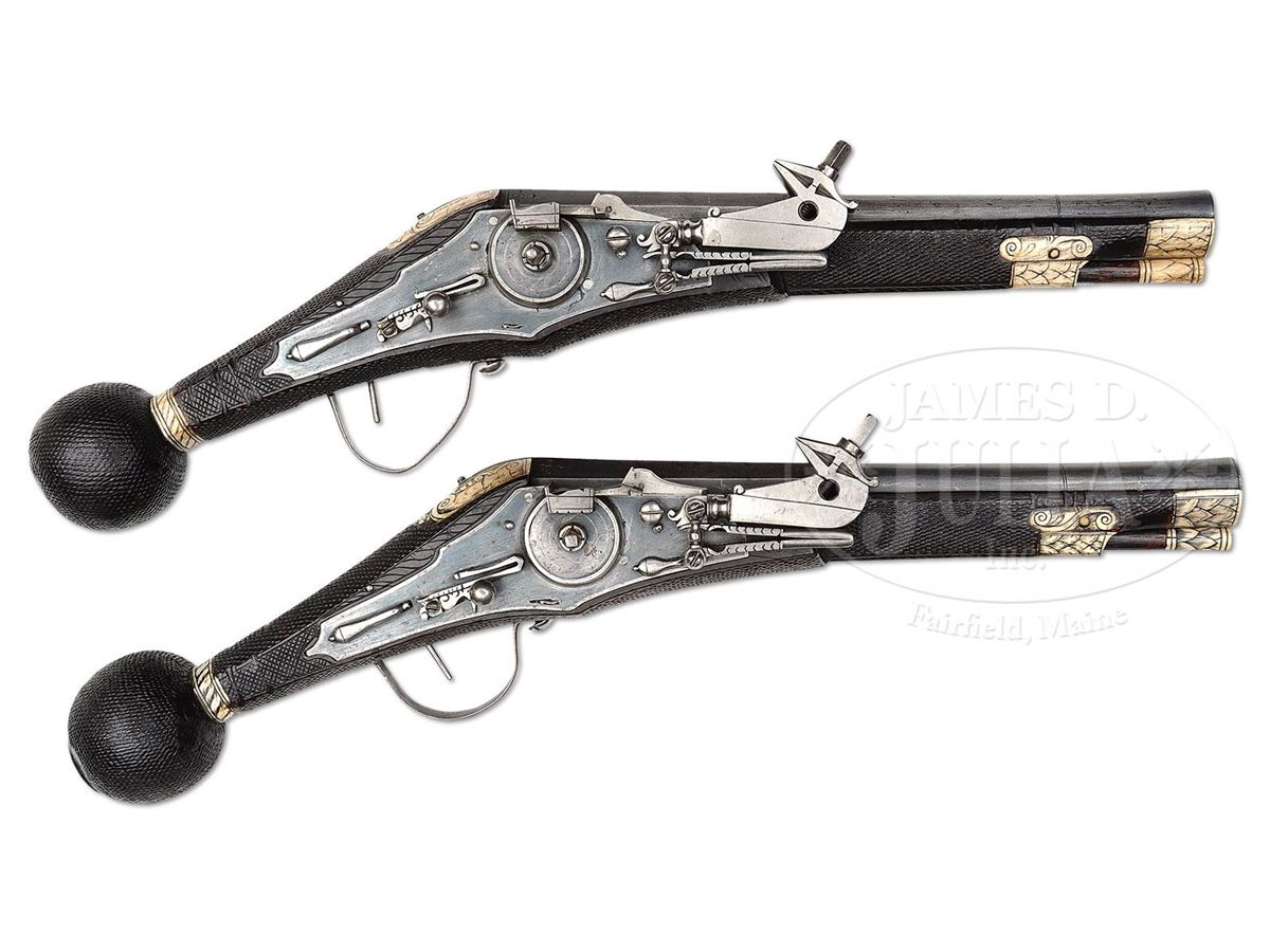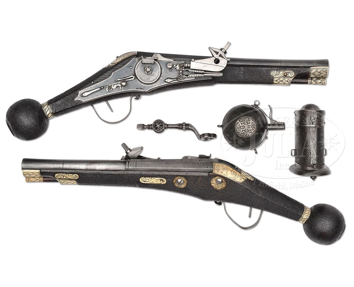 NSN. These pistols are in virtually as issued condition from 1588. The elector guard wheel lock pistols represent the glory and majesty of the Royal Saxon Court. These were carried by enlisted men and officers of the guard and stored in the Saxon armory. They came in several grades. The enlisted man's grade featured stocks stamped in imitation of stag horn with a simple stag horn inlay on the butt with the crossed swords of the Saxon arms. The higher grade, as these are, has a silver rondel cast and chased with a figure of Mars, the God of War, in full armor. The highest grades for royal officers have silver rondels, but the wheel covers are gilded and the inlay just before the ball is a silver band rather than stag horn. Accompanied by an original 3-position spanner and screwdriver which is elaborately pierced with a wheel design. NOTES: These pistols are unusual because they are a true pair having the same date "1588" and the same maker's name "IS" with a cross and heart. PROVENANCE: See Decorated Firearms 1540-1870 From the Collection of Clay P. Bedford, by Gusler & Lavin, pp. 124-125. Prince Ernst Heinrich of Saxony 1926. Bashford Dean. Stephen V. Grancsay, Brooklyn, NY. Frank E. Bivens, Jr., Mango Way, Los Angeles, CA. Clay P. Bedford. Peter Bedford. Collection of Dr. Douglas Sirkin. Publications: 42 Year Scrapbook of Varitype Firearms by Theodore Dexter featuring the Frank E. Bivens, Jr. collection. "Decorated Firearms" by Wallace B. Gusler and James D. Lavin, pgs. 123 & 124. CONDITION: These pistols are in pristine original condition retaining much of their original very light bluing on both lock and bbl. The pans are blued inside. Pistols are unfired and would be called "mint". All inlays are original and intact. Hammers retain their original polish. All parts are original. Virtually impossible to improve upon the condition of these pistols. 4-49802 MZ17