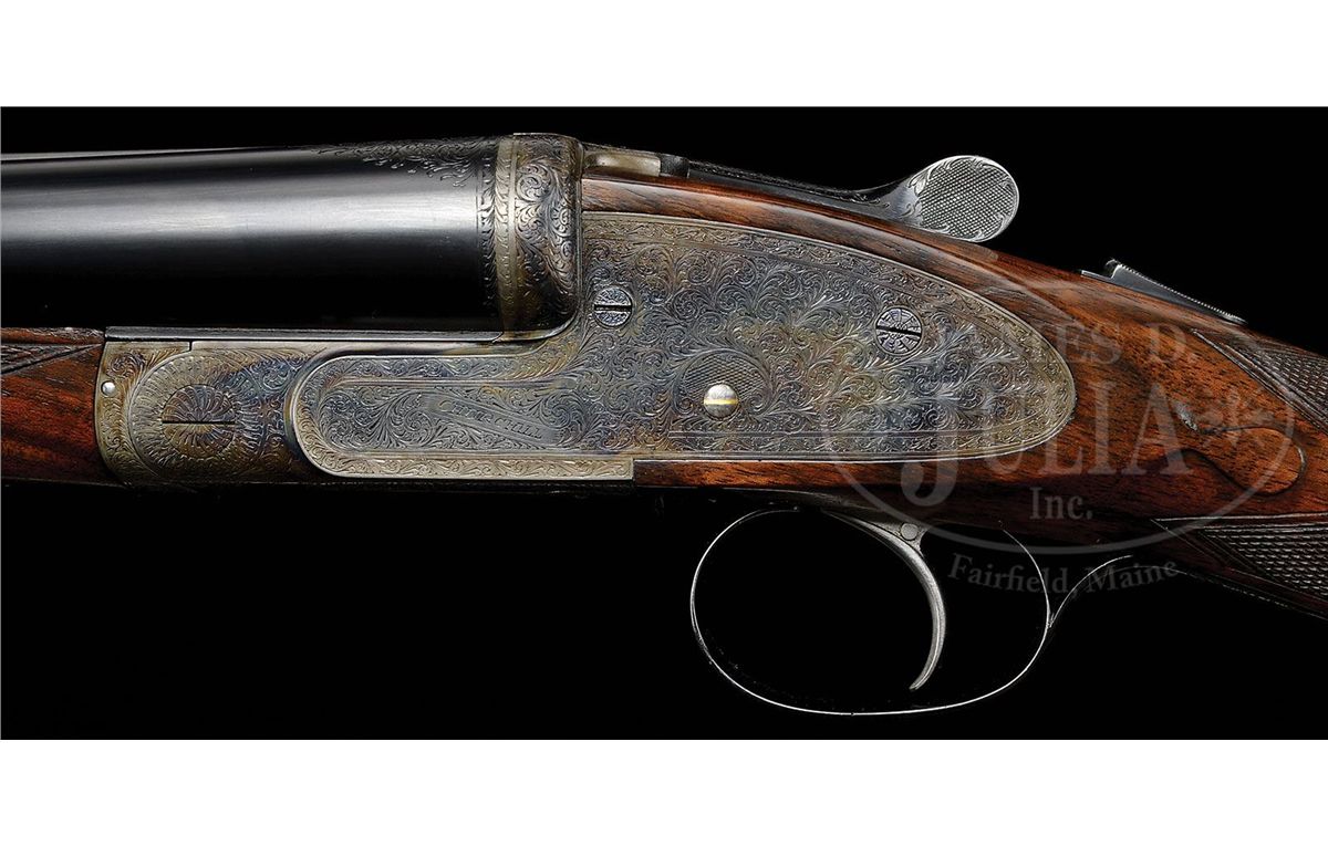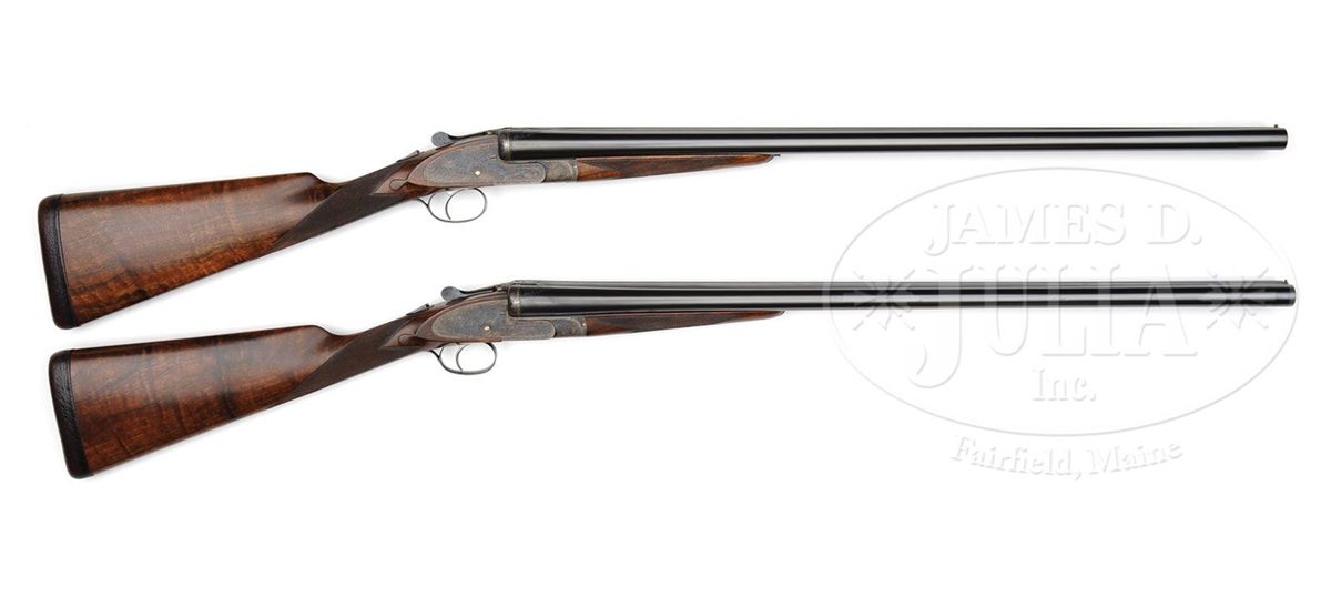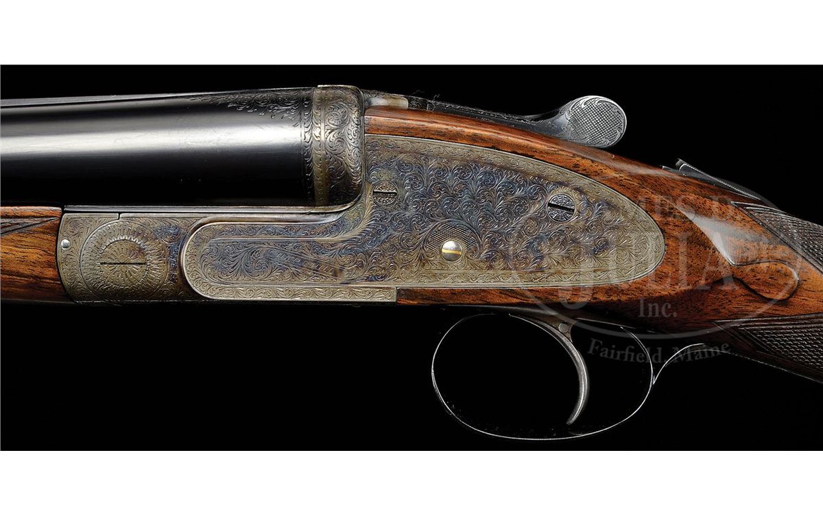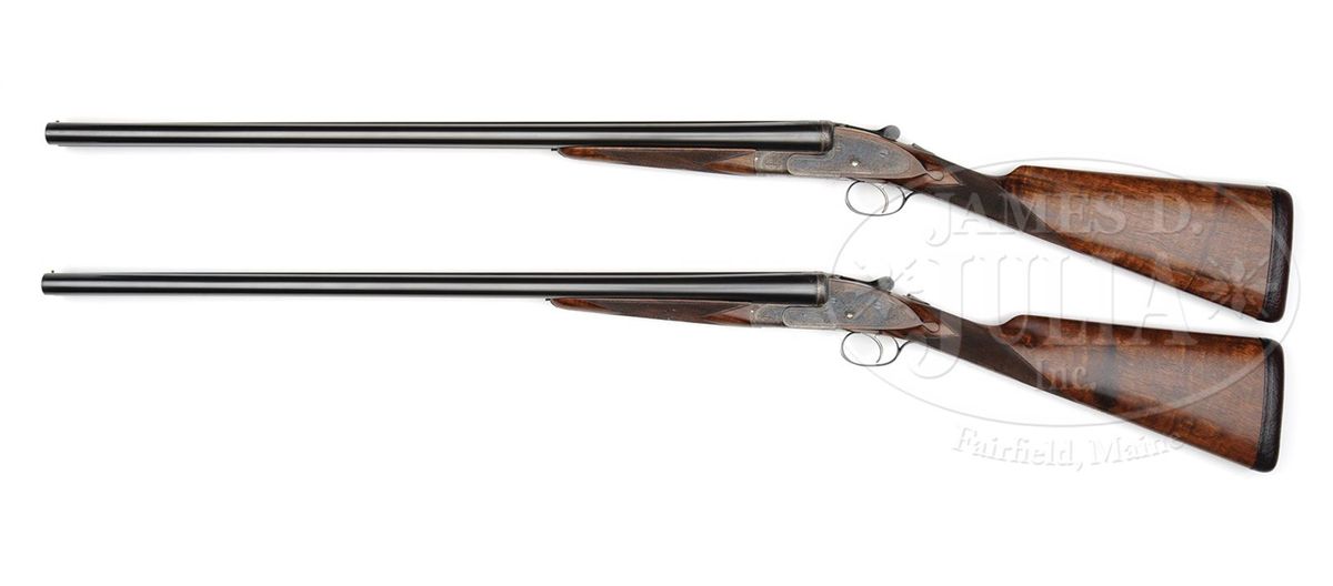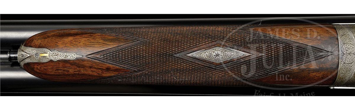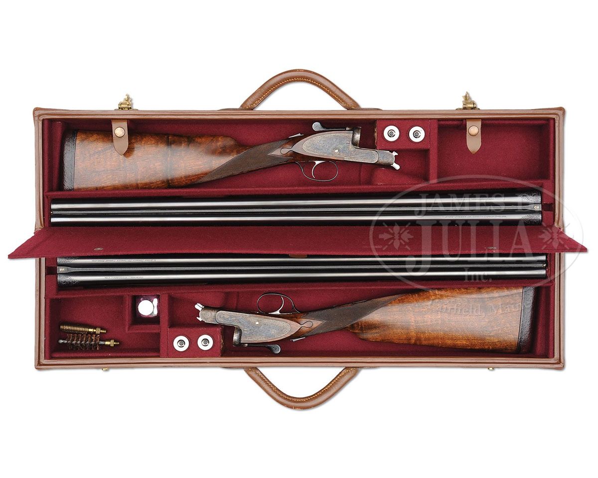 SN 23695/ 23696. Cal. 12 ga. 2-3/4" Chambers. These fine guns are a true pair, with the numbers "1" and "2" gold inlaid on rear portions of ribs, top levers, and forend tips. 28" Chopper lump bbls with raised, matted Churchill ribs, are engraved "Churchill (Gun Makers) Ltd" and "7, Bury Street. St. James's, London. England." on tops. Bbl flats are stamped with 1973 London nitro proofs for 2-3/4" chambers. Bottoms of bbls are engraved with SNs. Case hardened, pinless sidelock, easy opening actions are stocked to the fences, and feature automatic safeties (SAFE inlaid in gold), bushed strikers, gold band tumbler end cocking indicators, and Holland & Holland type single selective triggers. Actions and lockplates are engraved with near full coverage medium, shaded scroll. "Churchill" is in scroll terminated riband at the front of each lockplate, and the bottom of each action is engraved "Premier" "Finest Quality" and "Model". Top levers and double beaded trigger guards are scroll engraved, and have SNs on short tangs. Well matched, lightly figured, European walnut straight grip buttstocks measure 14-7/8" over reddish brown leather covered pads, and feature drop points, classic point pattern checkering with mullered borders, and gold inlet individual letters "V F T Jr" on toe lines. Matching splinter ejector forends have Anson releases. Gun no. "1": Bore diameter: left-.727, right -.727. Bore restrictions: left -.013 (Lt. Mod), right -.004 (IC). Wall thickness: left -.030, right -.032. Drop at heel: 2-3/8", drop at comb: 1-9/16". Weight: 6 lbs. 12 oz. LOP: 14-7/8". Gun no. "2": Bore diameter: left-.726, right -.727. Bore restrictions: left -.012 (Lt Mod), right -.007 (IC). Wall thickness: left -.031, right -.029. Drop at heel: 2-7/16", drop at comb: 1-9/16". Weight: 6 lbs. 11 oz. LOP: 14-7/8". Makers two gun leather VC case with large stitched leather corners is lined in maroon cloth, with a divider between gun compartments, which has black leather gold embossed Churchill label. Case contains 2 pc beech and brass cleaning rod with brush and jag, unmarked square oil bottle, and two pairs of snap caps marked "C, A, G, & L". PROVENANCE: H & H card referencing consignor of this gun, and indicating the guns are fitted with H & H single triggers, and that in 2009 the guns were stripped and cleaned, and also had leather pads fitted by Holland & Holland (New York). CONDITION: Excellent. Guns show very little use. Bbls retain nearly 98% orig blue, with only some light handling marks, mostly on gun no. "1". Actions and lockplates retain nearly all of their orig case hardening color, with a hint of silvering on beads. Top levers and trigger guards have only slight silvering on sharp edges, with gun no. "2" showing a bit more wear. Stocks have only a few light handling marks in their orig rubbed oil finishes. Leather of pads is excellent. Bores are excellent, bright and shiny throughout. Actions are tight. Triggers are excellent. Ejectors are slightly out of time. Case leather is very fine, with a number of light scuffs and marks. Handles are excellent. Stitching is a bit loose. Interior cloth is very fine, with some light compressions and soiling. Label is excellent. Accessories are excellent. 4-49233 MGM265
