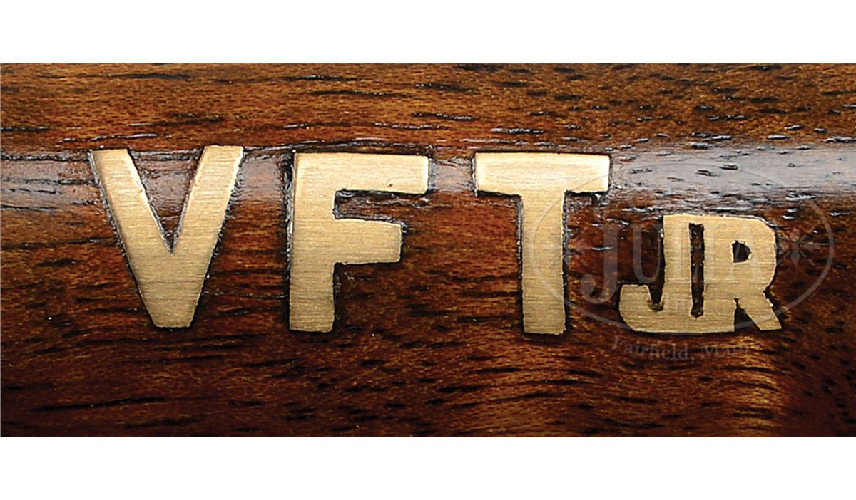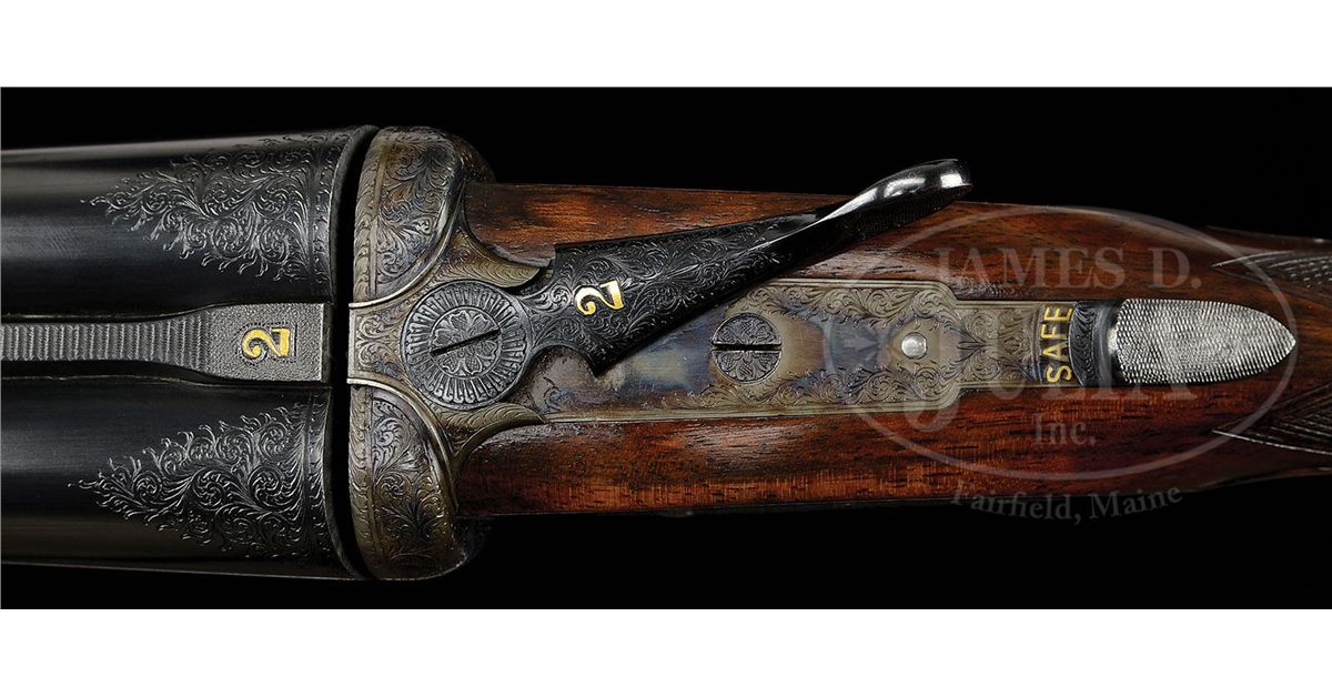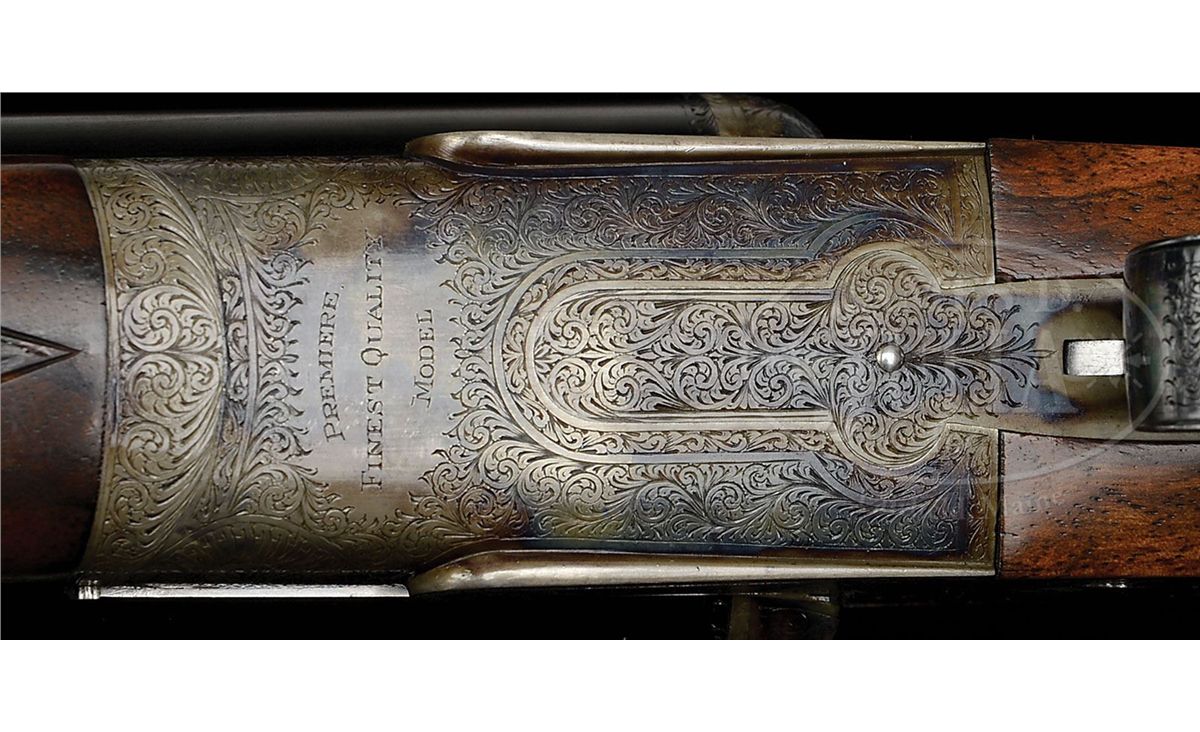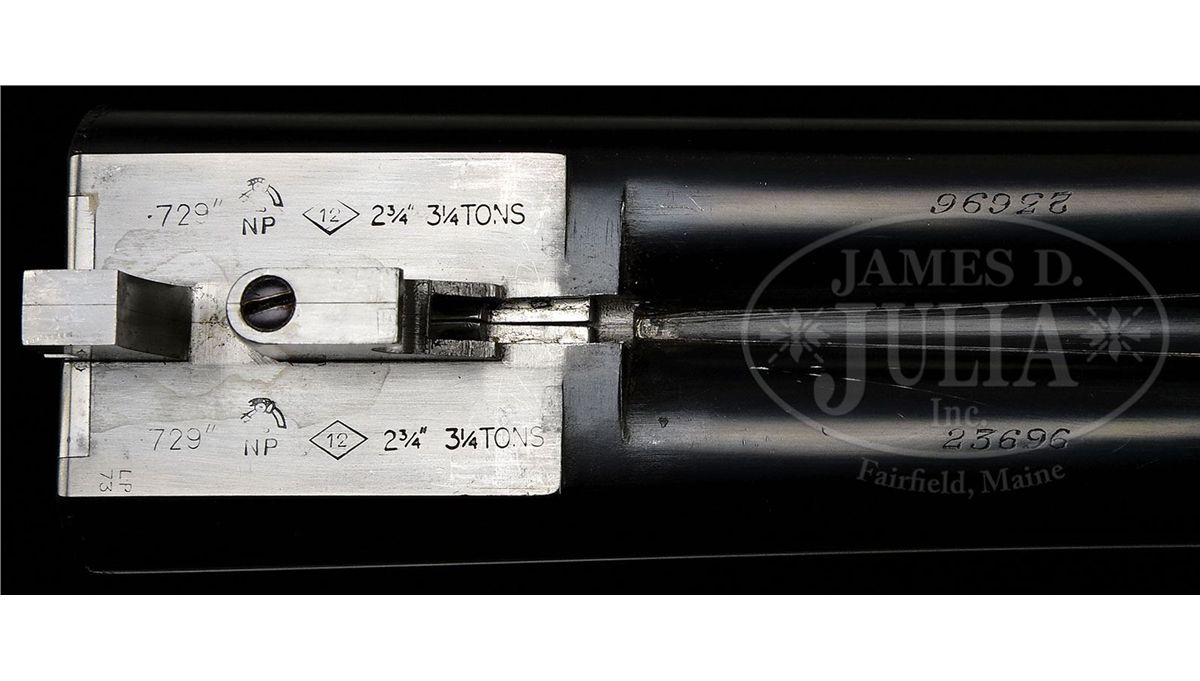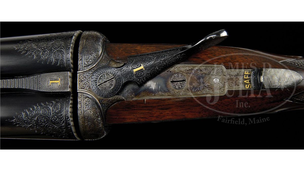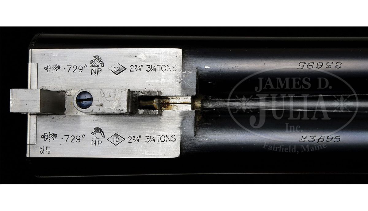 SN 23695/ 23696. Cal. 12 ga. 2-3/4" Chambers. These fine guns are a true pair, with the numbers "1" and "2" gold inlaid on rear portions of ribs, top levers, and forend tips. 28" Chopper lump bbls with raised, matted Churchill ribs, are engraved "Churchill (Gun Makers) Ltd" and "7, Bury Street. St. James's, London. England." on tops. Bbl flats are stamped with 1973 London nitro proofs for 2-3/4" chambers. Bottoms of bbls are engraved with SNs. Case hardened, pinless sidelock, easy opening actions are stocked to the fences, and feature automatic safeties (SAFE inlaid in gold), bushed strikers, gold band tumbler end cocking indicators, and Holland & Holland type single selective triggers. Actions and lockplates are engraved with near full coverage medium, shaded scroll. "Churchill" is in scroll terminated riband at the front of each lockplate, and the bottom of each action is engraved "Premier" "Finest Quality" and "Model". Top levers and double beaded trigger guards are scroll engraved, and have SNs on short tangs. Well matched, lightly figured, European walnut straight grip buttstocks measure 14-7/8" over reddish brown leather covered pads, and feature drop points, classic point pattern checkering with mullered borders, and gold inlet individual letters "V F T Jr" on toe lines. Matching splinter ejector forends have Anson releases. Gun no. "1": Bore diameter: left-.727, right -.727. Bore restrictions: left -.013 (Lt. Mod), right -.004 (IC). Wall thickness: left -.030, right -.032. Drop at heel: 2-3/8", drop at comb: 1-9/16". Weight: 6 lbs. 12 oz. LOP: 14-7/8". Gun no. "2": Bore diameter: left-.726, right -.727. Bore restrictions: left -.012 (Lt Mod), right -.007 (IC). Wall thickness: left -.031, right -.029. Drop at heel: 2-7/16", drop at comb: 1-9/16". Weight: 6 lbs. 11 oz. LOP: 14-7/8". Makers two gun leather VC case with large stitched leather corners is lined in maroon cloth, with a divider between gun compartments, which has black leather gold embossed Churchill label. Case contains 2 pc beech and brass cleaning rod with brush and jag, unmarked square oil bottle, and two pairs of snap caps marked "C, A, G, & L". PROVENANCE: H & H card referencing consignor of this gun, and indicating the guns are fitted with H & H single triggers, and that in 2009 the guns were stripped and cleaned, and also had leather pads fitted by Holland & Holland (New York). CONDITION: Excellent. Guns show very little use. Bbls retain nearly 98% orig blue, with only some light handling marks, mostly on gun no. "1". Actions and lockplates retain nearly all of their orig case hardening color, with a hint of silvering on beads. Top levers and trigger guards have only slight silvering on sharp edges, with gun no. "2" showing a bit more wear. Stocks have only a few light handling marks in their orig rubbed oil finishes. Leather of pads is excellent. Bores are excellent, bright and shiny throughout. Actions are tight. Triggers are excellent. Ejectors are slightly out of time. Case leather is very fine, with a number of light scuffs and marks. Handles are excellent. Stitching is a bit loose. Interior cloth is very fine, with some light compressions and soiling. Label is excellent. Accessories are excellent. 4-49233 MGM265