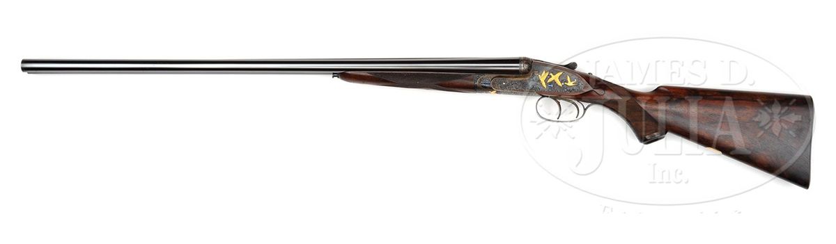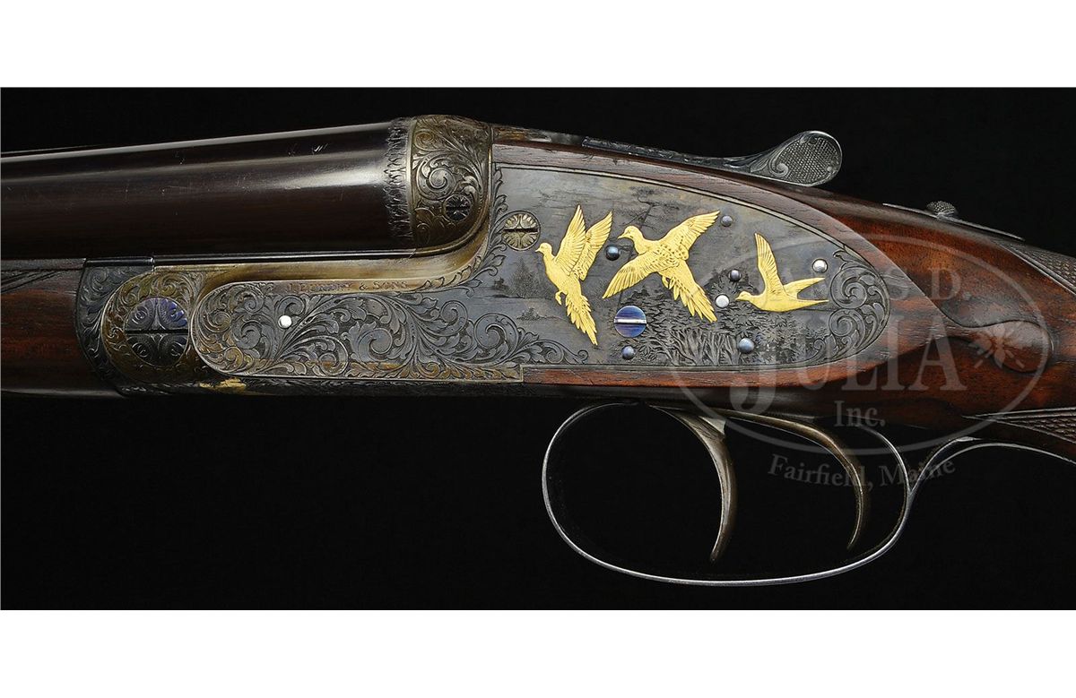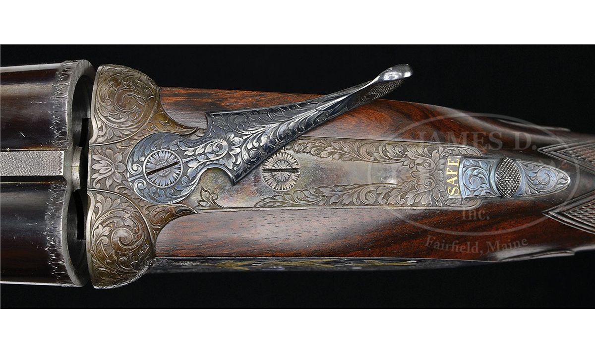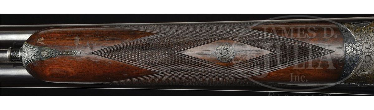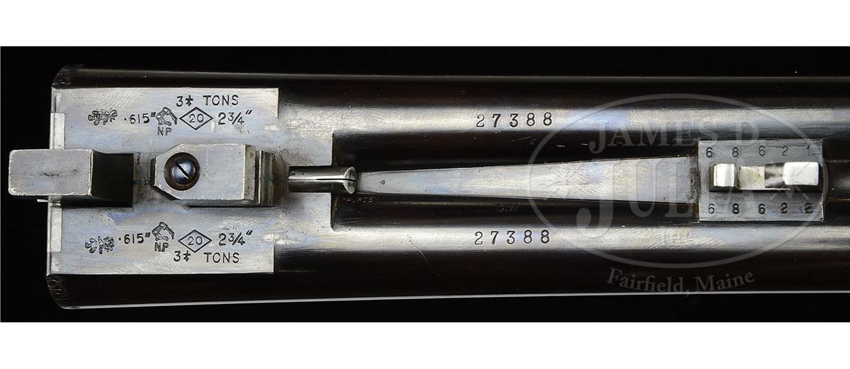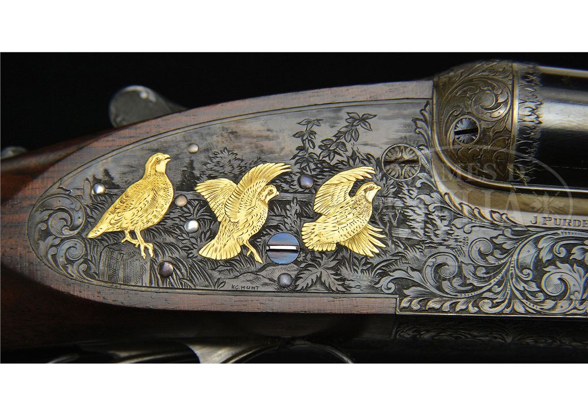 SN 27388. (1966) Cal. 20 ga. 2-3/4" Chambers. 26" Chopper lump bbls with flat, narrow, matted rib, are engraved "J. Purdey & Sons." and "AUDLEY HOUSE. SOUTH AUDLEY STREET. LONDON. ENGLAND." on tops. Bbl flats are stamped with London nitro proofs for 2-3/4" chambers. Bottoms of bbls are stamped with SN. Bottom right bbl is stamped with initials "G.W." (George Wood, barrel maker). Tube nos. "68621" and "68622" are on loop. Small, case hardened, Beesley patent, self-opening action features automatic safety (SAFE inlaid in gold), bushed strikers, raised rib tumbler end cocking indicators, and double triggers. Action is engraved with very well cut and nicely laid out, large, semi-relief, open, shaded scroll with acanthus and strap work highlights. A well detailed gold inlaid cocker spaniel retrieving a quail bounds across bottom of action. This very fine scroll spills over onto lockplates, which also have scenes of game birds gold inlaid in appropriate field backgrounds; trio of doves is on left lockplate; and quail on right. All of this fine work is by highly regarded master engraver, Ken Hunt, whose signature appears under scenes on both lockplates. His initials are under spaniel on bottom of action. "J. Purdey & Sons" is on each side of action above lockplates. Fences are engraved with somewhat deeper relief scroll. Blued top lever and trigger guard are engraved with scroll matching action. Trigger guard tang is engraved with SN and extends to grip cap. Well figured, and finely marbled European walnut full capped pistol grip buttstock measures 13" over checkered wood butt, and features drop points, point pattern checkering with mullered borders, hard rubber grip cap, and vacant gold oval on toe line. Matching splinter ejector forend has Anson release. Actioners initials "T.B" are stamped on iron. Bore diameter: left-.614, right -.614. Bore restrictions: left -.004 (IC), right -.002 (IC). Wall thickness: left -.032, right -.036. Drop at heel: 2", drop at comb: 1-1/2". Weight: 5 lbs. 8 oz. LOP: 13". Makers motor case with stitched leather corners is embossed "Mrs C. L. Fitzgerald Greenwich, Conn." on top. Interior is lined in burgundy cloth with makers label on lid. Case contains a 2-pc walnut and brass cleaning rod. CONDITION: Excellent, near new. Bbls retain 95 - 98% orig blue with a few minor marks and light scratches. Action retains 90% + orig case hardening color, silvered on beads and tips of fences. Lockplates retain nearly all of their color. Top lever, forend iron, and trigger guard are only slightly silvered. Hinge pin and tumbler ends retain nearly all of their fire blue. Stocks retain nearly all of their orig rubbed oil finish, with a few light marks from occasional field use. There is a somewhat deeper small dent on forend behind tip. Bores are excellent, bright and shiny throughout with no visible imperfections. Action is tight. Bbls are on face. Ejectors are in time. Case leather is excellent with some light scuffs and one or two deeper scratches. Straps and handle are very fine. Interior cloth is excellent, with a few rubs. A finely built and finished gun, light and lively. Perfect for someone of small stature, or for almost anyone, with the addition of a pad. 4-48684 MGM40