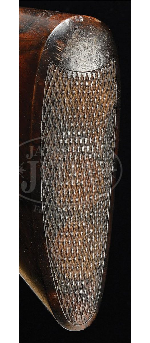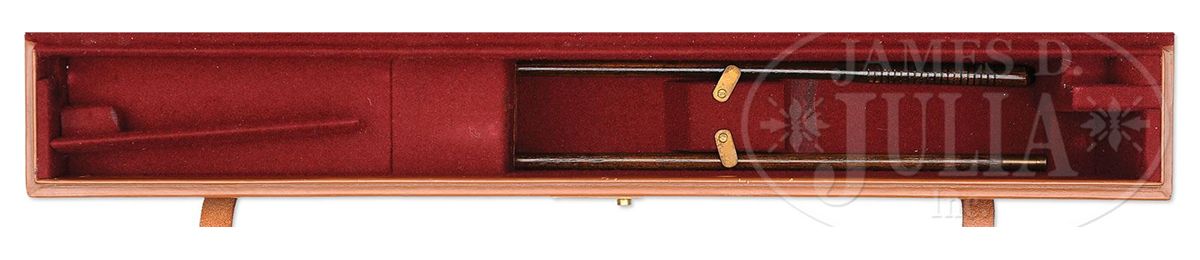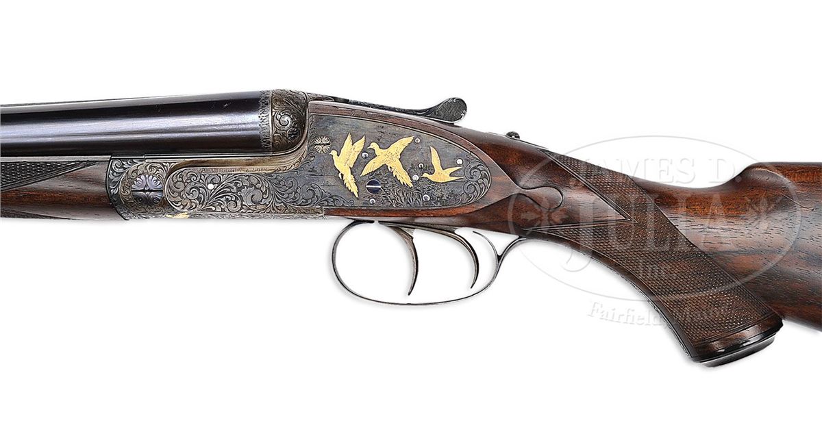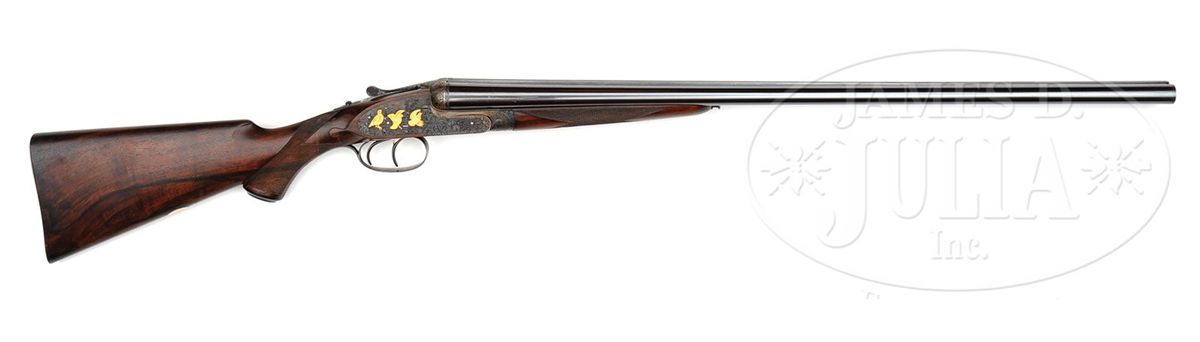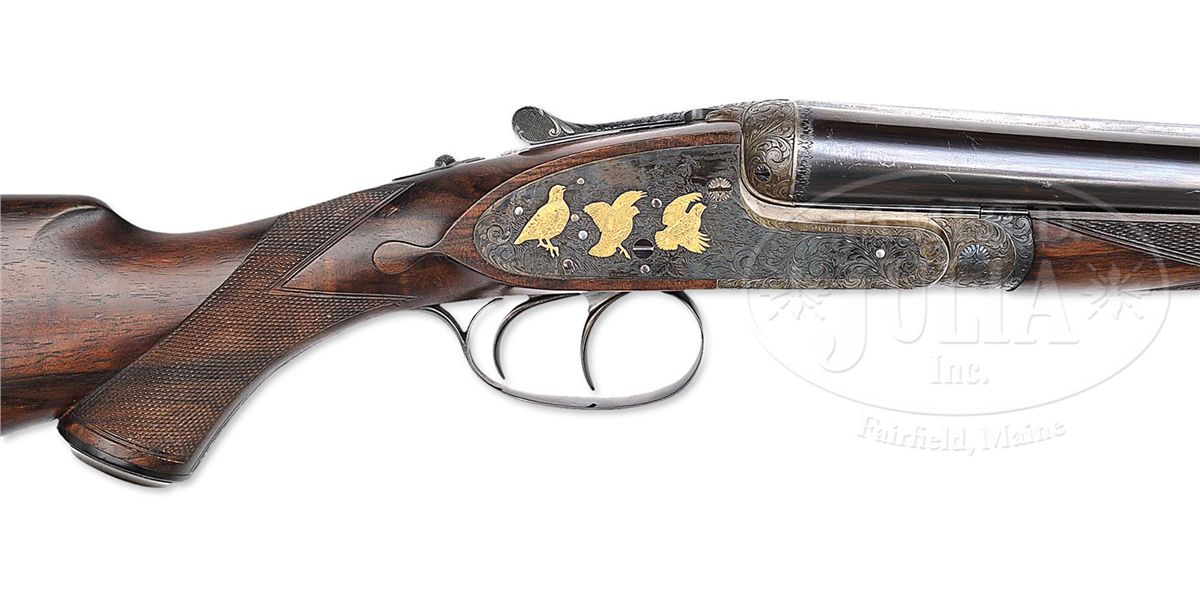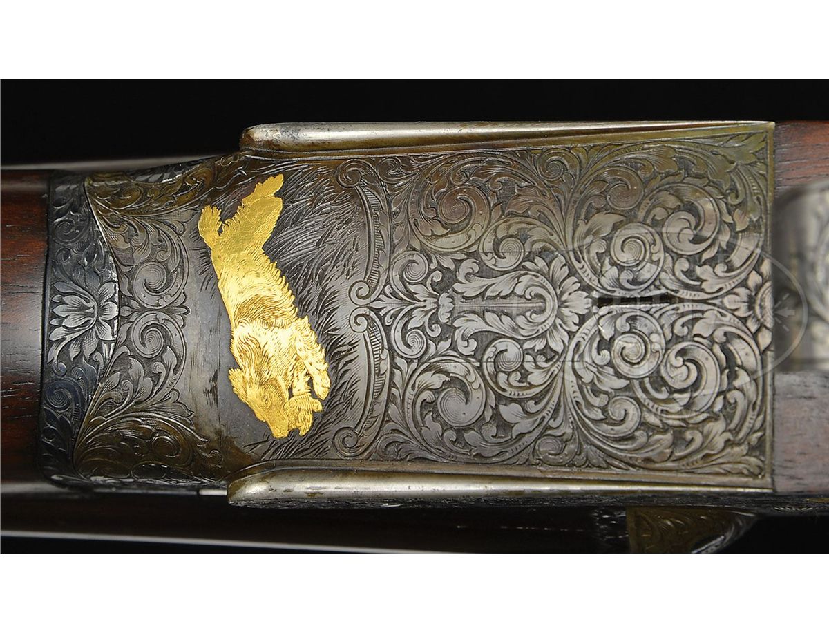 SN 27388. (1966) Cal. 20 ga. 2-3/4" Chambers. 26" Chopper lump bbls with flat, narrow, matted rib, are engraved "J. Purdey & Sons." and "AUDLEY HOUSE. SOUTH AUDLEY STREET. LONDON. ENGLAND." on tops. Bbl flats are stamped with London nitro proofs for 2-3/4" chambers. Bottoms of bbls are stamped with SN. Bottom right bbl is stamped with initials "G.W." (George Wood, barrel maker). Tube nos. "68621" and "68622" are on loop. Small, case hardened, Beesley patent, self-opening action features automatic safety (SAFE inlaid in gold), bushed strikers, raised rib tumbler end cocking indicators, and double triggers. Action is engraved with very well cut and nicely laid out, large, semi-relief, open, shaded scroll with acanthus and strap work highlights. A well detailed gold inlaid cocker spaniel retrieving a quail bounds across bottom of action. This very fine scroll spills over onto lockplates, which also have scenes of game birds gold inlaid in appropriate field backgrounds; trio of doves is on left lockplate; and quail on right. All of this fine work is by highly regarded master engraver, Ken Hunt, whose signature appears under scenes on both lockplates. His initials are under spaniel on bottom of action. "J. Purdey & Sons" is on each side of action above lockplates. Fences are engraved with somewhat deeper relief scroll. Blued top lever and trigger guard are engraved with scroll matching action. Trigger guard tang is engraved with SN and extends to grip cap. Well figured, and finely marbled European walnut full capped pistol grip buttstock measures 13" over checkered wood butt, and features drop points, point pattern checkering with mullered borders, hard rubber grip cap, and vacant gold oval on toe line. Matching splinter ejector forend has Anson release. Actioners initials "T.B" are stamped on iron. Bore diameter: left-.614, right -.614. Bore restrictions: left -.004 (IC), right -.002 (IC). Wall thickness: left -.032, right -.036. Drop at heel: 2", drop at comb: 1-1/2". Weight: 5 lbs. 8 oz. LOP: 13". Makers motor case with stitched leather corners is embossed "Mrs C. L. Fitzgerald Greenwich, Conn." on top. Interior is lined in burgundy cloth with makers label on lid. Case contains a 2-pc walnut and brass cleaning rod. CONDITION: Excellent, near new. Bbls retain 95 - 98% orig blue with a few minor marks and light scratches. Action retains 90% + orig case hardening color, silvered on beads and tips of fences. Lockplates retain nearly all of their color. Top lever, forend iron, and trigger guard are only slightly silvered. Hinge pin and tumbler ends retain nearly all of their fire blue. Stocks retain nearly all of their orig rubbed oil finish, with a few light marks from occasional field use. There is a somewhat deeper small dent on forend behind tip. Bores are excellent, bright and shiny throughout with no visible imperfections. Action is tight. Bbls are on face. Ejectors are in time. Case leather is excellent with some light scuffs and one or two deeper scratches. Straps and handle are very fine. Interior cloth is excellent, with a few rubs. A finely built and finished gun, light and lively. Perfect for someone of small stature, or for almost anyone, with the addition of a pad. 4-48684 MGM40