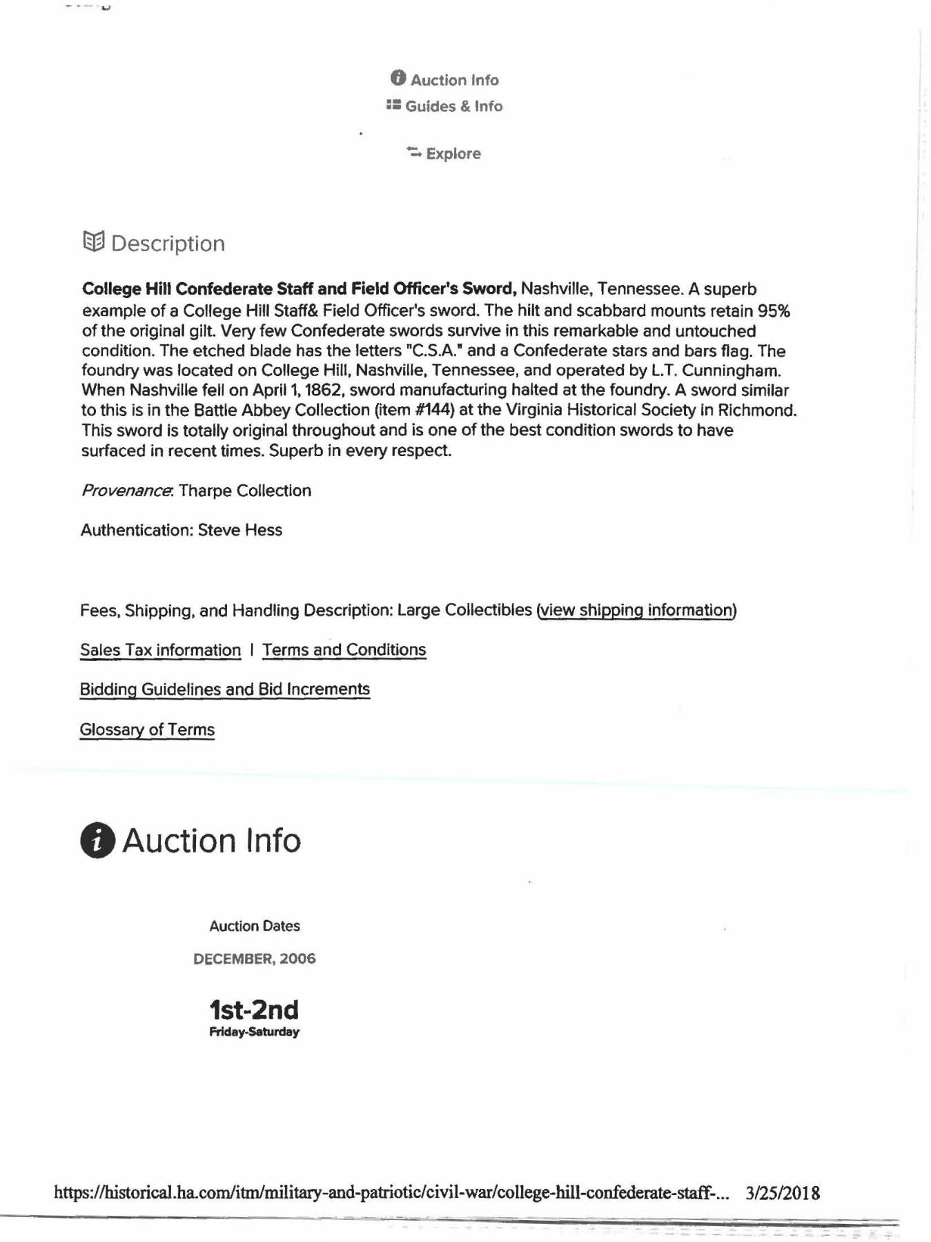 FIELD OFFICER'S SWORD. Rare and beautiful condition of unique staff sword with large "CSA" cast in relief on bottom of guard. There are only a handful of complete examples extant. This sword exhibits a 29.75" pen-knife style blade, which is unique to this Nashville, TN manufacturer. Blade is patriotically etched with large "CSA" in 3" panel with a Confederate flag on staff. The knucklebow enters the pommel near its base, and scabbard throat is angled and ring mount at base, both unique College Hill features. Leather grip is complete, still retaining much of its polish luster and its original tightly twisted brass wire. UNATTACHED ACCESSORIES: letter of authenticity from the late sword authority Steve Hess written for Heritage Auctions 2006. CONDITION: fine overall. Grip is superior with complete polished leather & wire wrap. Blade has been cleaned & is gray overall with etched panels 60-80% discernible, staining, light pitting, very good point. Brass hilt and scabbard mounts have been burnished (polished & lacquered) which was so popular in Victorian era, much original gold plating is retained and contrasts beautifully with polished brass now a warm yellow patina. Leather scabbard body is exceptional and appears new, properly sewn and glued on edge. PROVENANCE: Lifelong collection of Richard A. Baumann. (02-23358/JS). NON-GUN. $15,000-30,000.