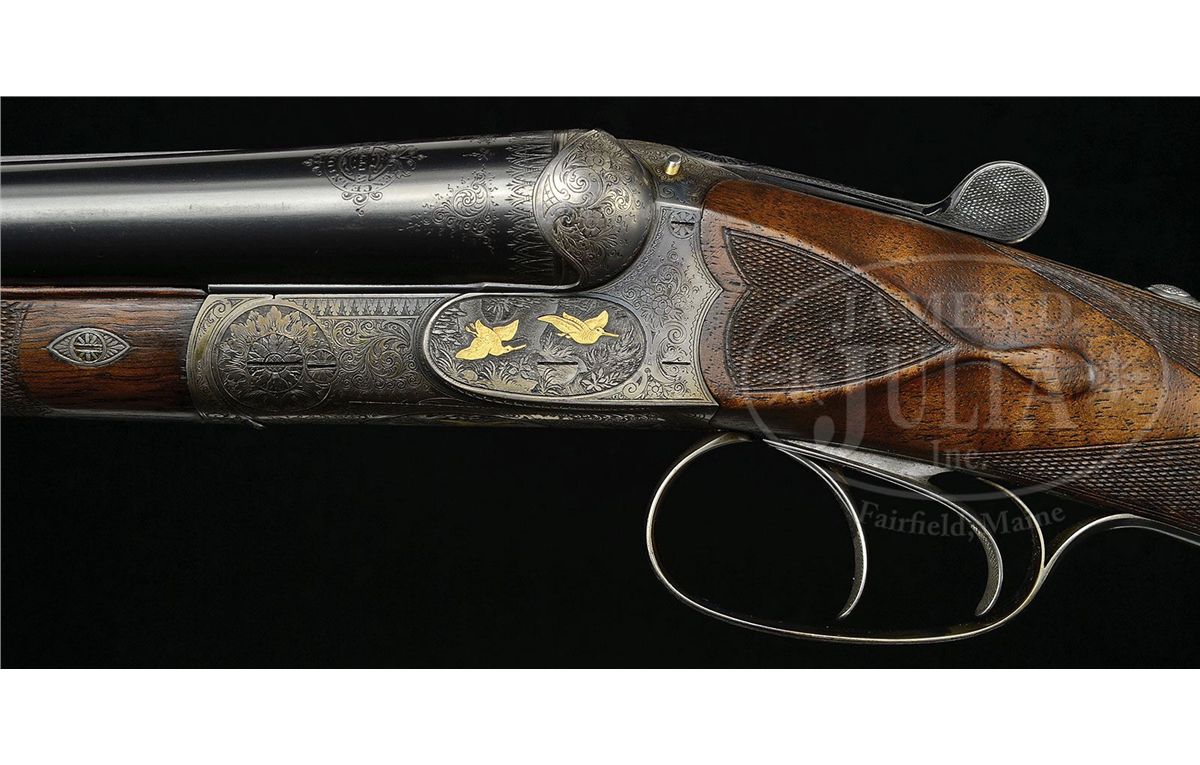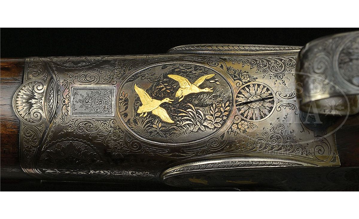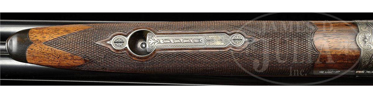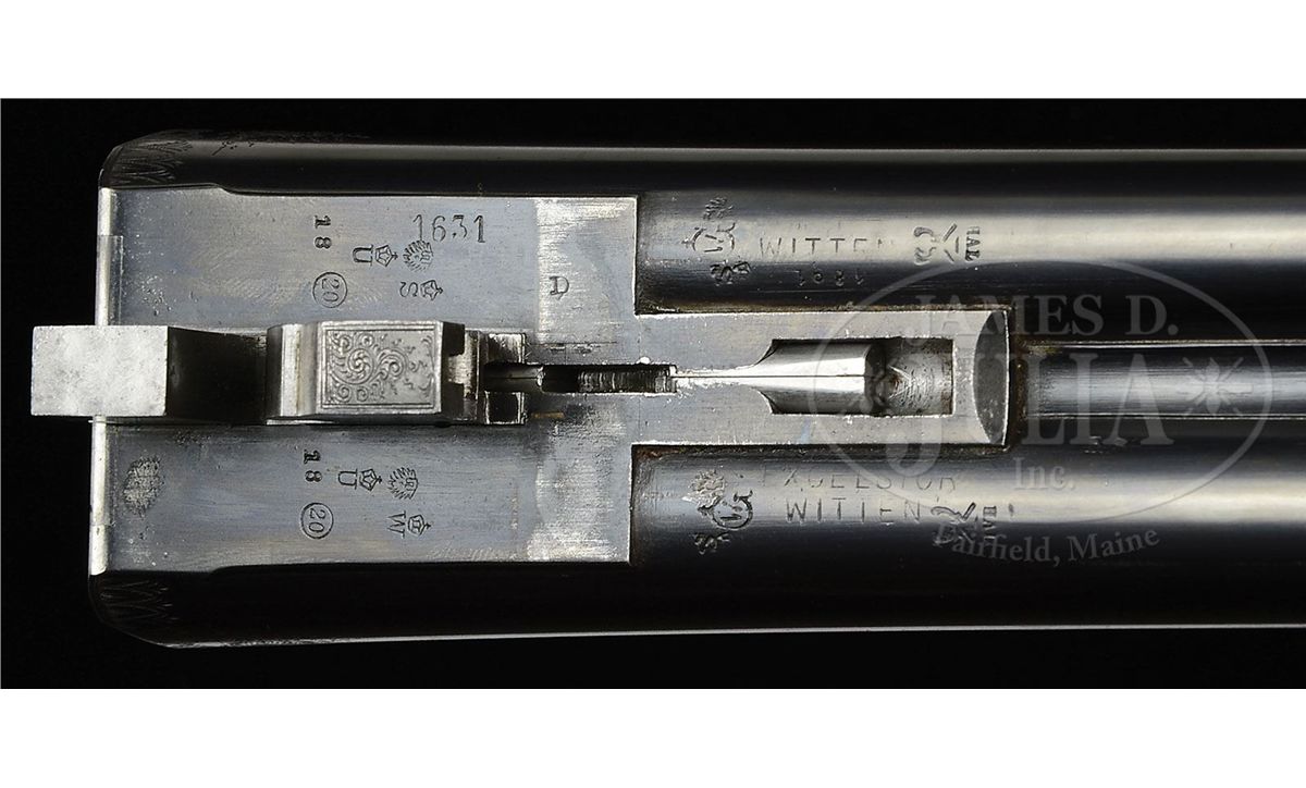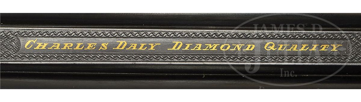 SN 1631. Cal. 20 ga. 3" Chambers. 24" Dovetailed bbls are gold inlaid "Charles Daly Diamond Quality" on unmatted portion of concave game rib. Bbls are engraved at breech ends with feather bands, some scroll, and Witten Excelsior Steel logos. Bbl flats are stamped with German imperial proofs for 20 ga. Bottoms of bbls have Witten logos and crossed pistols surmounted by "HAL" (H. A. Lindner). Petite, scallop-backed, boxlock action features square crossbolt third fastener, pin type cocking indicators, side clips, intercepting sears, double triggers, and non-automatic safety (SAFE inlaid in gold). Action is engraved with about 80% coverage well cut shaded scroll with floral and acanthus highlights, surrounding oval vignettes of gold inlaid game birds in well detailed settings; a pair of snipe are on left, quail on right, and ducks on bottom. A pointing setter is on trigger guard bow. Trigger blades are nicely checkered. Fine, fully fiddle-figured, and well marbled European walnut straight grip buttstock measures 13-1/2" over original ribbed, horn buttplate. Point pattern checkering is at grip. Side panels are also checkered and have extended drop points in classic Daly fashion. Gold oval on toe line is engraved with script monogram "L W C". Matching splinter ejector forend has inset horn tip and Deeley release. Bore diameter: left-.637, right -.636. Bore restrictions: left -.027 (Full), right -.004 (IC). Wall thickness: left -.023, right -.024. Drop at heel: 2-5/8", drop at comb: 1-7/16". Weight: 5 lbs. 0 oz. LOP: 13-1/2". CONDITION: Excellent. Bbls retain 90 - 95% of what appears to be orig blue, thinning at normal carry point. Action retains 80 - 85% orig case hardening color, silvered on bottom, fences, and tangs from normal hand wear. Top lever retains approx 90% orig bright blue, silvered on thumbpiece. Trigger guard has traces of orig color where protected on bow, is mostly silver and gray at grip. Color inside bow is strong. Stocks retain most of their orig oil finish, grain open. Some oil rubbed into butt. Checkering is somewhat worn. There is a small repair on left side of forend near tip, and a small chip from right side of forend near iron. Action is slightly loose. Bores are excellent. Ejectors are strong and in time. A rare and wonderful grouse and woodcock gun. 4-48997 MGM49