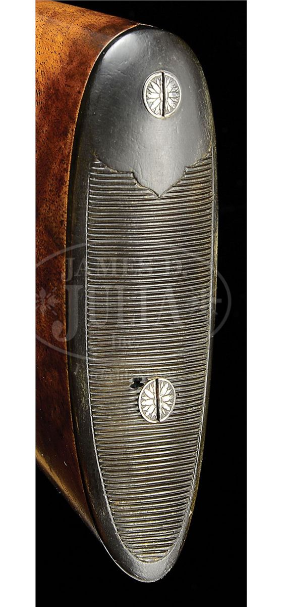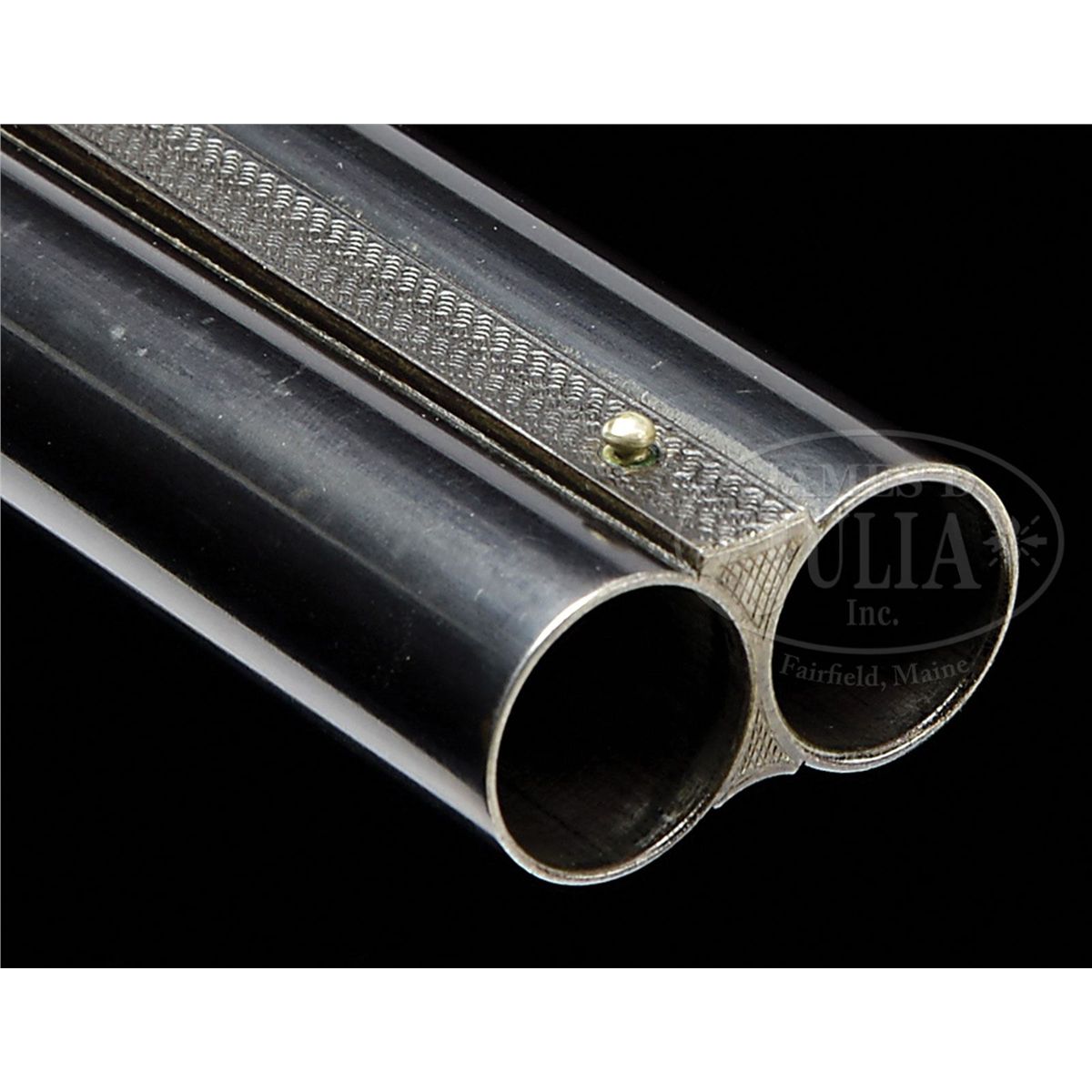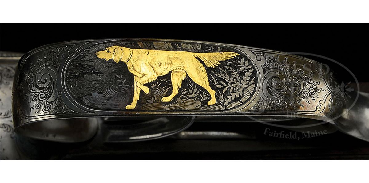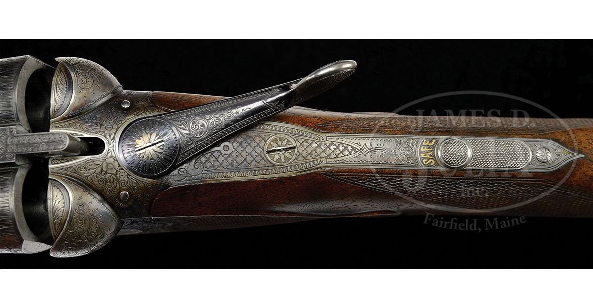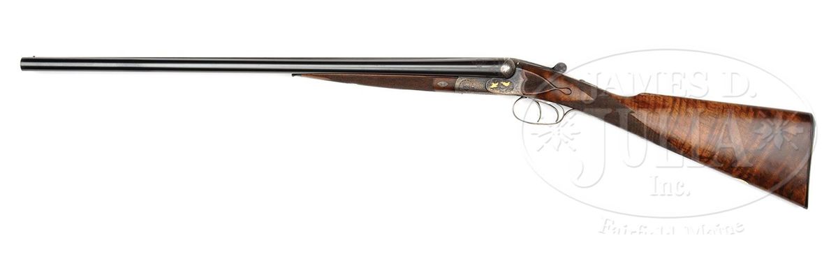 SN 1631. Cal. 20 ga. 3" Chambers. 24" Dovetailed bbls are gold inlaid "Charles Daly Diamond Quality" on unmatted portion of concave game rib. Bbls are engraved at breech ends with feather bands, some scroll, and Witten Excelsior Steel logos. Bbl flats are stamped with German imperial proofs for 20 ga. Bottoms of bbls have Witten logos and crossed pistols surmounted by "HAL" (H. A. Lindner). Petite, scallop-backed, boxlock action features square crossbolt third fastener, pin type cocking indicators, side clips, intercepting sears, double triggers, and non-automatic safety (SAFE inlaid in gold). Action is engraved with about 80% coverage well cut shaded scroll with floral and acanthus highlights, surrounding oval vignettes of gold inlaid game birds in well detailed settings; a pair of snipe are on left, quail on right, and ducks on bottom. A pointing setter is on trigger guard bow. Trigger blades are nicely checkered. Fine, fully fiddle-figured, and well marbled European walnut straight grip buttstock measures 13-1/2" over original ribbed, horn buttplate. Point pattern checkering is at grip. Side panels are also checkered and have extended drop points in classic Daly fashion. Gold oval on toe line is engraved with script monogram "L W C". Matching splinter ejector forend has inset horn tip and Deeley release. Bore diameter: left-.637, right -.636. Bore restrictions: left -.027 (Full), right -.004 (IC). Wall thickness: left -.023, right -.024. Drop at heel: 2-5/8", drop at comb: 1-7/16". Weight: 5 lbs. 0 oz. LOP: 13-1/2". CONDITION: Excellent. Bbls retain 90 - 95% of what appears to be orig blue, thinning at normal carry point. Action retains 80 - 85% orig case hardening color, silvered on bottom, fences, and tangs from normal hand wear. Top lever retains approx 90% orig bright blue, silvered on thumbpiece. Trigger guard has traces of orig color where protected on bow, is mostly silver and gray at grip. Color inside bow is strong. Stocks retain most of their orig oil finish, grain open. Some oil rubbed into butt. Checkering is somewhat worn. There is a small repair on left side of forend near tip, and a small chip from right side of forend near iron. Action is slightly loose. Bores are excellent. Ejectors are strong and in time. A rare and wonderful grouse and woodcock gun. 4-48997 MGM49