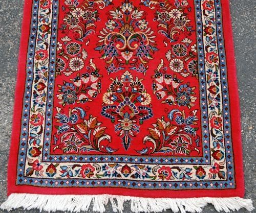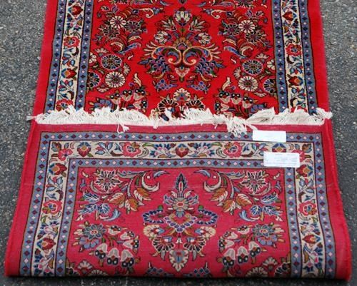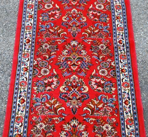 PRODUCED IN SAROUK, THIS BEAUTIFUL RUNNER RUG FEATURES CLASSIC ROUNDED VINE SCROLLS AND LAVISH ARABESQUES AS WELL AS LOCAL BOUQUET FILLED DESIGNS THAT REPRESENT THE DIVERSITY OF REGIONAL CARPET-WEAVING TRADITIONS. VERY BEAUTIFUL ALLOVER FLORAL DESIGN AUTHENTIC PERSIAN SAROUK RUNNER. SIZE 9.9 X 2.7 FEET, MADE OF FINE QUALITY LAMB'S WOOL PILE ON COTTON FOUNDATION, ALL NATURAL VEGETABLE DYE, THIS LOVELY RUNNER INCORPORATES A BEAUTIFUL ALLOVER FLORAL PATTERN ON A RICH RED BACKGROUND AND IS FRAMED BEAUTIFULLY BY AN INTRICATELY DONE FLORAL BORDER. HAND WOVEN IN SAROUK. AS A RESULT OF THE HANDMADE WEAVING PROCESS, NOT ALL SIDES MAY BE STRAIGHT OR CORNERS SQUARE.