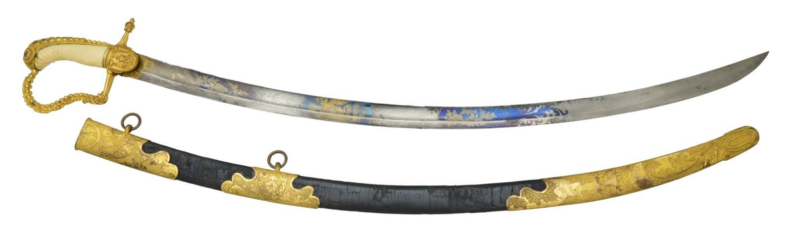 SWORD WITH EAGLE AND INDIAN PRINCESS BLADE. Overall length: 39 3/4". Blade length: 34 1/4". A single fullered, tricolored blade with gilt highlighted engraving showing various foliate and military motifs including a large American eagle, Liberty Cap on pole and a very large Indian princess on a blued field. There are 2 foliate engraved white panels on either side of the blade. Heavily gilted brass hilt with American eagle and shield languets. The guard terminates in a highly embellished quillon and the knuckle bow has an interesting beaded and oak lead motif. The bird's head pommel has swirls on either side and a similar beaded and oak leaf motif down the entire backstrap. Intricately carved and cross hatched certifiably antique ivory grip. Gilded brass mounted leather scabbard with exquisitely foliate embellished mounts featuring an enormous 14" drag with giant oak leaves. CONDITION: blade has a medium gray lightly mottled patina with light oxidation at the midpoint. Gilded highlights are about 70%. Blued field is about 60%. Etching is crisp and clear. Hilt retains nearly all of its original gilded finish. Grip is quite solid with a tiny chip at the top and a well executed crack repair at the base. Scabbard mounts retain 85% of their original gilded finish. Leather body is flaked and a bit flexed but remains strong and in one piece. (02-17779/BF). $3,500-4,200.