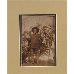 VERY INTERESTING CABINET CARD PHOTOGRAPH OF GERONIMO. 8-1/2” x 6-1/2” cabinet card - photographer unknown. This picture was taken inside a tent with cut branches propped in the background. This was likely shot at Ft. Sill, where Geronimo was held captive until his death. There is a pencil inscription on the back - "Chief Geronomo of Choctah Tribe. 4 Soldier Guards attending him to get his picture in Citizen clothes & with the robe made of the human scalps he had captured on the cot by his side. Commanche, Oklahoma Aug. 1899.” While the writer misspelled his name and assigned him to the wrong tribe, this is certainly Geronimo. He is holding an elaborately beaded walking stick, resting it on a very hairy robe of purportedly grisly origin. CONDITION: There is a fingernail-sized loss at the lower right of the photo, and the upper right corner of the card is chipped - otherwise very good. 4-50123 SO15
