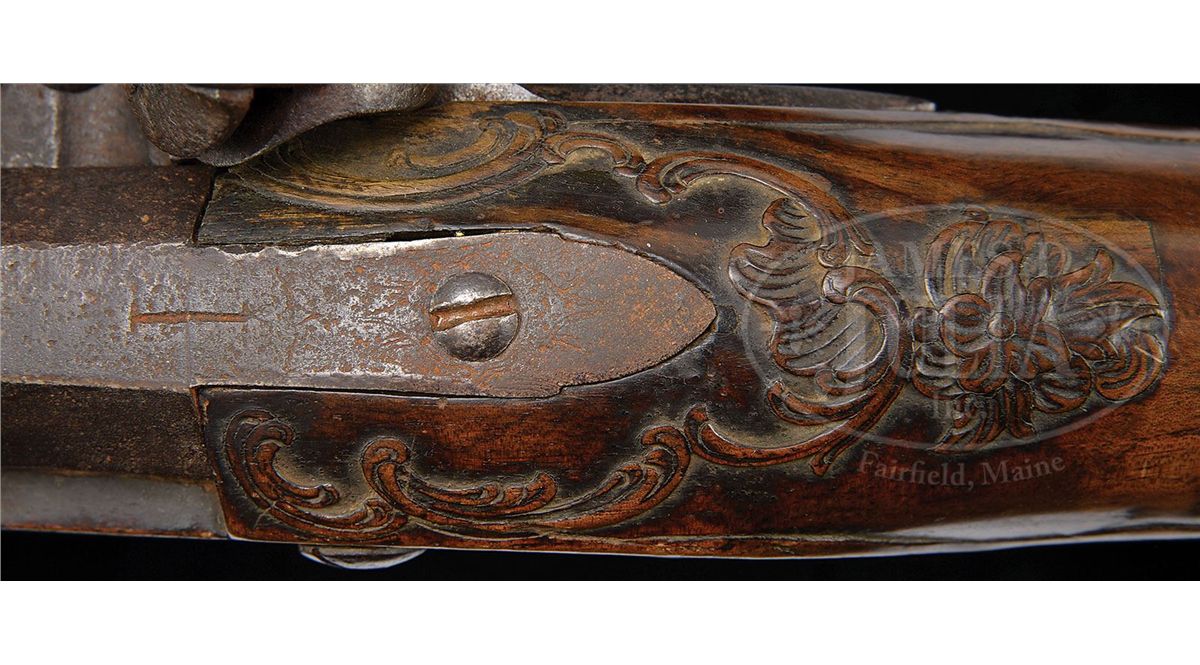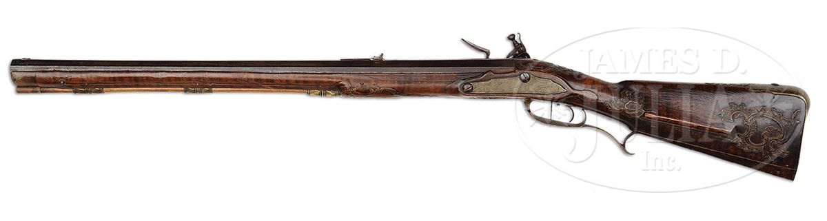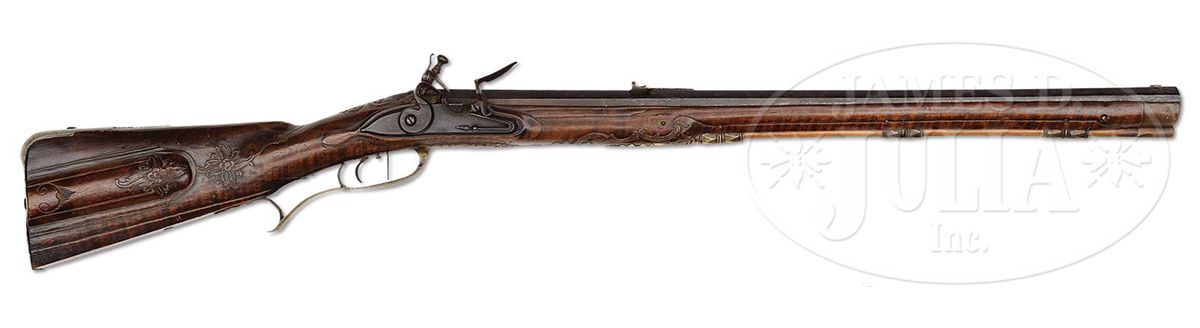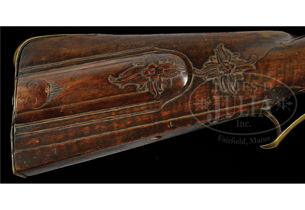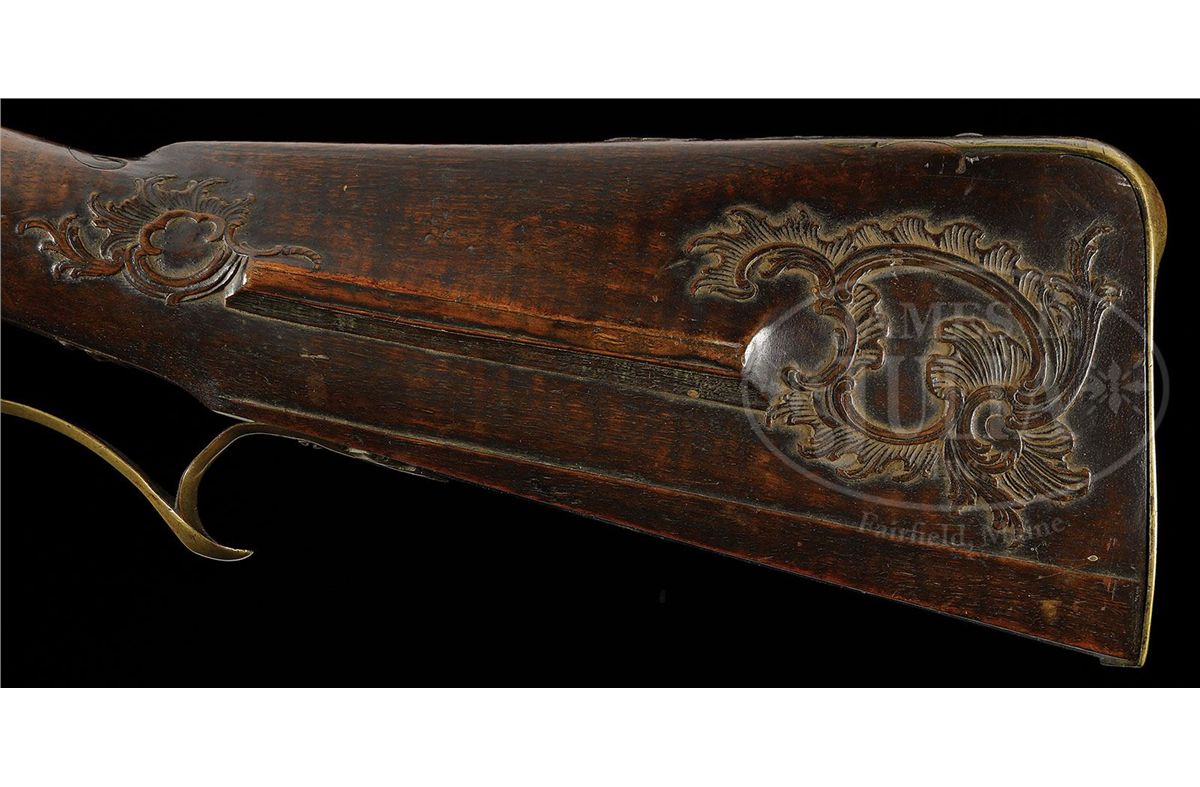 NSN. Barrel on this most interesting rifle is dated 1649. Assuming this is an actual date of manufacture, this bbl orig came from a wheel lock gun and was remounted for use during the 18th century. Lock is of characteristic Germanic form with faceted pan and rudimentary chiseling on cock. Brass mounts are simply engraved. Octagonal bbl is of typical Wheelock type with two position rear sight and silver fore sight swamped at the muzzle and deeply rifled of large caliber for hunting boar. Figured walnut full stock is beautifully and skillfully carved in relief with sprays of foliage on both sides of stock, patchbox and forend. Style of this carving is very similar to carving found on Kentucky rifles from Easton, Pennsylvania. NOTES: As the predecessor to the Kentucky or Pennsylvania rifle, the German Jaeger presents an important link to the collector and this particular example shows far more Kentucky qualities than the average jaeger rifle and makes it most interesting. PROVENANCE: Collection of Dr. Douglas Sirkin. CONDITION: Lock exhibits brown patination, top jaw is pitted, bbl is mostly smooth brown with some very minor pitting towards breech. Stock is crisp throughout and carving would do justice to a six figure Pennsylvania rifle. Engraving on brass sideplate is of typical Carlsbad type with hunter firing a wheel lock gun at fleeing stag. 4-50107 MRZ63