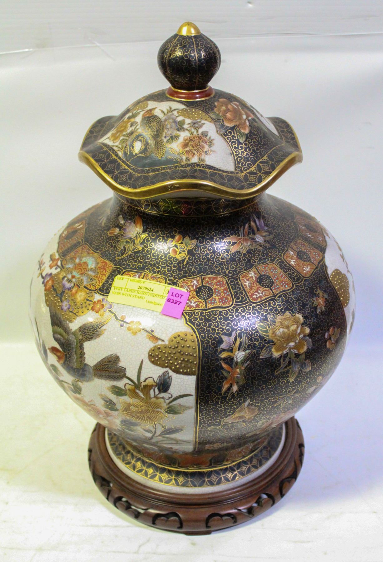 VERY LARGE HAND PAINTED ASIAN VASE WITH STAND