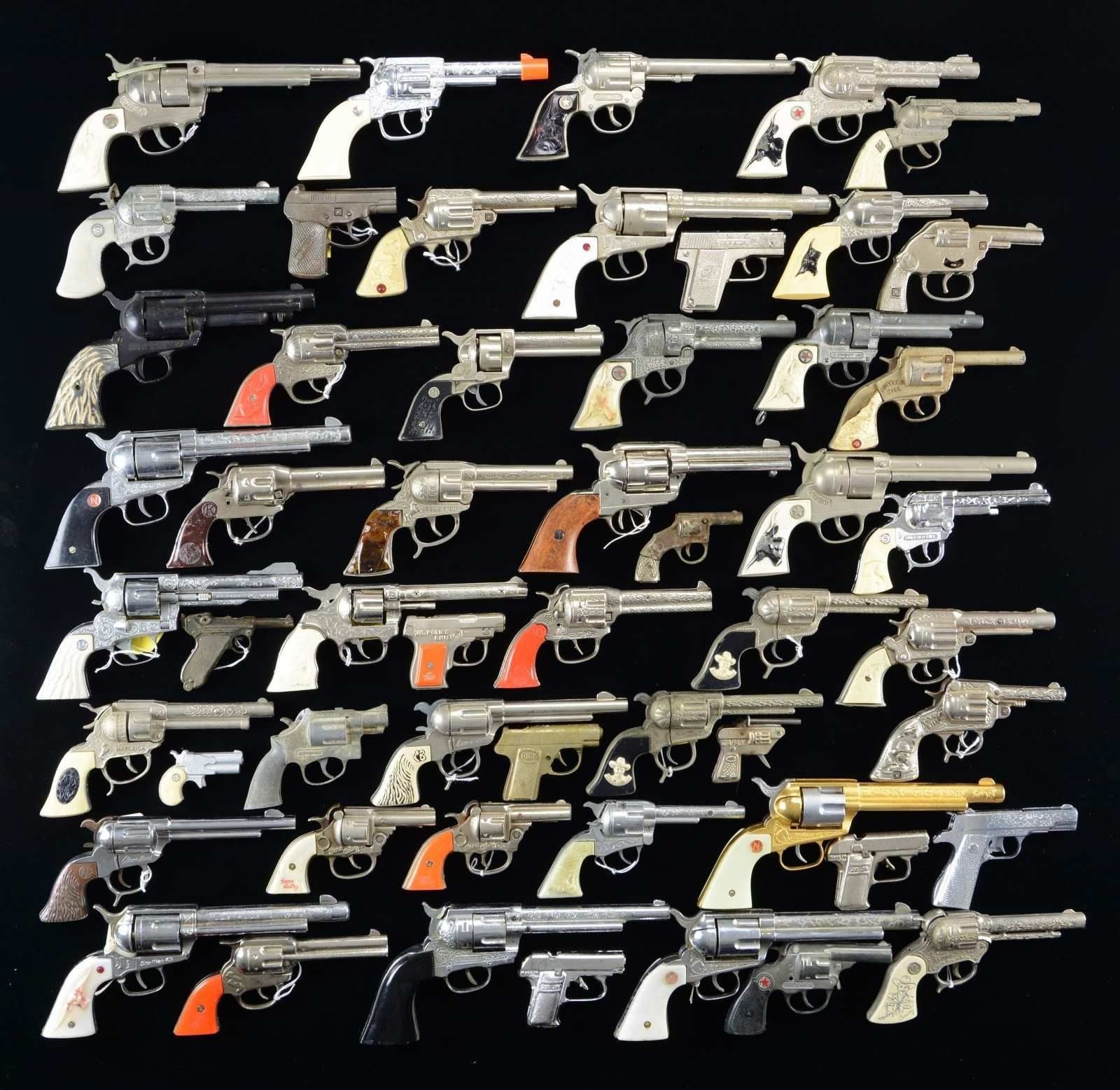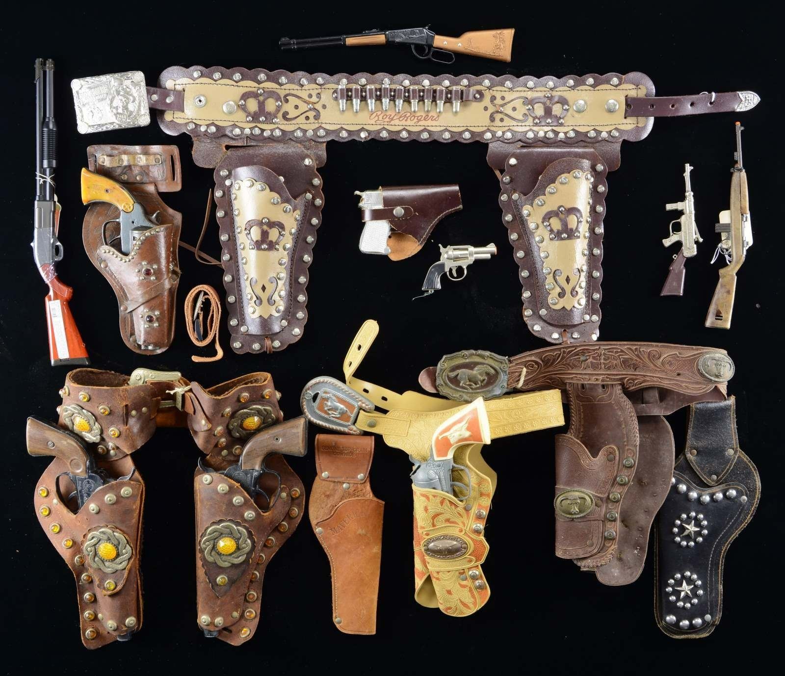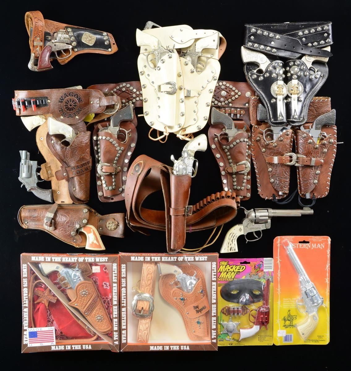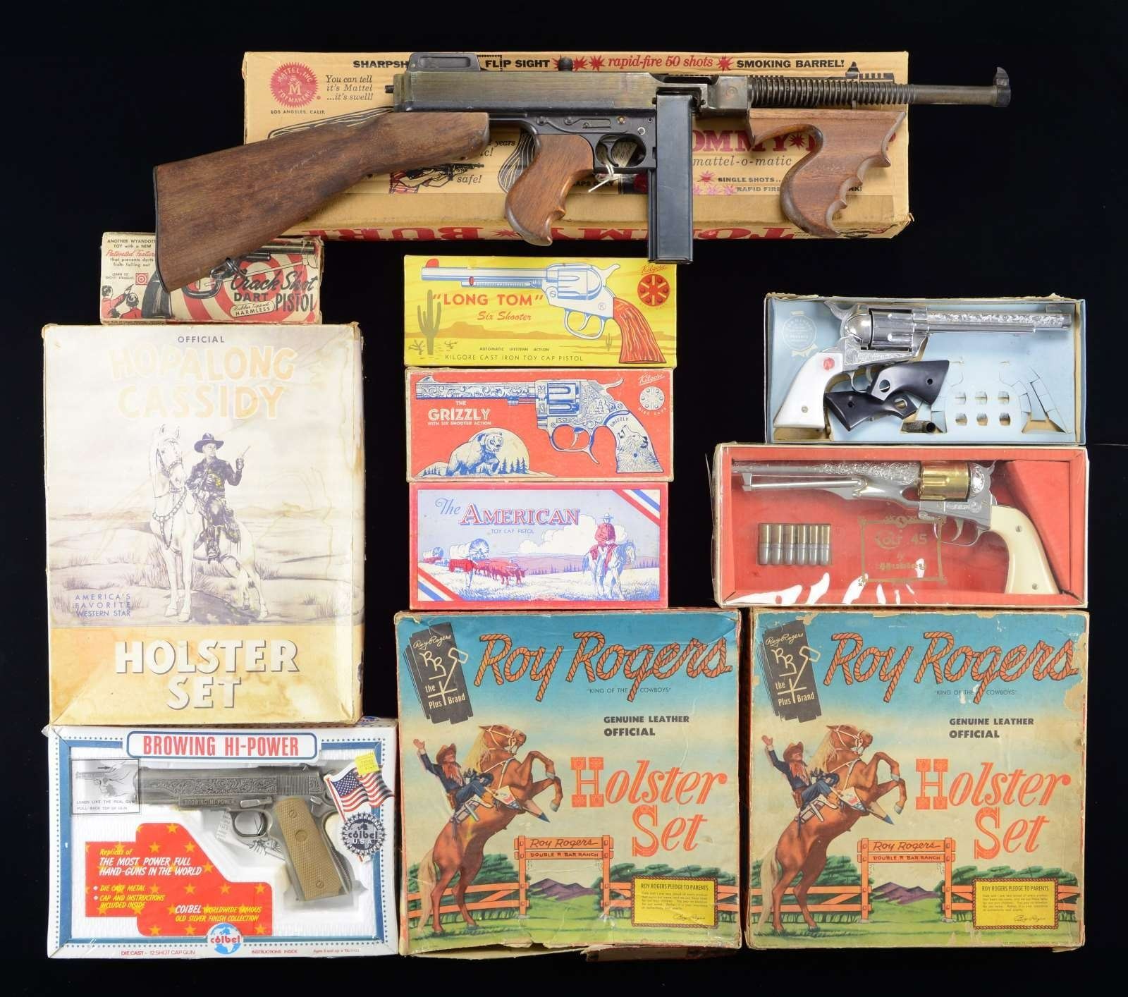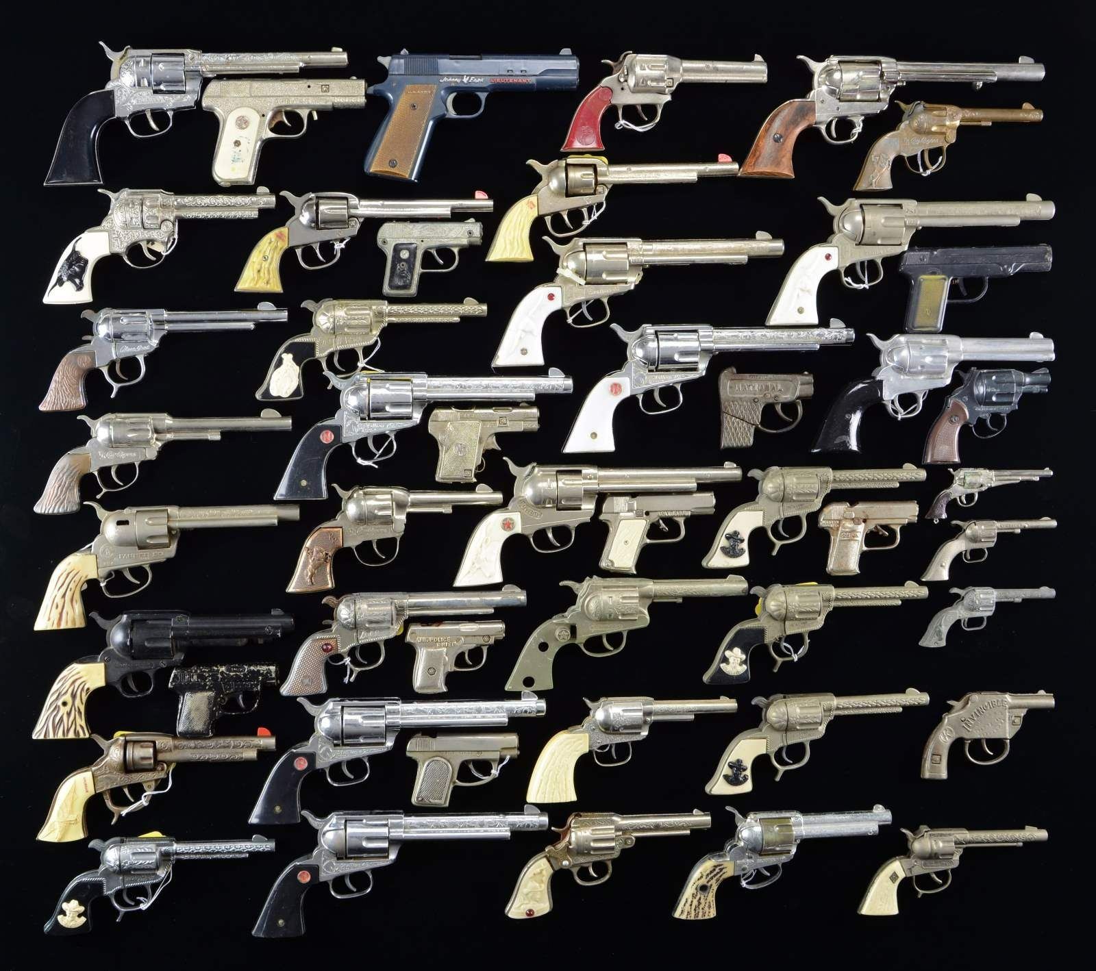 Varied lot of approximately 188 cap & toy guns. Guns are of varying sizes from small to large. Many are based on the Single Action Army revolver, other famous cap gun models include a Thompson SMG, Luger, Colt 1903 hammerless pocket & 1911 pistols. Gun brands included Stallion, Kilgore, Hubley, Masked Man, Roy Rogers & Hopalong Cassidy. A shotgun BBQ lighter is also present. About 25 toy holsters are present & some have belts. CONDITION: a minority of guns are sealed in their factory packaging w/ accessories. Majority of guns are loose & vary in condition from poor to very good. Some maybe missing parts. (02-21205/MJC). $800-1200.