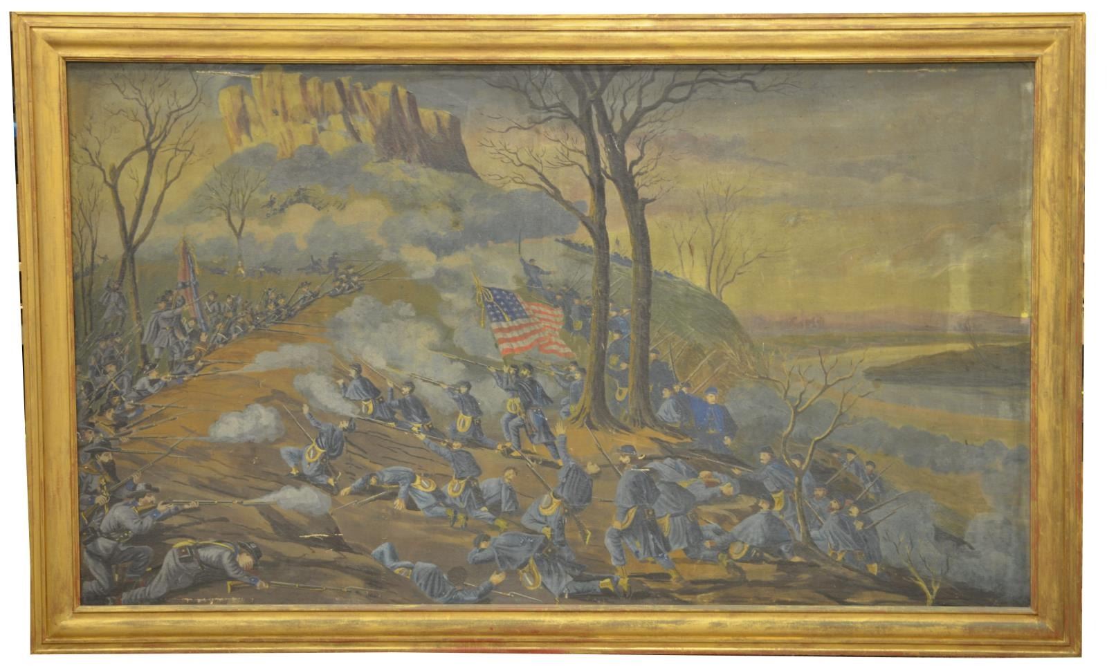 BATTLE OF LOOKOUT MOUNTAIN GEORGIA. This painting is housed in a frame measuring 90 3/4" x 55 1/2". The sight size of the painting is 82 1/4" x 47". An exceptionally folky and charming view of a Union charge against Confederate breastworks at the Battle of Lookout Mountain, Georgia. The well detailed painting was likely done shortly after 1889, when the famous "Battle of Lookout Mountain" lithograph was published by Kurz and Allison. The Civil War Battle of Lookout Mountain was fought November 24, 1863 as part of the Chattanooga Campaign. Union forces under Major General Joe Hooker assaulted Lookout Mountain and defeated the Southern forces under Major General Carter Stevenson. CONDITION: painting is a bit dirty and would benefit greatly from a professional cleaning. There is an old repaired hole 4" down from the top on the left side. There are currently 3 small separations in the canvas. There is a 6" separation at the top left, a 4" separation at the bottom left and a 2" separation at the bottom center. There is little or no paint loss associated with the separations, therefore restoration should prove to be quite straightforward. (02-17363/BF). $3,000-4,000.