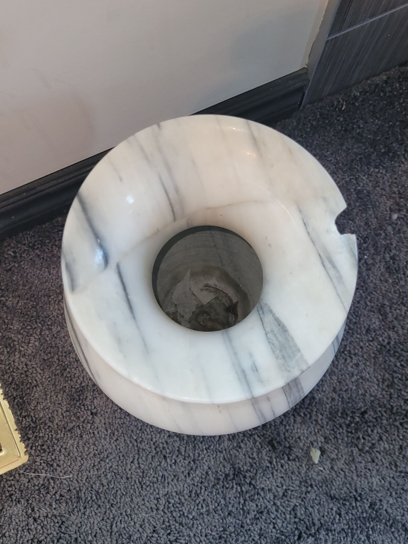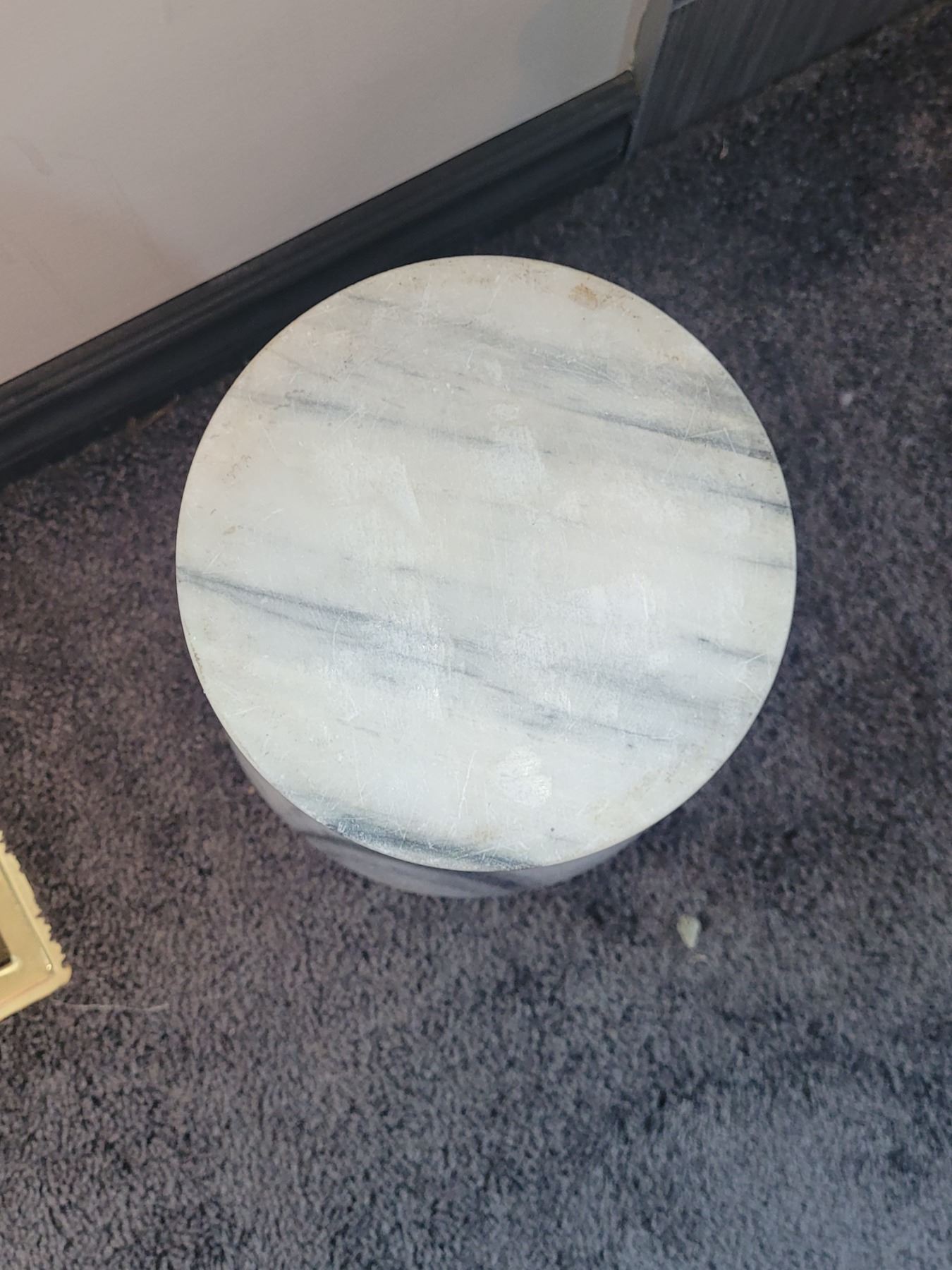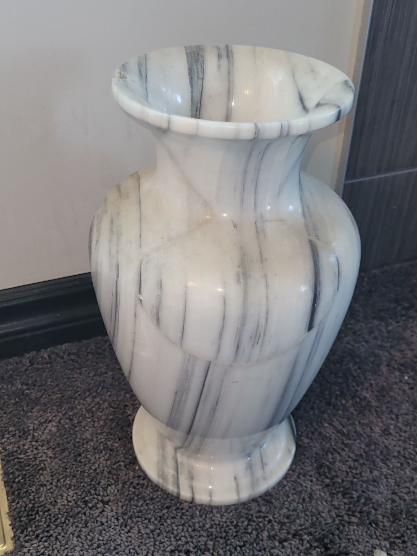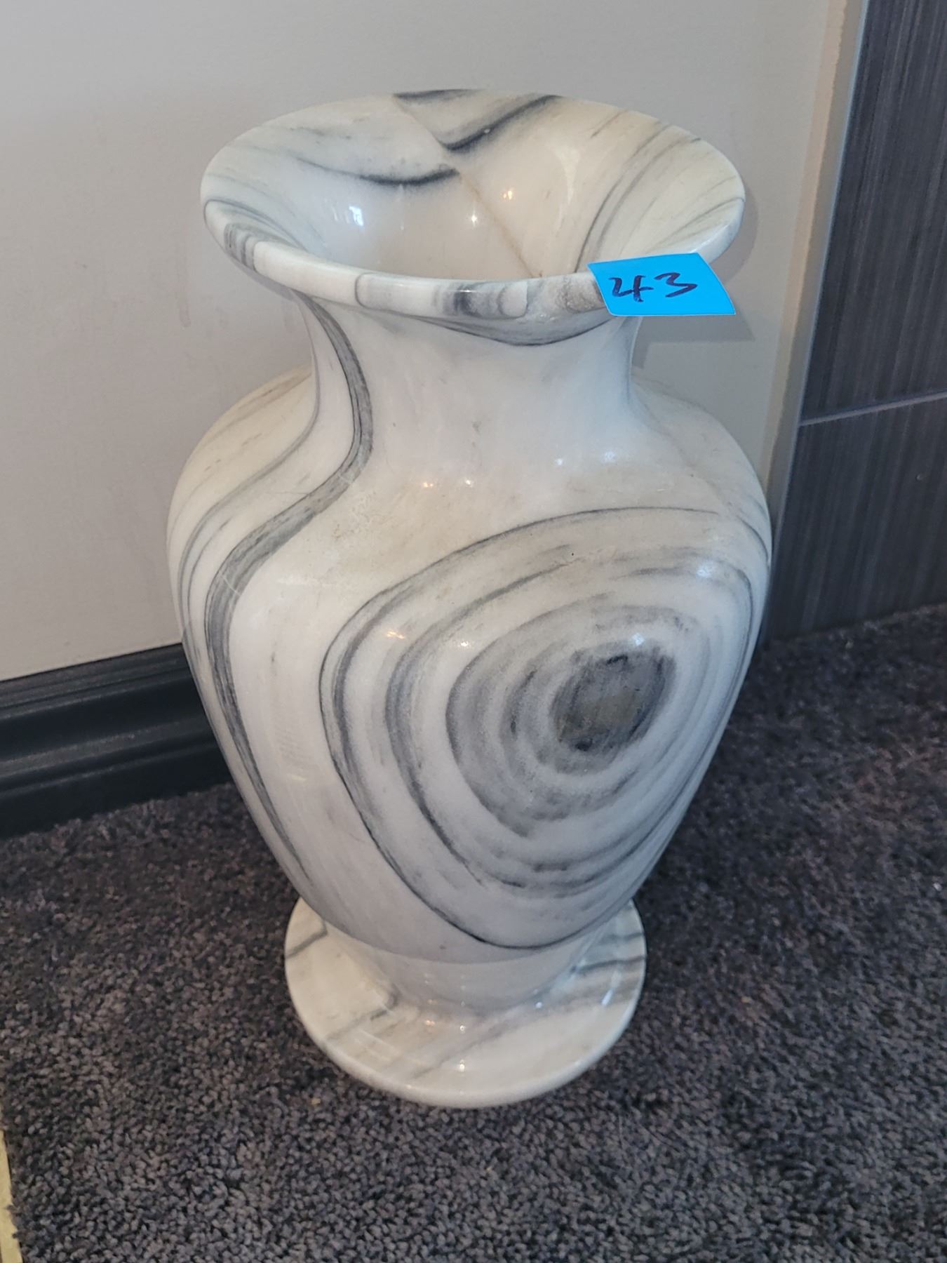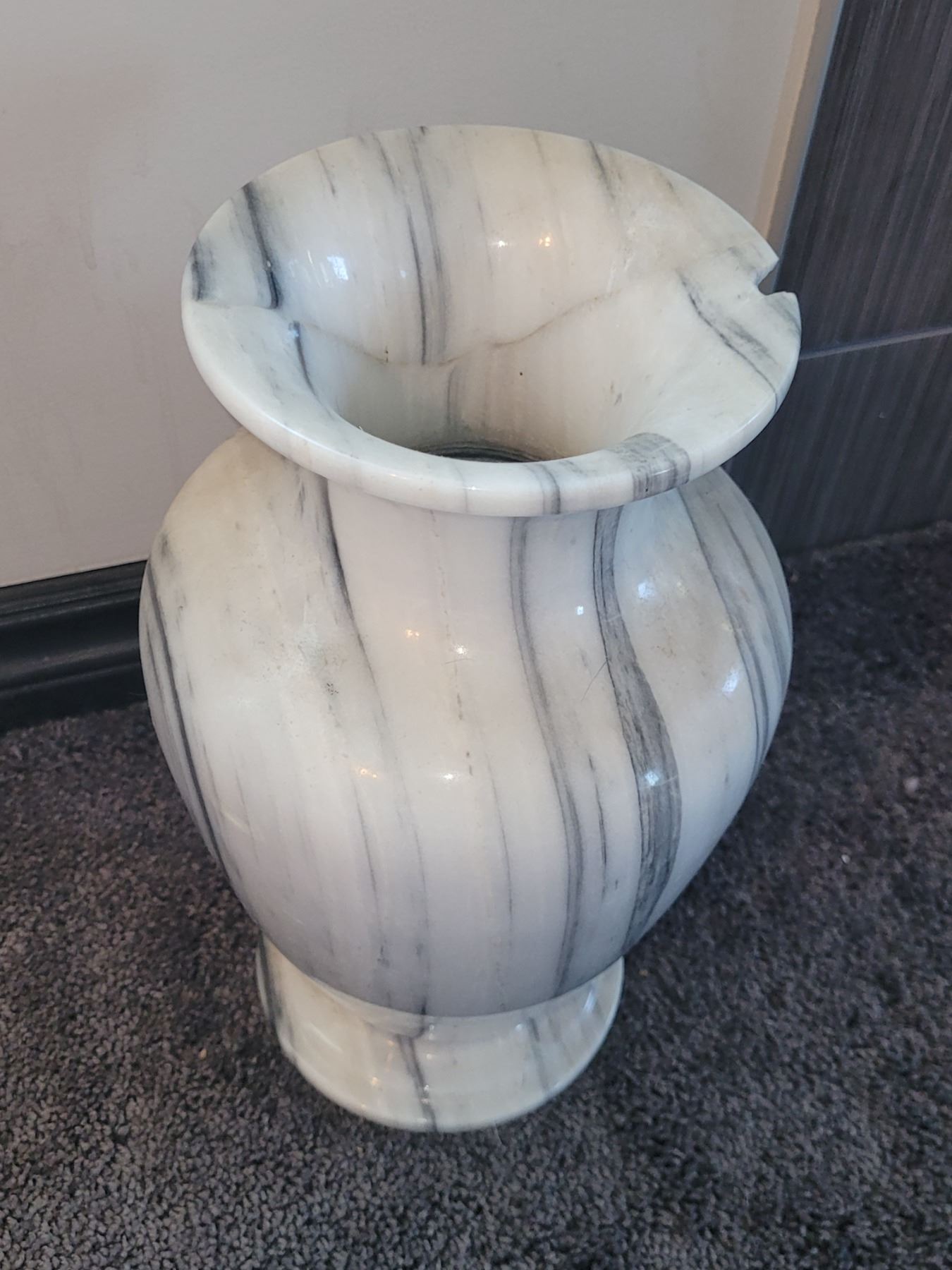 VERY LARGE SOLID MARBLE VASE. HAS CHIP. MEASURES 13.5" X 8". VERY HEAVY.