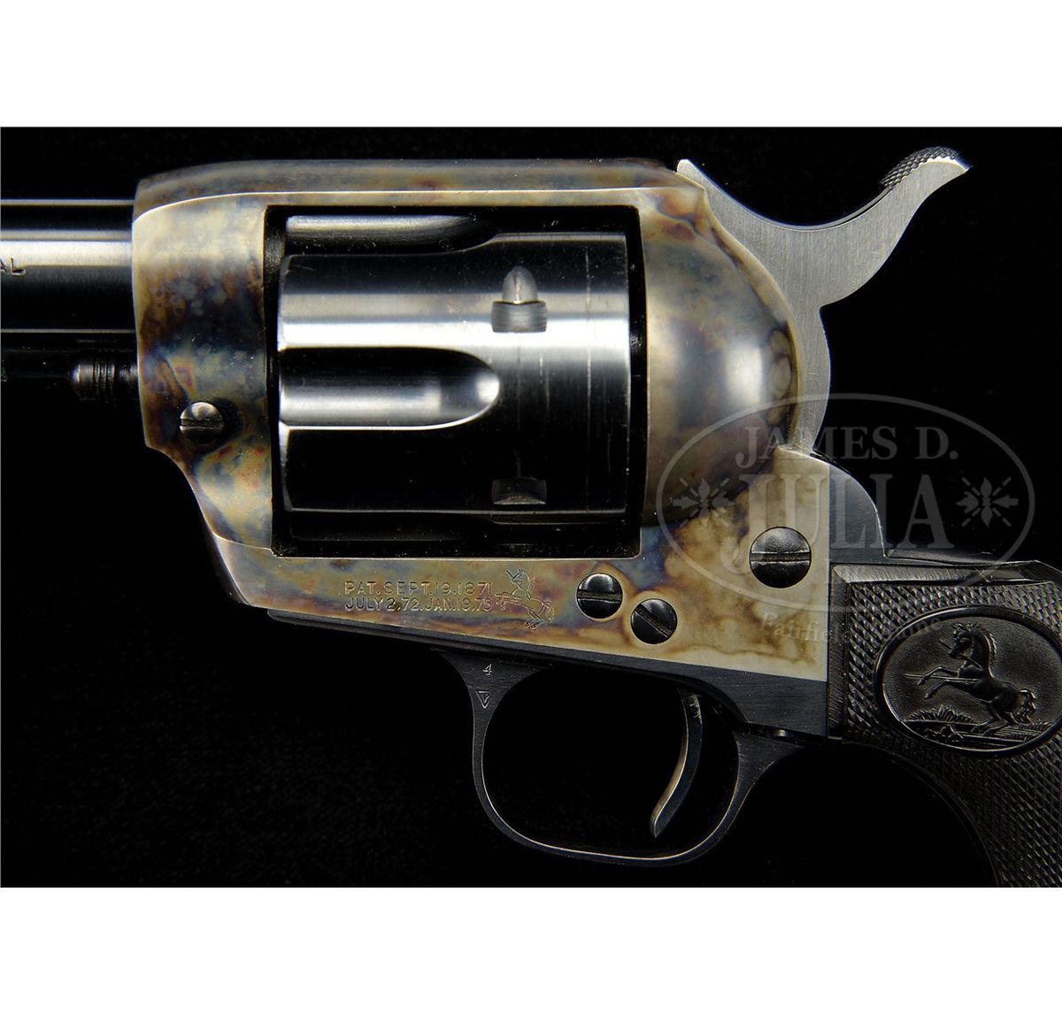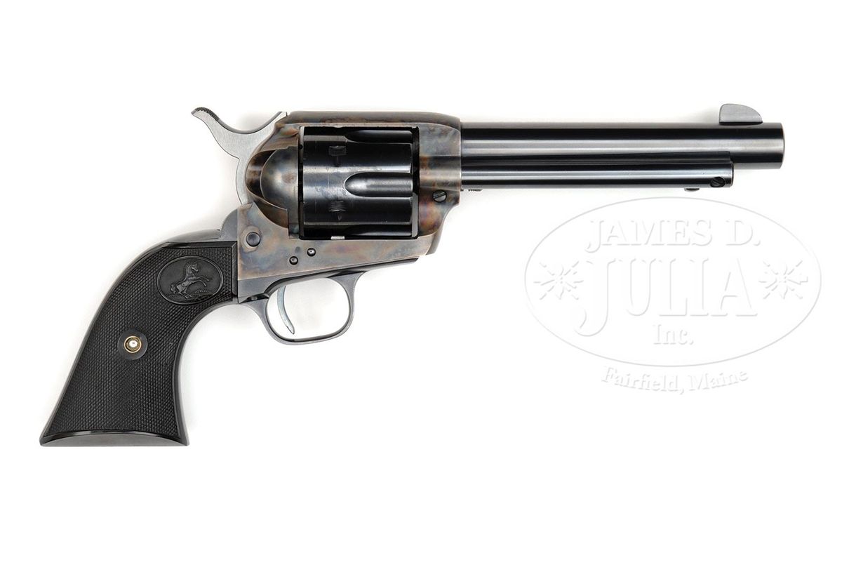 SN 357034. Cal. 38 Spcl. Blue & color case hardened with 5-1/2" bbl, full thick front sight and 1-line block letter address with model & caliber marking on left side. Left side of frame has 2-line, 3-patent dates and rampant Colt. Mounted with rampant Colt hard rubber grips that are matching numbered to this revolver. Right side of front & back straps, under the grip, are marked with matching SN and rear face of cyl has last two digits of matching SN. This revolver appears to have been produced in 1940 just before WWII when Colt stopped production to gear up for the government orders of WWII. A large number of these revolvers were sent to England on the lend/lease program, most of which have not returned to the U.S. CONDITION: Crisp & near new, has been fired but very little. Overall retains bright orig factory blues and about all of its orig case colors, brilliant in the sheltered areas, strong elsewhere; cyl has a couple of small lines. Grips are equally new showing faint diamond point wear. Mechanics are crisp, brilliant shiny bore. 4-48776 JR326