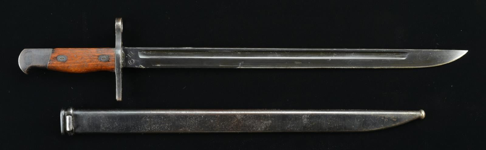 15 3/4" fullered bayonet; forward 10 1/2" of blade has been sharpened w/ arsenal quality workmanship. Marked on right ricasso w/ interlocking circles & 2 lines inside diamond. Marking is reportedly of Howa Jyuko arsenal under Nagoya supervision. Straight cross guard; smooth hardwood grips, birdshead pommel marked with S#. Unmarked blued steel scabbard.