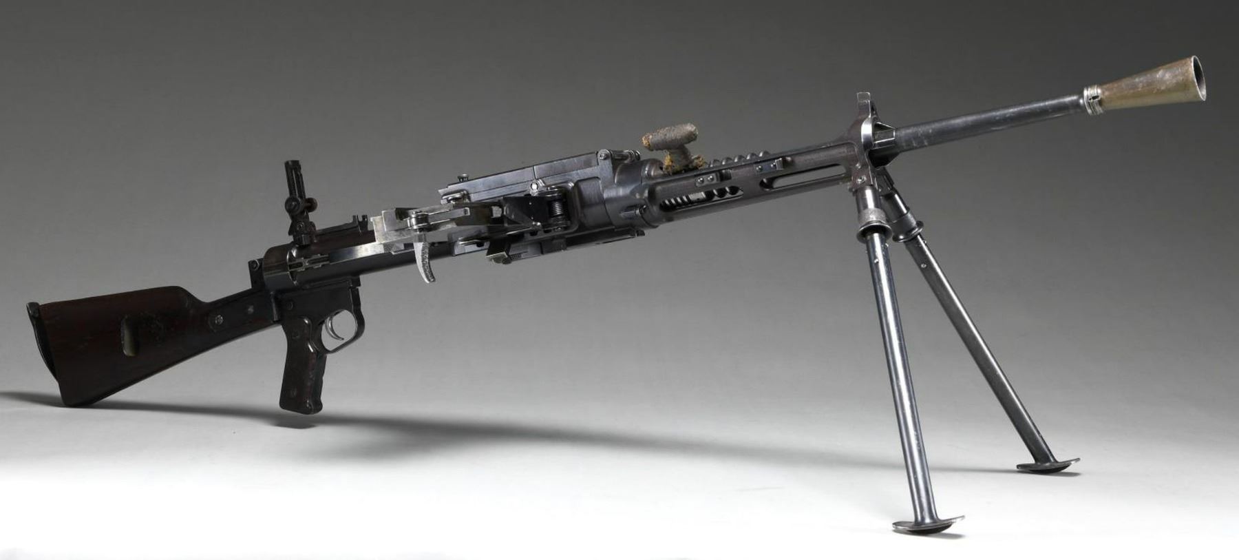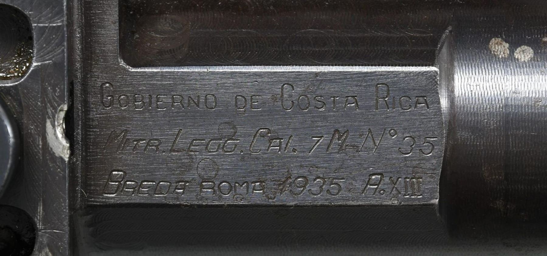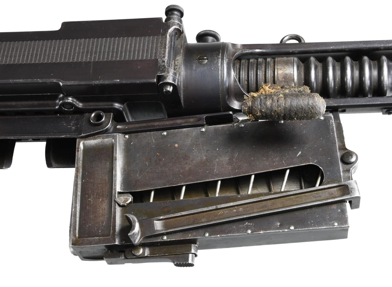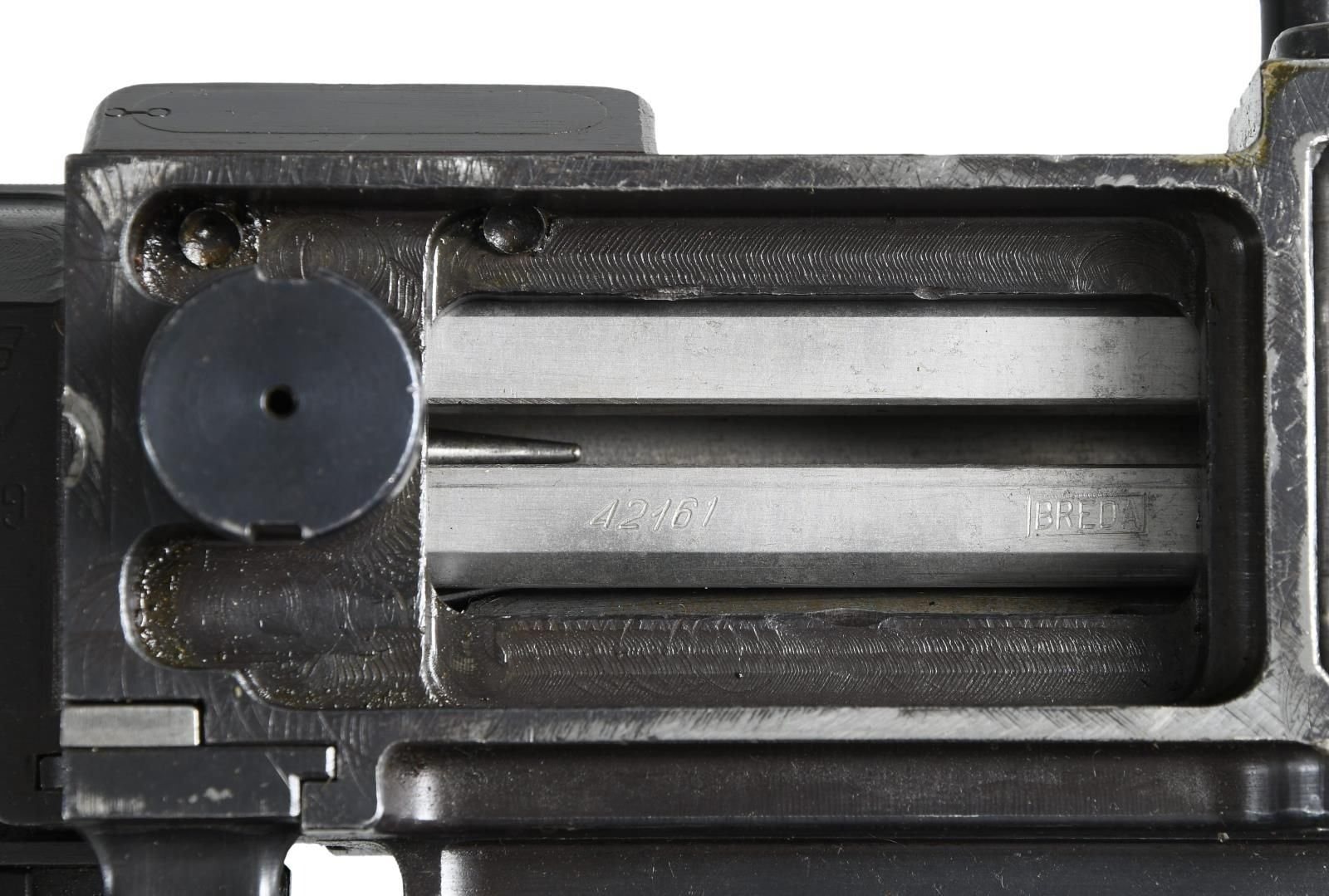 Cal. 7mm Mauser. S# 35. Bbl.19.5. Mfg. 1935. The Breda Model 30 was designed following the late 1920's machine gun trials. While it was one of the first to utilize a quick change barrel, it had several rather unusual features that were not as popular. It utilizes a closed bolt, delayed blowback operating system w/ a recoiling barrel, similar to the system in the Model 1914 Revelli. To aid in extraction, it was designed w/ an integral oil pump to lubricate cartridges during feeding. The oil reservoir is typically located inside the top cover w/ a spring loaded ball detent delivering lubrication as the rounds are fed into the operating system. There is no such oil apparatus nor fill cover present on this example, obviously manufactured to function without the additional lubrication. It is fed from a right side, non-detachable 20 rd. magazine that pivots forward of the action and reloaded w/ a horseshoe type stripper clip. The magazine can be locked in either position for loading, firing or transport. The actual feed lips are inside the receiver of the gun, not part of the magazine body. The bolt is massive, w/ multiple locking lugs in a configuration somewhat similar to the United States M16's bolt face. The action is charged w/ a right side mounted, non-reciprocating charging handle that can be locked to the rear to hold the bolt open if desired. The Model 30's were typically chambered in 6.5mm though some, such as this example, built for export to Costa Rica, were chambered in 7mm Mauser. The barrel is terminated w. a 3.5" cone flash hider at the muzzle & easily identified by the 5" area of cooling fins, forward of the chamber. Removing the quick change barrel is as easy as pulling the release, located on the left side of the receiver, forward of the top cover, and swinging it down. The barrel can them be slid forward, then pulled up and out to the rear. The front sight is a dovetailed, unprotected blade & the rear sights are elevation adjustable from 500-2000 meters, & fold forward to reveal a simple notch for closer quarters. Mounted below the front sight is a rear-folding bipod, providing 13" of elevation from the ground. It locks tightly in both extended & retracted positions. The heavy receiver is tubular in design, containing the entire trigger group inside the rearmost 2". It utilizes a unique telescoping, spring loaded firing pin which is held captive in this small area. The safety of the Model 30 is located at the rear of the receiver in the form of a small locking lever. Hardwood shoulder stock employs a steel butt plate w/ top folding shoulder rest to aid in support & control. The trigger is located inside a slightly elongated trigger guard, below the rear sight. Pistol grip has serrated wooden grip panels. Marked on top of receiver "GOBIERNO DE COSTA RICA / MITR. LEGG. CAl. 7M N 35 / BREDA ROMA 1935 A. XIII". MAGS: 1 integral 20rd. UNATTACHED ACCESSORIES: 1 spare barrel, chambered in 6.5 Carcano. CONDITION: Receiver finish is complete & consistent w/ nice coverage. Barrel & bipod exhibit more finish thinning. Butt stock has some deep impressions though retains full structural integrity. All parts move fluidly, obviously being properly maintained. Lightly frosted bore w/ worn rifling. Fire control mechanism appears to function correctly when cycled by hand. PROVENANCE: Formerly on loan to the Evergreen Aviation & Space Museum. NATIONAL FIREARMS ACT MG REQUIRING BATF TRANSFER BEFORE TAKING POSSESSION. FULLY TRANSFERABLE.(03-1626/JZ). CURIO CLASS III. $5,000-8,000.