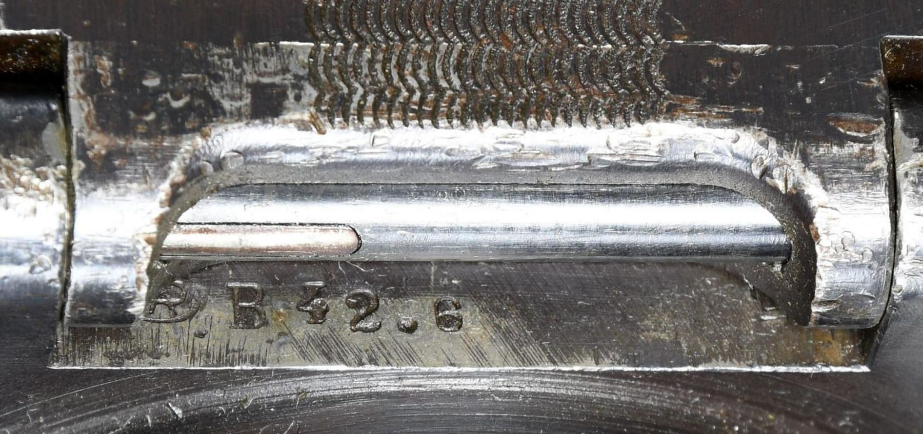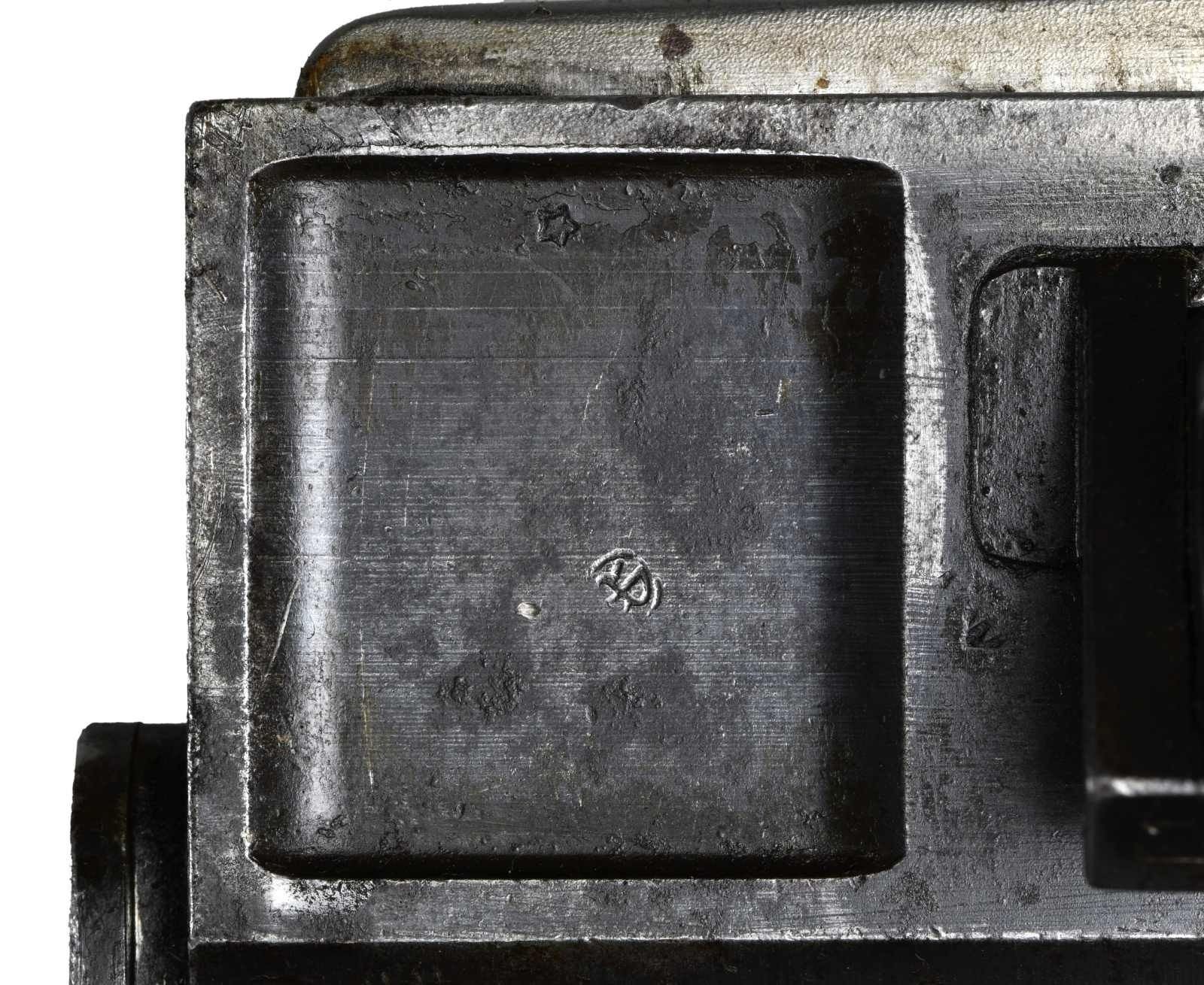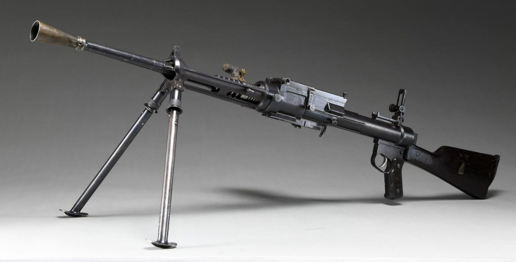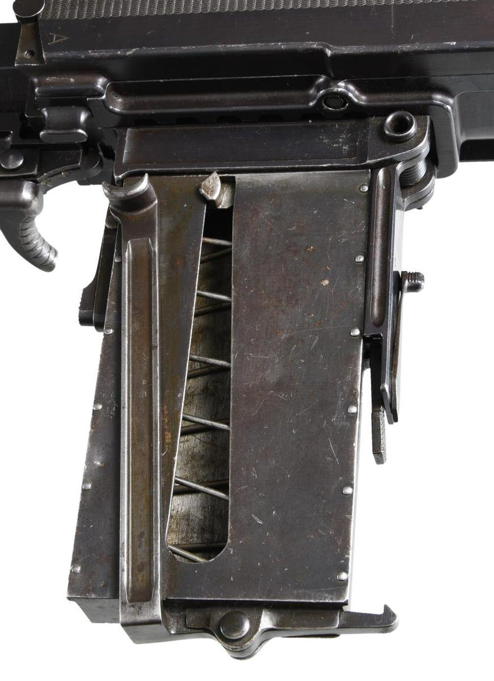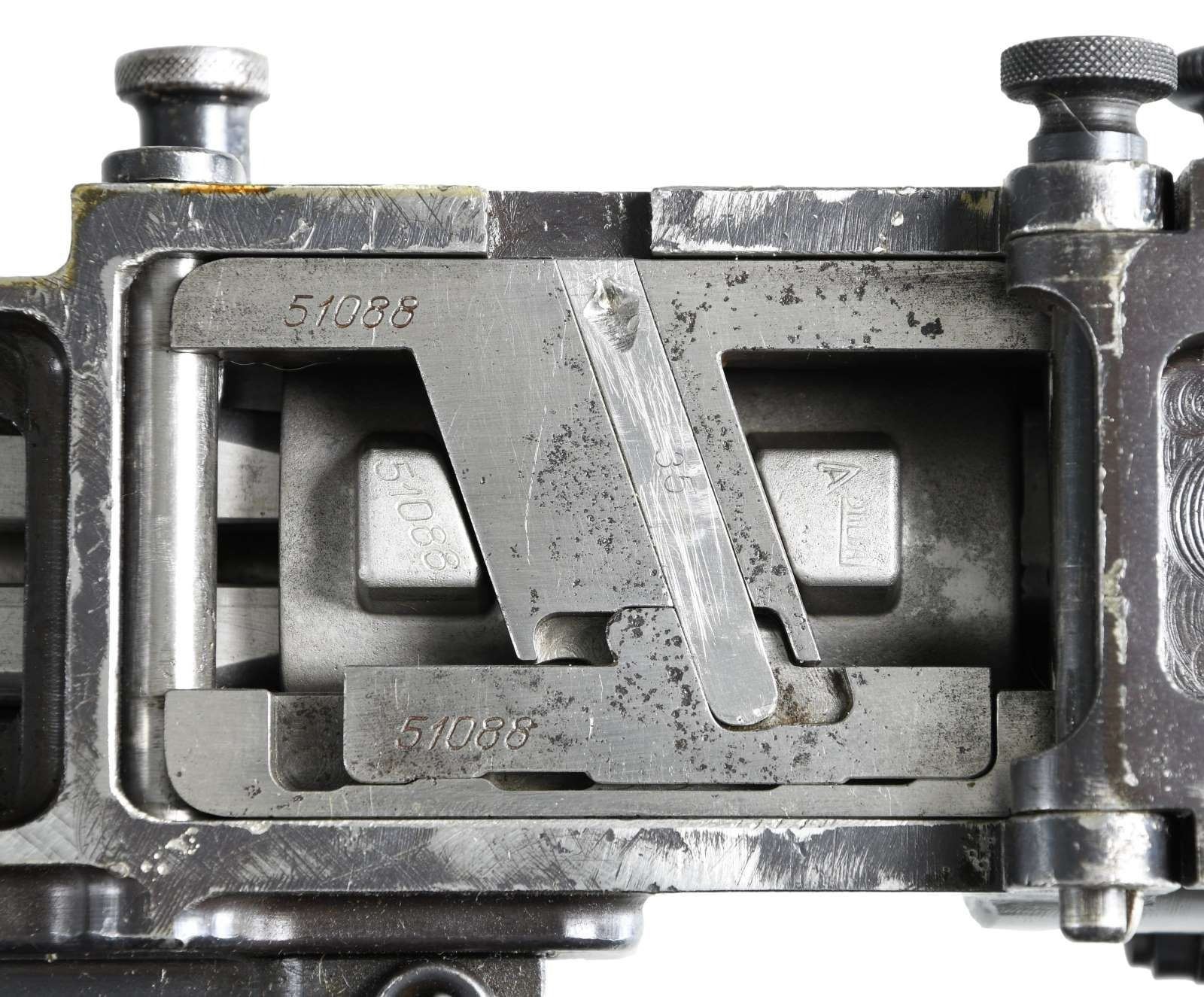 Cal. 7mm Mauser. S# 35. Bbl.19.5. Mfg. 1935. The Breda Model 30 was designed following the late 1920's machine gun trials. While it was one of the first to utilize a quick change barrel, it had several rather unusual features that were not as popular. It utilizes a closed bolt, delayed blowback operating system w/ a recoiling barrel, similar to the system in the Model 1914 Revelli. To aid in extraction, it was designed w/ an integral oil pump to lubricate cartridges during feeding. The oil reservoir is typically located inside the top cover w/ a spring loaded ball detent delivering lubrication as the rounds are fed into the operating system. There is no such oil apparatus nor fill cover present on this example, obviously manufactured to function without the additional lubrication. It is fed from a right side, non-detachable 20 rd. magazine that pivots forward of the action and reloaded w/ a horseshoe type stripper clip. The magazine can be locked in either position for loading, firing or transport. The actual feed lips are inside the receiver of the gun, not part of the magazine body. The bolt is massive, w/ multiple locking lugs in a configuration somewhat similar to the United States M16's bolt face. The action is charged w/ a right side mounted, non-reciprocating charging handle that can be locked to the rear to hold the bolt open if desired. The Model 30's were typically chambered in 6.5mm though some, such as this example, built for export to Costa Rica, were chambered in 7mm Mauser. The barrel is terminated w. a 3.5" cone flash hider at the muzzle & easily identified by the 5" area of cooling fins, forward of the chamber. Removing the quick change barrel is as easy as pulling the release, located on the left side of the receiver, forward of the top cover, and swinging it down. The barrel can them be slid forward, then pulled up and out to the rear. The front sight is a dovetailed, unprotected blade & the rear sights are elevation adjustable from 500-2000 meters, & fold forward to reveal a simple notch for closer quarters. Mounted below the front sight is a rear-folding bipod, providing 13" of elevation from the ground. It locks tightly in both extended & retracted positions. The heavy receiver is tubular in design, containing the entire trigger group inside the rearmost 2". It utilizes a unique telescoping, spring loaded firing pin which is held captive in this small area. The safety of the Model 30 is located at the rear of the receiver in the form of a small locking lever. Hardwood shoulder stock employs a steel butt plate w/ top folding shoulder rest to aid in support & control. The trigger is located inside a slightly elongated trigger guard, below the rear sight. Pistol grip has serrated wooden grip panels. Marked on top of receiver "GOBIERNO DE COSTA RICA / MITR. LEGG. CAl. 7M N 35 / BREDA ROMA 1935 A. XIII". MAGS: 1 integral 20rd. UNATTACHED ACCESSORIES: 1 spare barrel, chambered in 6.5 Carcano. CONDITION: Receiver finish is complete & consistent w/ nice coverage. Barrel & bipod exhibit more finish thinning. Butt stock has some deep impressions though retains full structural integrity. All parts move fluidly, obviously being properly maintained. Lightly frosted bore w/ worn rifling. Fire control mechanism appears to function correctly when cycled by hand. PROVENANCE: Formerly on loan to the Evergreen Aviation & Space Museum. NATIONAL FIREARMS ACT MG REQUIRING BATF TRANSFER BEFORE TAKING POSSESSION. FULLY TRANSFERABLE.(03-1626/JZ). CURIO CLASS III. $5,000-8,000.