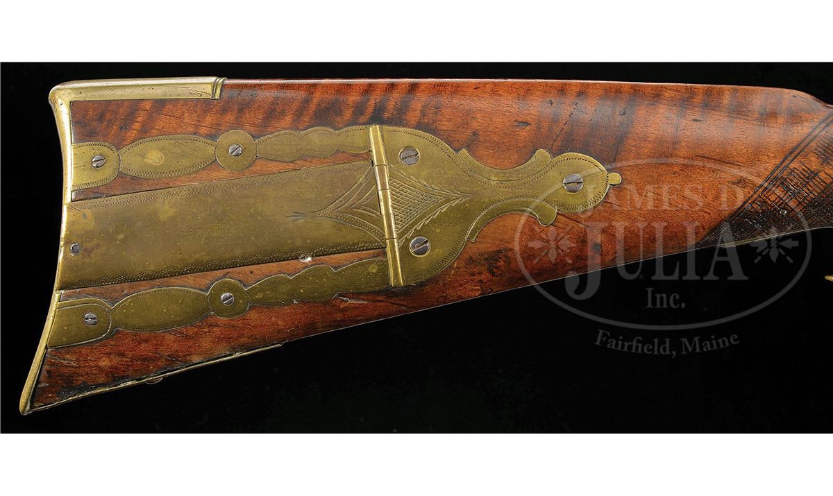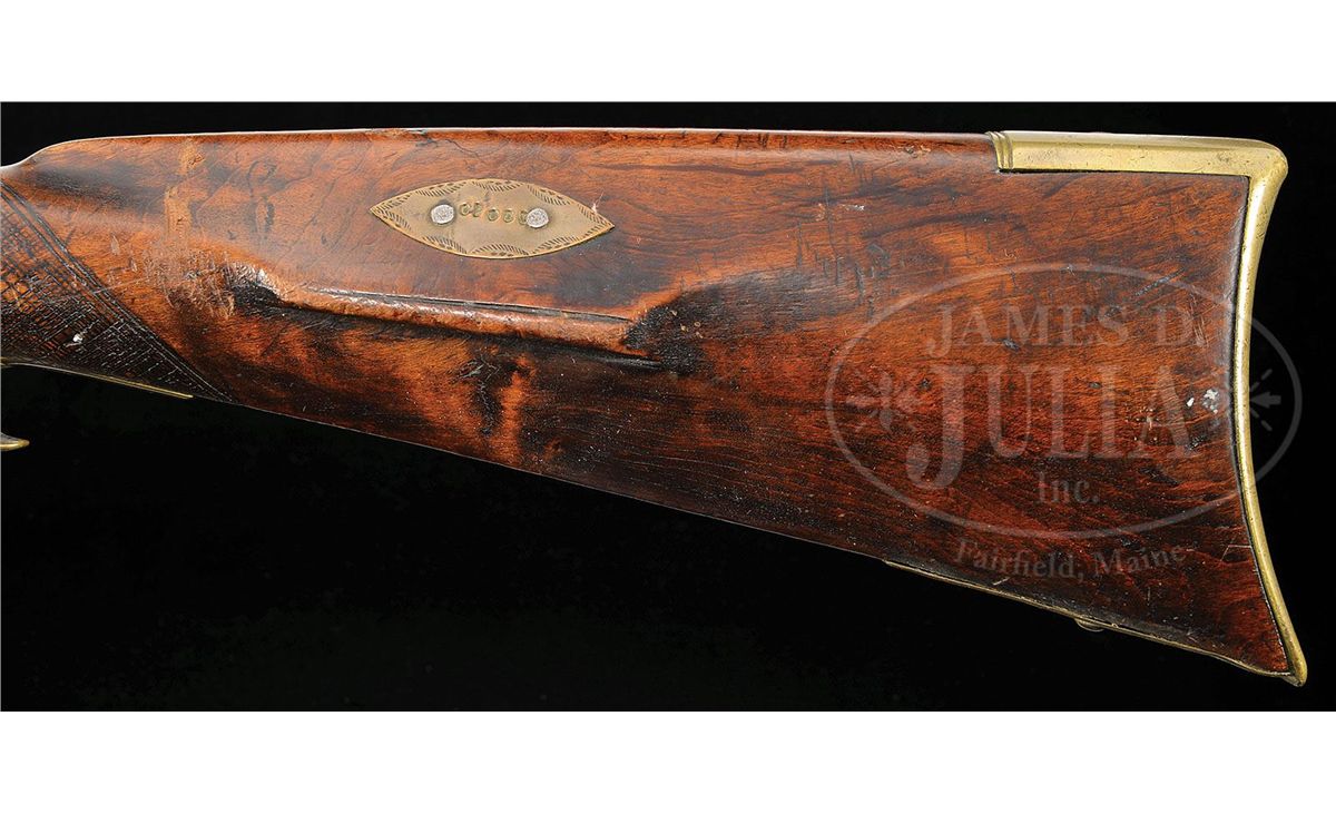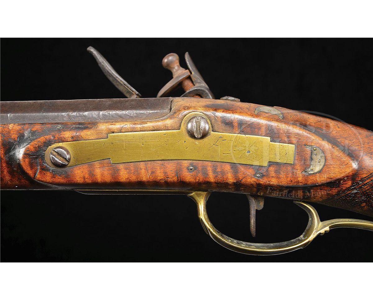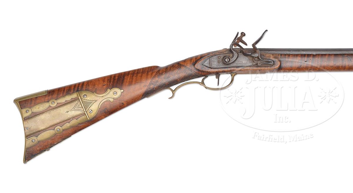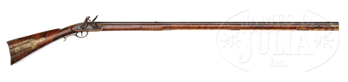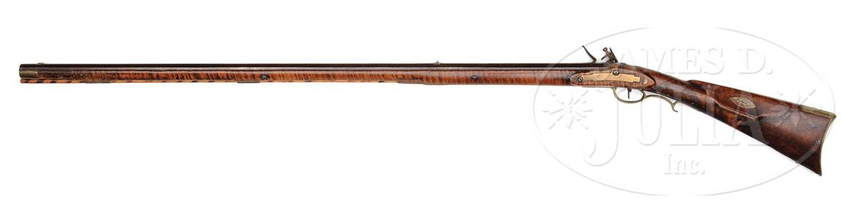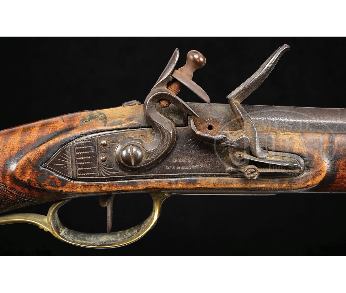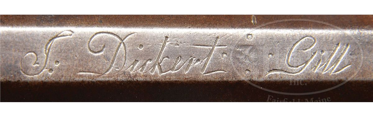 NSN. Cal. .52 rifled. This rifle has a 43" full oct bbl signed “J. Dickert & Gill”. Jacob Dickert and Benjamin Gill are listed as Lancaster gunsmiths in 1800. Gill died in 1786 and the partnership was legally dissolved in 1800. Flint lock is marked “Nock Warranted”. Rifle has an attractive four piece engraved patch box. Curly maple stock is checkered at the wrist and has three silver inlays plus one oval silver wrist inlay which is missing. Rifle has a flat brass Lancaster style side plate and a football shaped comb inlay that appears to have been stamped with the owners’ name at one time, now obliterated. PROVENANCE: Collection of Woody Frey. CONDITION: Very good. An 8" crack in the stock has been repaired on the left hand side at the muzzle, otherwise the rifle is in very good used condition throughout. 4-48484 RG2