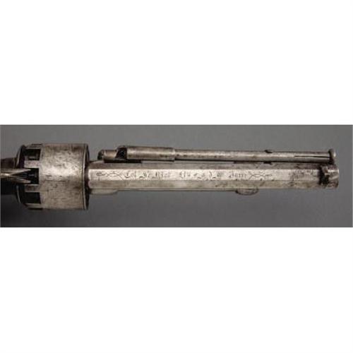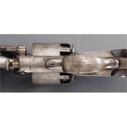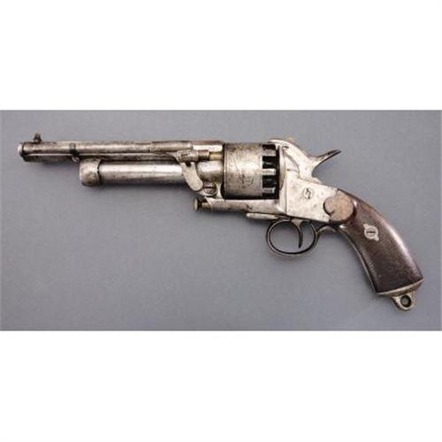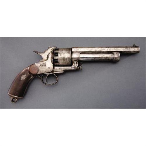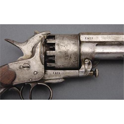 <B>VERY NICE SECOND MODEL LEMAT .42/63 CALIBER TEN SHOT PERCUSSION REVOLVER.</B></I> Serial #1573 matching. In the early stages of the development manufacture and marketing of this ingenious sidearm LeMat worked closely with P. G. T. Beauregard, subsequently one of the south’s outstanding generals. The devastating firepower provided by the 9 shot cylinder and 16 gauge shotgun barrel made it a favorite of Confederate officers and a considerable portion of the production of 2500 1st and 2d model revolvers found their way through the blockade and on to the battlefield. This is a classic example of a mid-range 2d model revolver that is correct and original in every respect. Marked on the top of the barrel “Col. LeMat Bte. S. G. D. G. Paris” in a scroll edged panel. Checkered 2 piece grips, integrally cast lanyard loop. This example made with loading lever catch. A very nice classic 2d model LeMat that doubtless saw Confederate service.<BR><BR><B>Condition:</B></I> All metal with smooth gray patina, just a couple of very tiny patches of light pitting and a few tool marks on the shotgun barrel and at the base of the barrel housing. Very good bores, mechanically perfect. Grips with smooth right age color, no cracks or chips.<BR><BR><b>Shipping:</b> Requires 3rd Party Shipping (<a target="_blank" href="http://www.heritageauctions.com/common/shipping.php">view shipping information</a>)