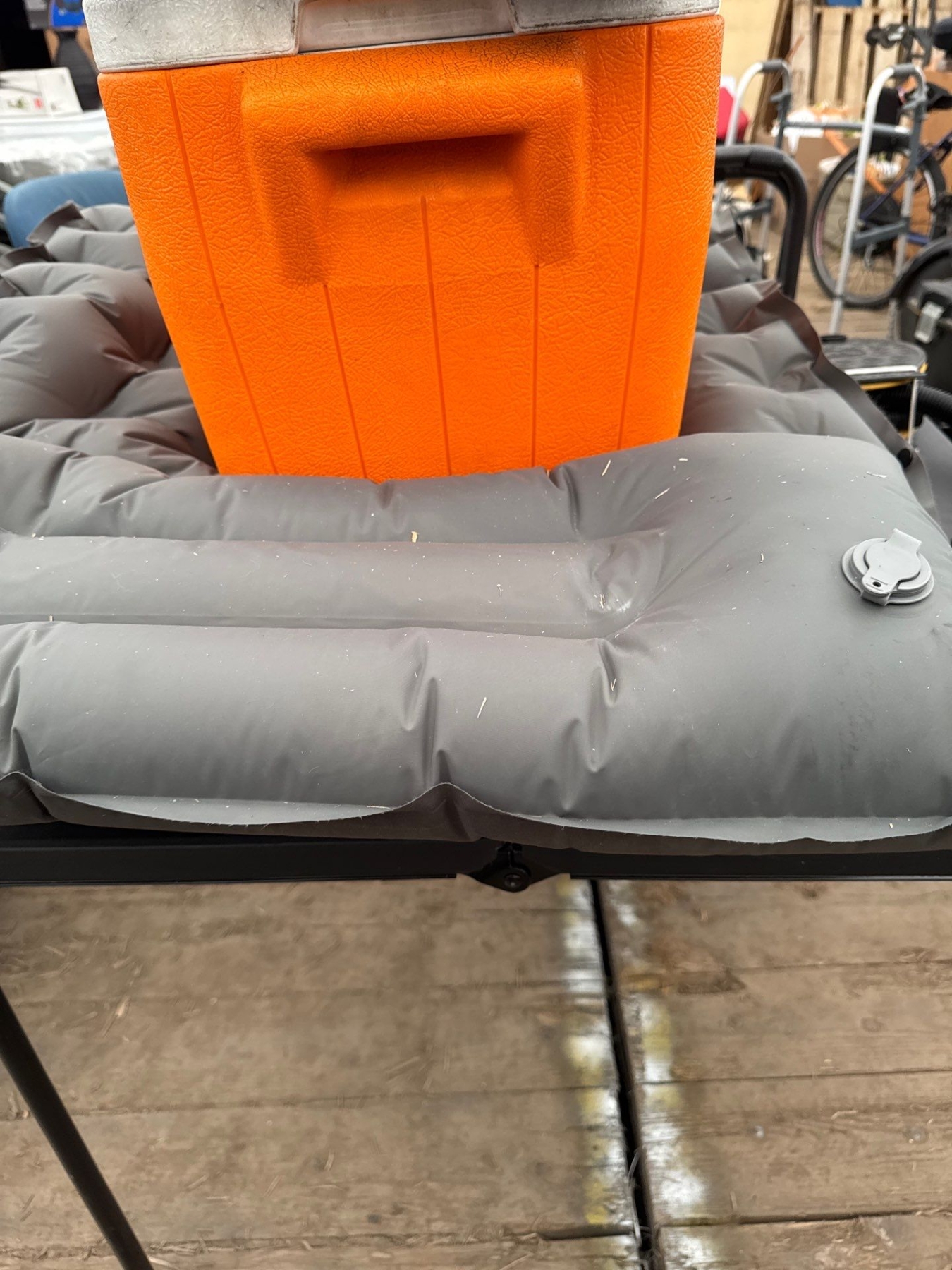 VERY NICE SINGLE AIR MATTRESS AND FOOT AIR PUMP COLEMAN POLY LIGHT COOLER AND TARP AND RECLINER CHAIR