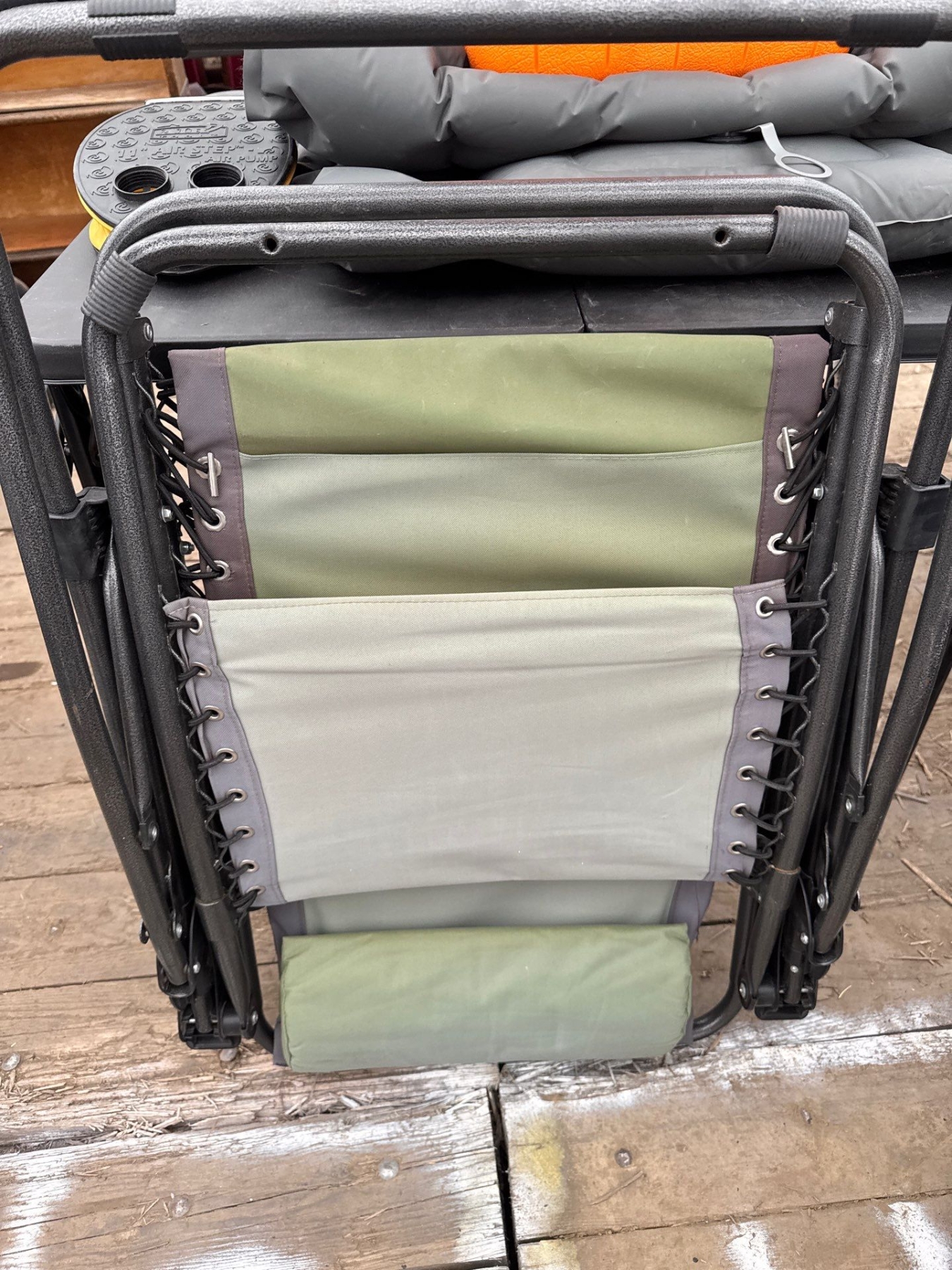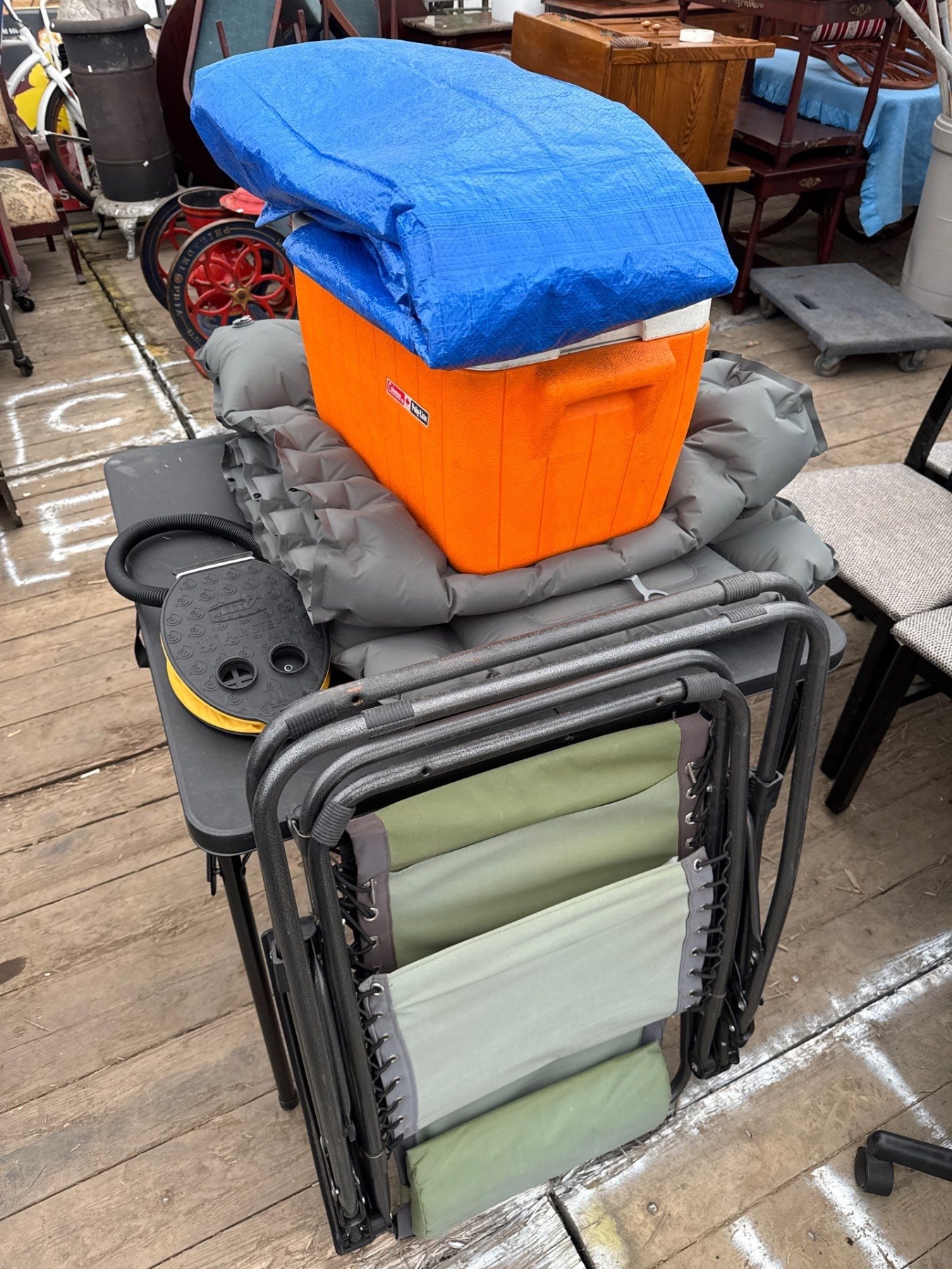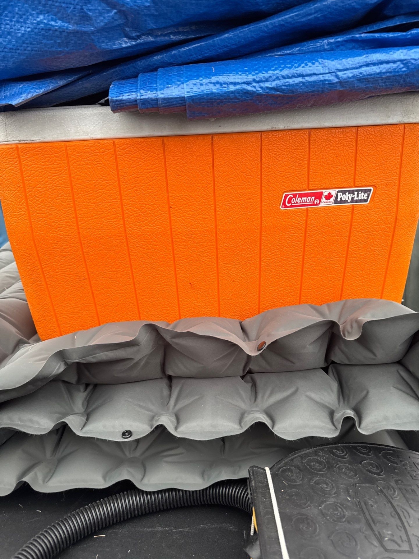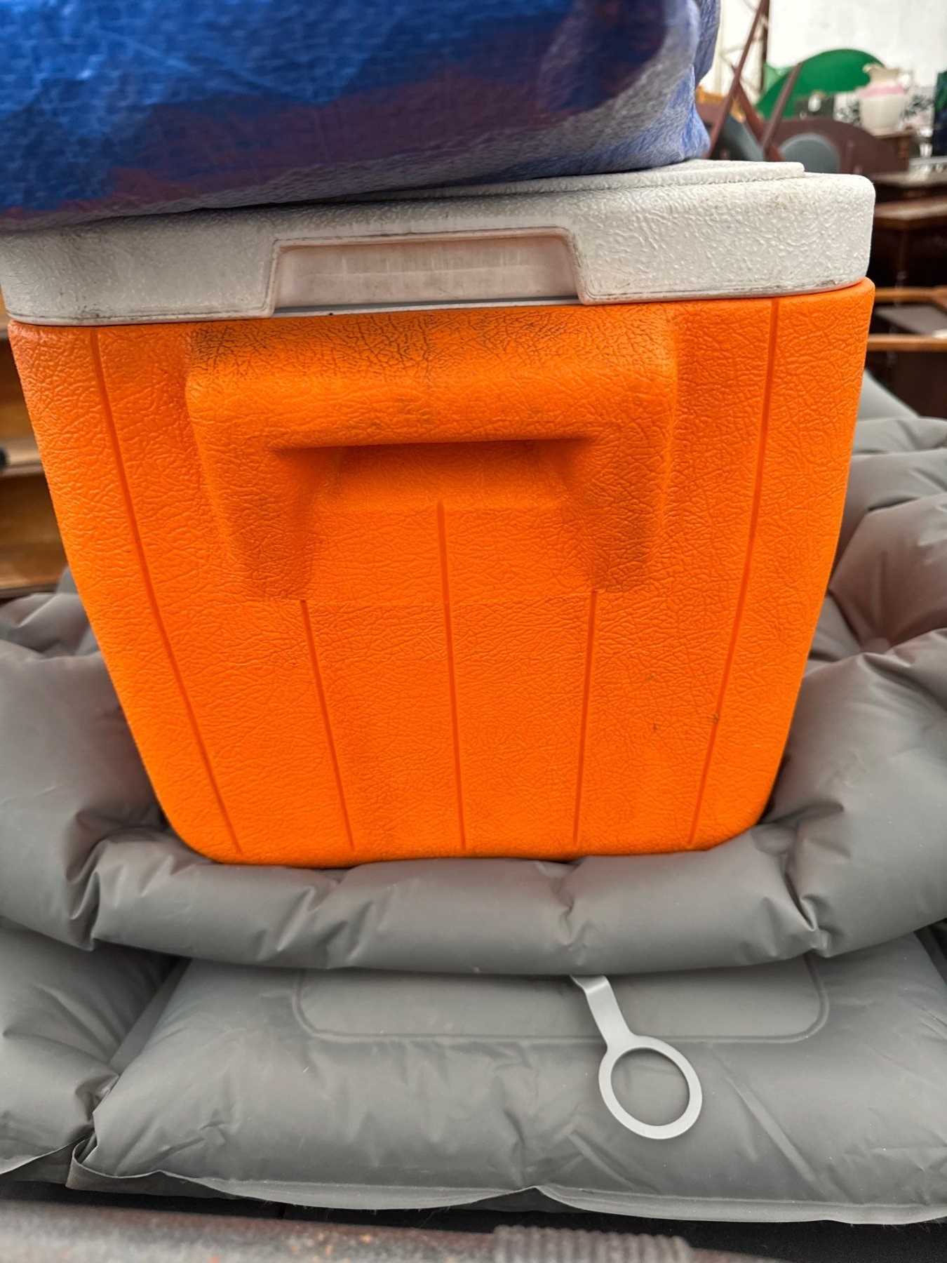 VERY NICE SINGLE AIR MATTRESS AND FOOT AIR PUMP COLEMAN POLY LIGHT COOLER AND TARP AND RECLINER CHAI