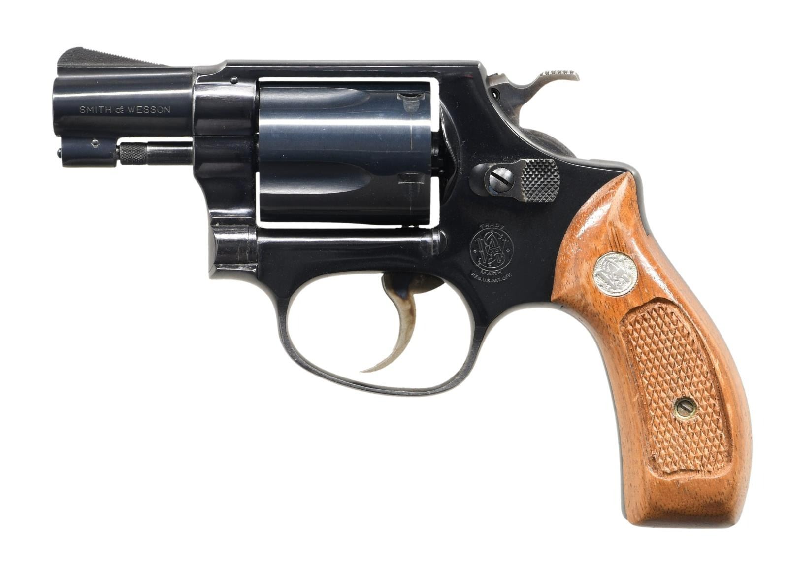 REVOLVER IN FACTORY BOX. Cal.38 Spl. S# 639762. Bbl. 2". Mfg.1966-1967. Double action revolver built on 3 screw, round butt, J frame. Blued finish. 5 shot fluted cylinder. 2" pinned barrel. This was the first S&W model in production on the J frame to accommodate the 38 Special cartridge. Small S&W logo on left side of frame. Thin, serrated ramp front & rear notch sights. Walnut checkered grips w/ S&W medallions. UNATTACHED ACCESSORIES: Factory numbered blue box w/ steel corners, wax paper & factory literature. CONDITION: Finish coverage is complete & consistent w/ very little sign of prior use. Light drag line on cylinder. Grips remain nice w/ well defined medallions. Bright bore w/ strong rifling. Timing appears to be correct. (23-2278/JZ). CURIO. $400-600.