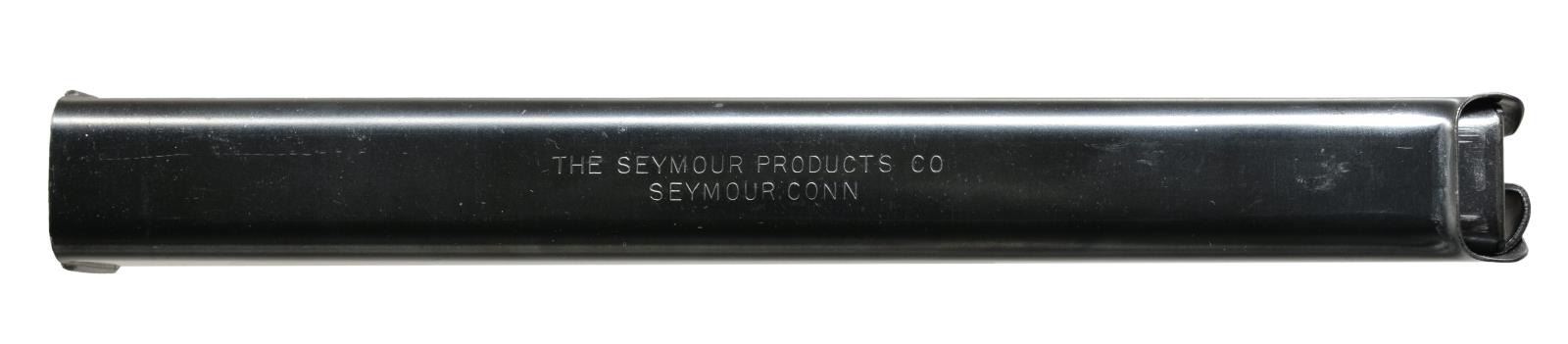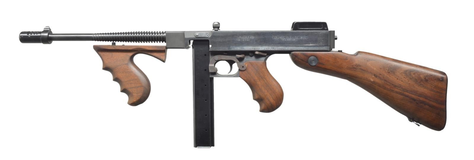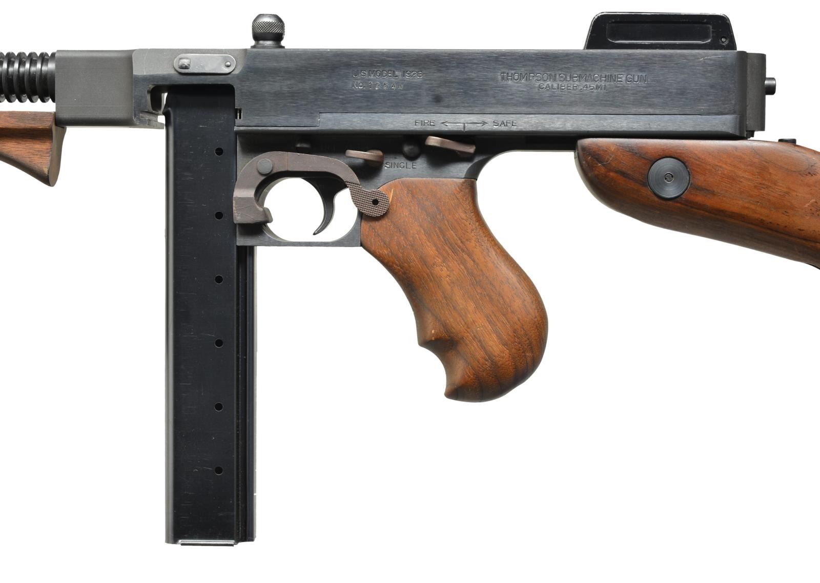 Cal. 45 ACP. S# 1954A. Bbl. 13" over brake. One of 2 consecutively numbered 1928s in this auction. A fine example of the highly desirable Model 1928 Thompson. From the 6" 27 finned bbl. section to the 2 1/2" slotted muzzle brake it is immediately recognizable as “the gun that made the 20s roar”. Complete w/ attractive hardwood vertical foregrip, pistol grip & quick detachable shoulder stock, the 1928 is capable of utilizing both stick mags. & the drums often associated w/ them. Blued finish on all exposed metal surfaces. Top mounted, knurled & slotted cocking handle. Front sight blade integral to compensator. Rear folding peep / ladder sight for engaging multiple distances. Markings are as follows: left side receiver “US MODEL 1928 – NO. 1954A”. “THOMPSON SUBMACHINE GUN – CALIBER .45M1”. Top of receiver marked w/ familiar Thompson trademark bullet logo. Right side receiver contains US patent block & “AUTO – ORDNANCE CORPORATION – WEST HURLEY, NEW YORK, U.S.A.”. MAGS: 30 rd. stick marked “THE SEYMOUR PRODUCTS CO. – SEYMOUR, CONN”. CONDITION: all exposed metal surfaces enjoy complete finish coverage aside from 1 sm. scratch on rear of receiver just below sight & very light thinning in areas of mechanical interface. Shoulder stock has a few light impressions typically caused in storage. Shiny bore w/ good rifling. Fire control mechanism appears to function correctly when cycled by hand & is extremely smooth. NATIONAL FIREARMS ACT SMG REQUIRING BATF TRANSFER BEFORE TAKING POSSESSION. FULLY TRANSFERABLE. (03-1502/JZ). CURIO CLASS III. $14,000-18,000.