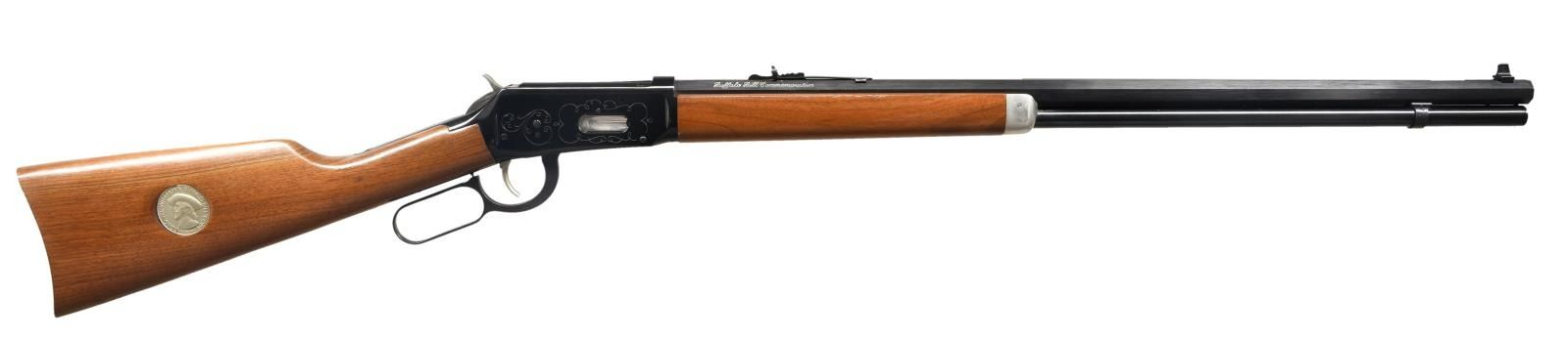 COMMEMORATIVE RIFLE. Cal. .30-30 W.C.F. S# WC43233. Bbl 26". Model 94 Buffalo Bill commemorative rifle manufactured by Winchester in 1968 to secure funding for the Cody Firearms (as an extension to the Whitney Art Museum). The left side of the barrel bears the Winchester trademark logo followed by "30-30", with "Buffalo Bill Commemorative" on the right. The sides of the receiver feature light line pattern engraving, with "Buffalo Bill" engraved on the left. Receiver tang is marked "W.F. Cody Chief of Scouts". Major metal components are blued, with the trigger, hammer, buttplate, and forend cap exhibiting a nickel plated finish. Smooth wood furniture, with the buttstock featuring an inlaid "COLONEL WILLIAM F. "BUFFALO BILL" CODY" medallion on the right side. Nickel bead front sight with U-notch rear sight. CONDITION: near excellent, with metal components retaining the vast majority of their original factory applied finishes, exhibiting few minor marks overall from handling and storage. Nickel plated components exhibit some discoloration, but are otherwise fine. Mirror bore, exhibiting well defined rifling throughout. Wood furniture shows a few scattered dings and handling marks, but is otherwise very good. (23-2307/MLW). CURIO. $800-1,200.