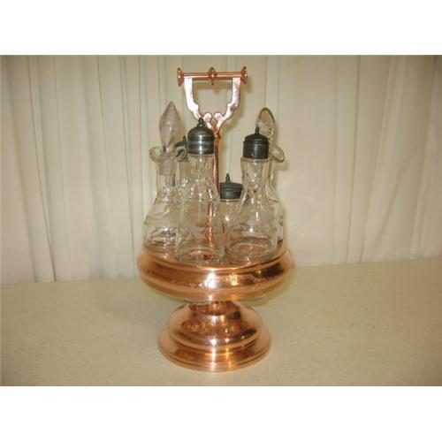 This great collectible is a very old glass condiment set that comes in a copper holder. The glass bottles feature beautiful etching in a very nice floral motif. There are six bottles - 2 cruets, 3 with salt and pepper-type lids, and 1 with a lid that has a slot for a small spoon which is 4 7/8" in height. The other bottles vary in height from 7 " to 8 3/8", and are all about 2" in diameter. The lids are dark silver. The copper holder has a beautiful stamped design in the center. This piece is in very good condition. We are not sure of the exact age. The holder measures 13 1/4" in height, and 7 3/8" in diameter. Total weight for this set is 5 pounds.