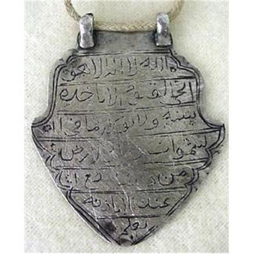 Genuine old silver amulet traditionally inscribed by a holy person and intended to ward off any potential evil influences. Near Eastern, probably 19th century. <P><P> Measurements: 2" wide and 2 1/4" high. <P><P>The amulet is badge-shaped with two loops at the top through which a cord or chain can be attached. It is inscribed in Arabic lettering. <P><P> There are no silver hallmarks on this amulet as is typical of old Persian/Iraqi (etc) pieces of those days. <P><P> Condition: good. There is some wear and light scratching appropriate to the age and usage of the piece.
