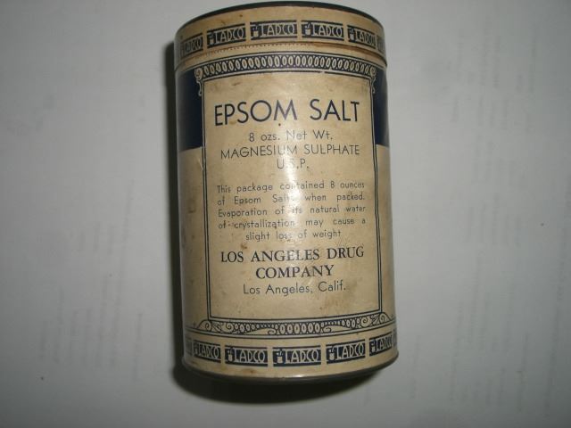 VERY OLD VINTAGE *EPSOM SALT-LOS ANGELES DRUG CO.* CONTAINER WITH LID COMPLETE!! ITEM CAME OUT OF ESTATE!! ***Coin, Currency & All Items Listed in this auction - Grades, Conditions and Values are not Safe Deposit Coins LLC Responsibilty. Grades, Condition and Values are determined by Consigner(s) & Buyers ONLY