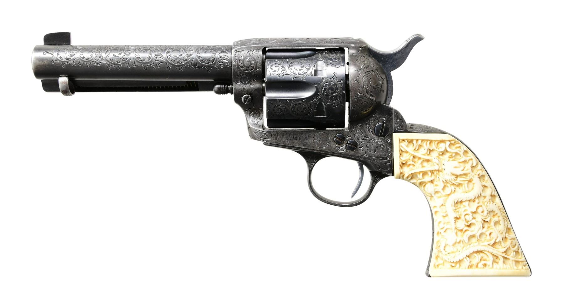 FIRST GEN SAA REVOLVER. Cal. 38 WCF. S# 207297. Mfg. 1901. Bbl. 4 3/4" with target style blade front sight. 6 Shot fluted cyl. Frame, cyl., bbl., grip frame & ejector rod housing feature highly ornamented full coverage floral scroll engraving with center of each scroll having a fine silver wire inlay. 1 piece intricately carved grip feature oriental style serpentine dragon on each side. CONDITION: very good as refinished at time of engraving. metal retains 95% custom black/ blue finish with light muzzle wear & thinning in area of trigger guard. Near excellent grips. Mirror bore displays sharp rifling. (24-1824/BH). CURIO. $6,000-8,500.