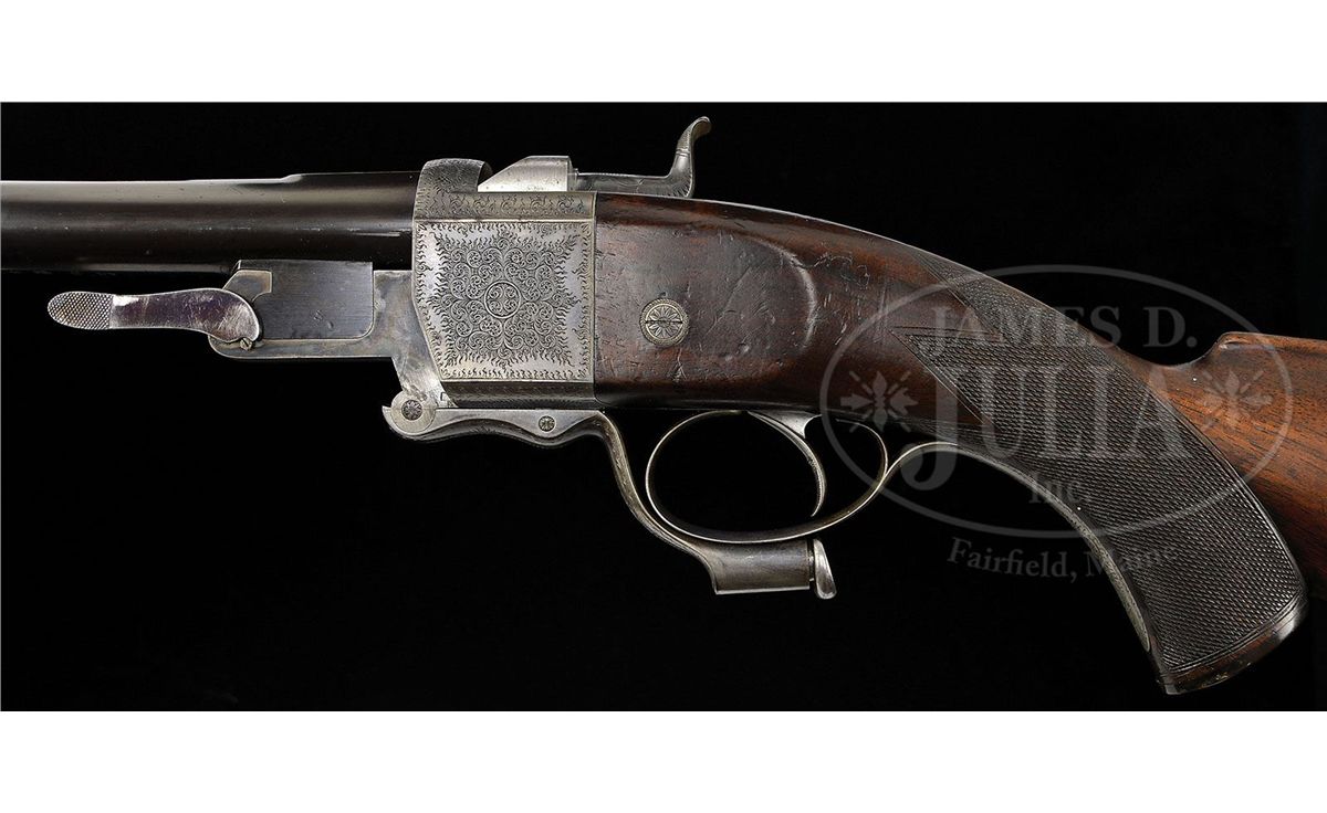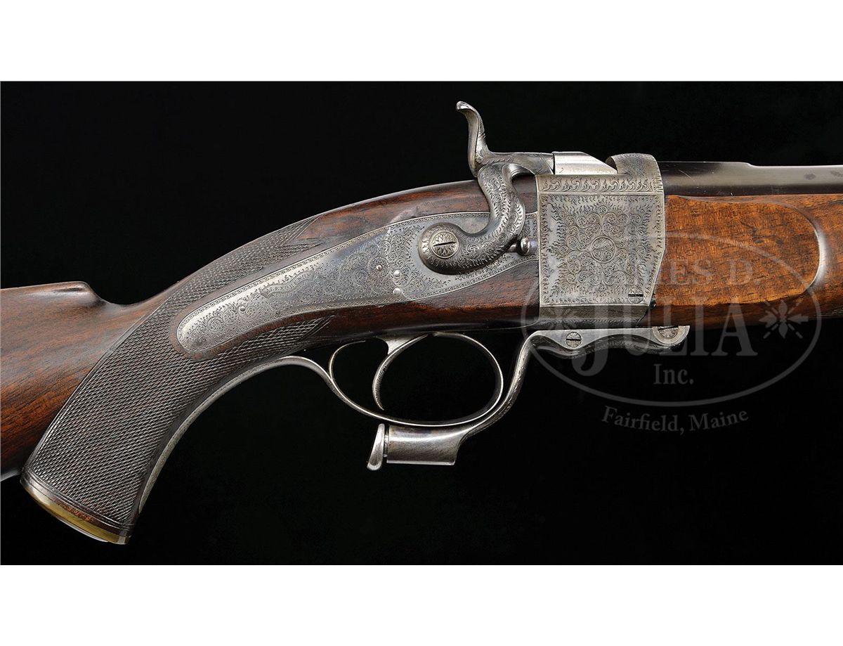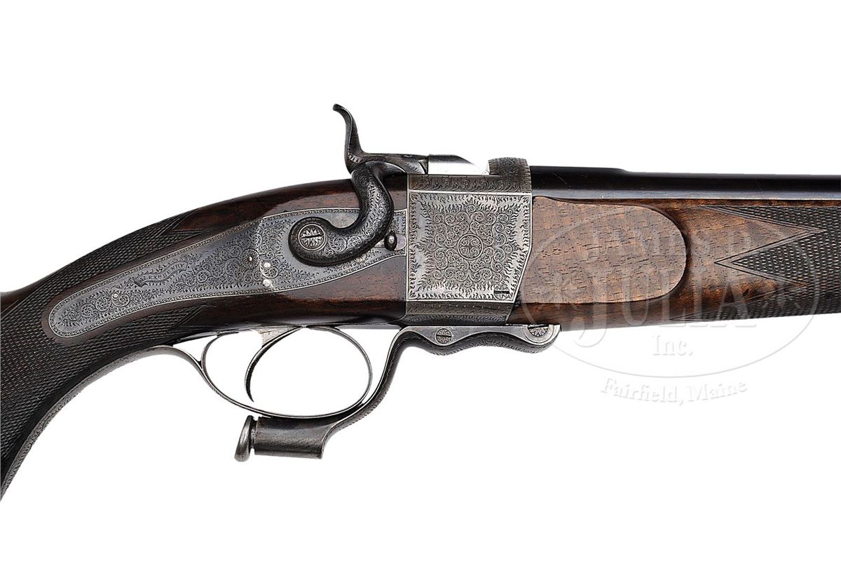 SN 6083. Cal. .450 BPE. 28" Tapered round bbl with ovate Nock form is fitted with one standing, one folding express rear sight, and longitudinally dovetailed front ivory bead, in island bases, and engraved "Alexr Henry, Edinburgh and London" at top rear. Bbl detaches from action with ingenious system of slight cone shaped mating of action to bbl, similar to how tapered lathe tools attach. Bbl is held against action by closely fitted large lug, which rotates into place on heavy extension of front of action, and is retained by pivoting lever. Bbl detachment is quickly effected as long as tension is put on opening lever so that extractor clears end of bbl. Case hardened action fitted with non-rebounding right hand lock with rebated tail, has typical Henry opening lever with spring detent latch. Lock is fitted with front sliding stalking safety, which engages at half cock. Action and lock are engraved with well cut, small scroll at nearly full coverage. "Alexr Henry" is in scrolled band on tail of lockplate. Serpentine hammer has stylized dolphin head. Top of receiver ring is engraved with use no. "Patent no. 2286". SN is on trigger guard tang. Finely streaked and lightly figured full horn capped pistol grip buttstock measures 14-5/8" over Silver pad, and features slim, double shadow line right hand cheekpiece, and point pattern checkering at grip. Matching forend attaches to bbl with forward pivoting latch. Drop at heel: approx 2-9/16", drop at comb: approx 1-3/4". Weight: 7 lbs. 12 oz. LOP: 14-5/8". CONDITION: Excellent. Bbl retains approx 95% orig bright blue, with some minor marks and scratches on left side, silvering at muzzle. Action retains 90% plus orig case hardening color, some light spotting, mostly on left side. Lock retains nearly all its orig color. Stocks retain most of their orig rubbed oil finish with numerous minor marks and dings. The pad has been cleaned up. Forend shows two repaired cracks emanating from bottom of action toward checkering, which shows light wear and dirt. Bore is fine with strong rifling throughout, slightly frosted. Action and lock are crisp. Takedown feature is very tight. Jonathan Kirton in his list of known Alexander rifles in THE BRITISH FALLING BLOCK BREECHLOADING RIFLE FROM 1865, notes only 8 takedown rifles. This fine example is one of the earliest.ÊÊ 4-47817 MGM74