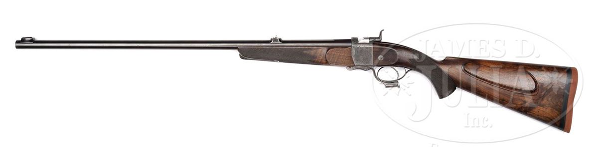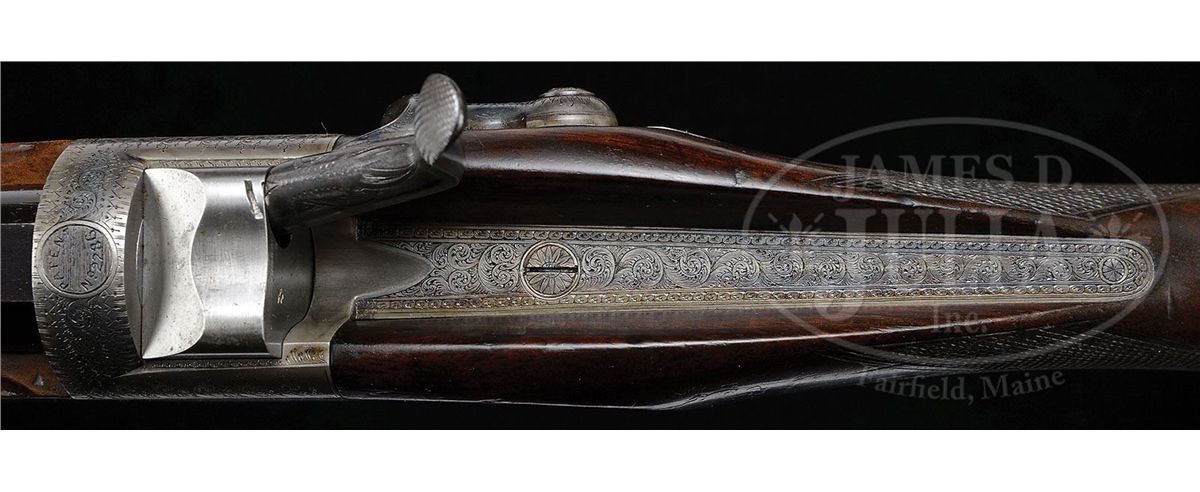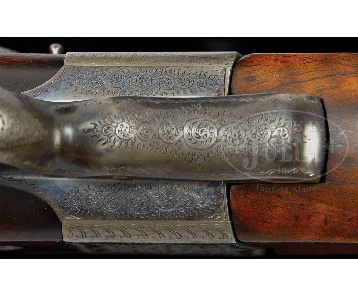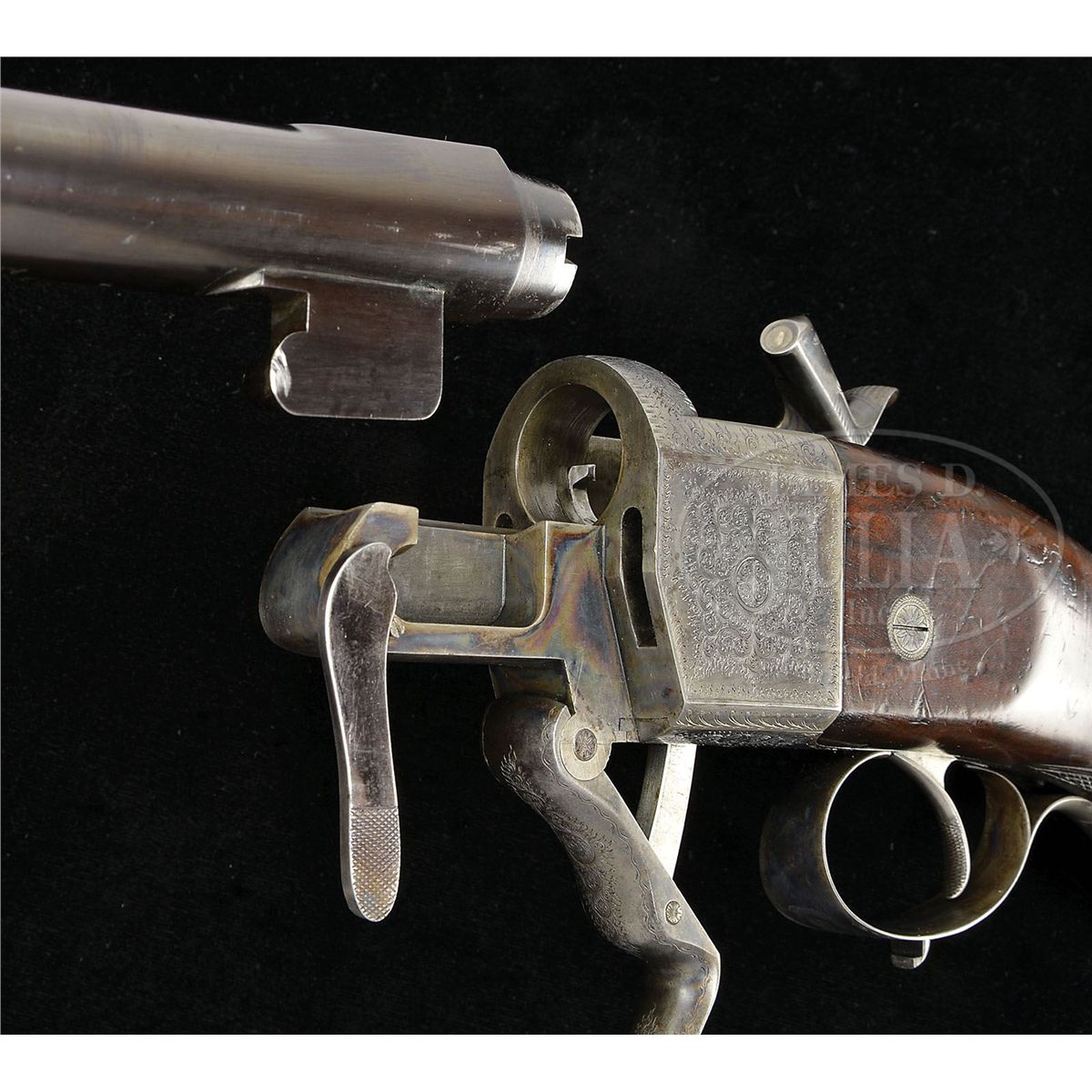 SN 6083. Cal. .450 BPE. 28" Tapered round bbl with ovate Nock form is fitted with one standing, one folding express rear sight, and longitudinally dovetailed front ivory bead, in island bases, and engraved "Alexr Henry, Edinburgh and London" at top rear. Bbl detaches from action with ingenious system of slight cone shaped mating of action to bbl, similar to how tapered lathe tools attach. Bbl is held against action by closely fitted large lug, which rotates into place on heavy extension of front of action, and is retained by pivoting lever. Bbl detachment is quickly effected as long as tension is put on opening lever so that extractor clears end of bbl. Case hardened action fitted with non-rebounding right hand lock with rebated tail, has typical Henry opening lever with spring detent latch. Lock is fitted with front sliding stalking safety, which engages at half cock. Action and lock are engraved with well cut, small scroll at nearly full coverage. "Alexr Henry" is in scrolled band on tail of lockplate. Serpentine hammer has stylized dolphin head. Top of receiver ring is engraved with use no. "Patent no. 2286". SN is on trigger guard tang. Finely streaked and lightly figured full horn capped pistol grip buttstock measures 14-5/8" over Silver pad, and features slim, double shadow line right hand cheekpiece, and point pattern checkering at grip. Matching forend attaches to bbl with forward pivoting latch. Drop at heel: approx 2-9/16", drop at comb: approx 1-3/4". Weight: 7 lbs. 12 oz. LOP: 14-5/8". CONDITION: Excellent. Bbl retains approx 95% orig bright blue, with some minor marks and scratches on left side, silvering at muzzle. Action retains 90% plus orig case hardening color, some light spotting, mostly on left side. Lock retains nearly all its orig color. Stocks retain most of their orig rubbed oil finish with numerous minor marks and dings. The pad has been cleaned up. Forend shows two repaired cracks emanating from bottom of action toward checkering, which shows light wear and dirt. Bore is fine with strong rifling throughout, slightly frosted. Action and lock are crisp. Takedown feature is very tight. Jonathan Kirton in his list of known Alexander rifles in THE BRITISH FALLING BLOCK BREECHLOADING RIFLE FROM 1865, notes only 8 takedown rifles. This fine example is one of the earliest.ÊÊ 4-47817 MGM74