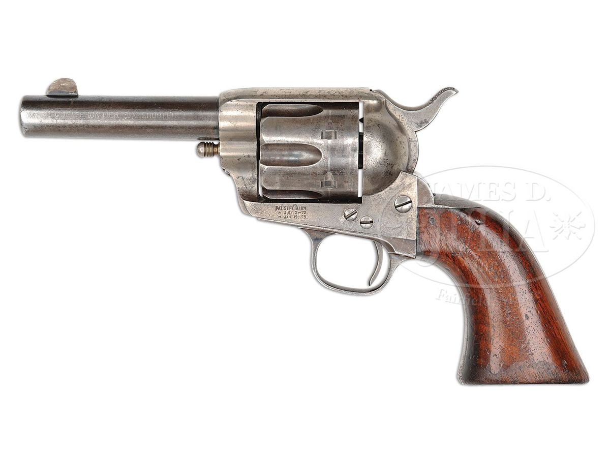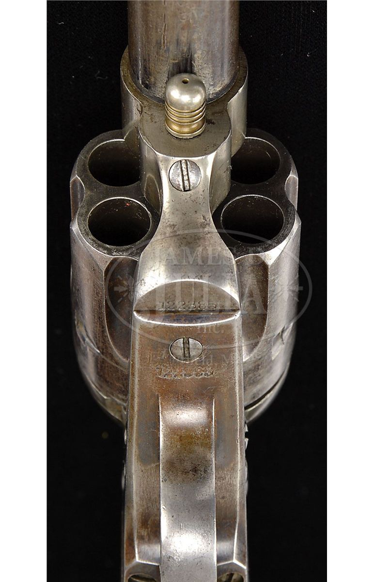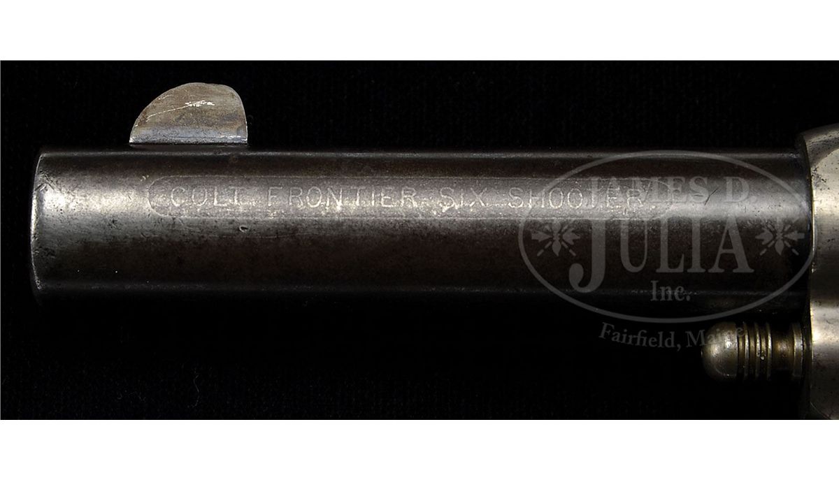 PLEASE NOTE (10/7/13): The serial number was omitted from the catalog description. The SN is 122385. Cal .44 WCF (44-40). Blue color case hardened with 4" bbl made without ejector housing. Front sight is altered slightly, having been thinned. Small 2-line address and left side has the full, legible etched panel "COLT FRONTIER SIX SHOOTER". Bottom of bbl is marked with a tiny "44" under the base pin. Frame is considered a "made as" frame, not converted from a frame with ejector housing. Left side of frame has 3-line patent dates and left front web of trigger guard is marked "44 CAL". Mounted with 1-pc varnished walnut grip that has last four digits of matching serial number in the backstrap channel. Hammer is correct style with long, coarse checkered panel and all visible numbers are matching. Rear face of cylinder is marked with an "I" inspector mark and hammer slot of the frame is marked with a "p". Base pin is orig type with dimpled ends. Accompanied by a Colt Factory letter which identifies this revolver in Cal 44-40 with 4" bbl, blue finish, type of stock not listed and shipped to "A. G. Spearth", Astoria, OR on October 20, 1887 in a two gun shipment. Also accompanied by a 4-page letter from renowned Colt historian, author, Ron Graham, and someone who is considered to be one of the most knowledgeable experts regarding the Colt Single Action Army Sheriffs Model revolvers. Mr. Graham gives a brief history of the Sheriffs Model revolvers and states that the person named in the records, to whom the revolver was shipped "A.G. Spearth" has another spelling in the records as "Spexart". Mr. Graham also states that there are only 5 surviving examples of Sheriffs Model Single Actions with etched panel bbls that were discovered during his 35 years of extensive research for his books. He states that the total production will never be known because so many of those revolvers were subjected to such hard service, under extreme conditions which erased the shallow etched panels. His research confirmed the production of at least 426 ejectorless Single Action revolvers but is definitely not a total production number. He states that his research has concluded that about 23% of Sheriffs Model revolvers were chambered for the 44-40 cartridge and that extrapolation of the figures show that there were probably only about 75 which had etched panels. He also states that this revolver is factory orig and that all characteristics found on this revolver are correct for its 1887 production period. He recants that conversation between Mr. Graham and well known Sheriffs Model collector and authority, John Irwin, disclosed that Mr. Graham had never previously seen a complete etched panel on a Sheriffs Model revolver until this one and that Mr. Irwin had never seen or heard of a complete panel on a Sheriffs Model revolver. Also, Mr. Irwin believes that the person or company to whom this revolver was shipped was probably "A. G. Spalding & Bros". Also accompanying is a sheet of combined research from Mr. Graham and Mr. Irwin as of Dec 1986, which shows that as of that date there were 428 authenticated Sheriffs Model serial numbers that had been documented and that there were 124 Sheriffs Model revolvers still in existence. The list also shows that the lowest know "made as" frame is this revolver. All of this information combines to make this one of the most rare Single Actions and also one of the most rare of Sheriffs Model revolvers. CONDITION: Very fine, all matching. Bbl retains about 50% orig blue with the balance mostly turned to a plummy patina with holster wear on left side at the muzzle. Frame and hammer retain traces of faded case color in the most sheltered areas being mostly a silver gray patina. Cylinder retains about 50% thin orig blue on the outer diameter, strong in the flutes. Rear face in the cylinder retains strong orig blue. Backstrap and trigger guard retain traces of orig blue and plummy patina with front and backstraps grey patina. Buttstrap has some scratched initial that may be "MV". Grip is sound showing moderate edge wear, a few nicks and scratches and retains 75-80% orig varnish. Hammer is not solid in safety or half cock notches, otherwise mechanics are fine. Strong bright bore with good shine and a few scatters spots of light pitting. Has been fired but not a lot, mostly just handled and carried. This is a true exceptional Single Action in great orig condition. 4-49415 JR309
