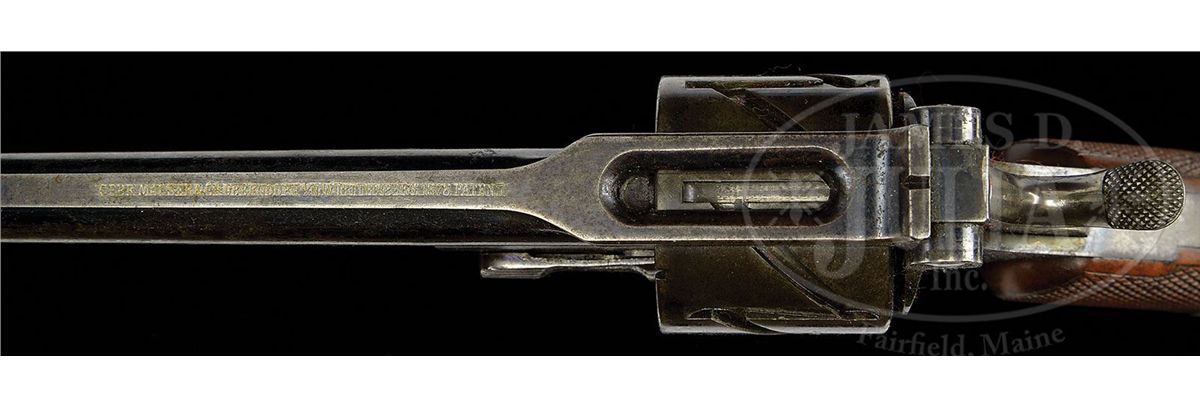 SN 213. Cal. 10.8mm Mauser rimmed. Blue finish with 5-9/16" keyhole shaped bbl with integral front sight marked on the top rib "GEBR. MAUSER & CIE OBENDORF A/N. WURTTEMBERG. 1878 PATENT". Top strap has an open slot. Cylinder has the unusual feature of the "Zig-Zag" pattern around the outside diameter which acts as a slot for the hand to rotate the cylinder for the next shot. Left front side of the frame has a thumb safety which locks the cylinder by means of notches in the protruding rim. Bottom front of the frame, has a lever which is attached to the bbl, which when opened allows the bbl to tip up for reloading. It is mounted with 2-pc, full checkered, sharply angled walnut grips that are matching numbered to this revolver. Butt of the grip frame has a lanyard stud and ring. Production numbers of the zig-zag pistol are unknown but they are believed to be extremely limited and had very limited distribution in the U.S. The big bore model is considered to be the most rare. PROVENANCE: Joseph J. Schroeder, Jr. Collection. CONDITION: Fine, all matching including grips. Overall retains 40-50% orig blue mixed with brown patina. Hammer and locking lever retain faded case colors. Grips are sound showing moderate wear with a hand worn patina. Mechanics are fine. Bright, shiny bore with a few small scattered spots of pitting. 4-48588 JR110