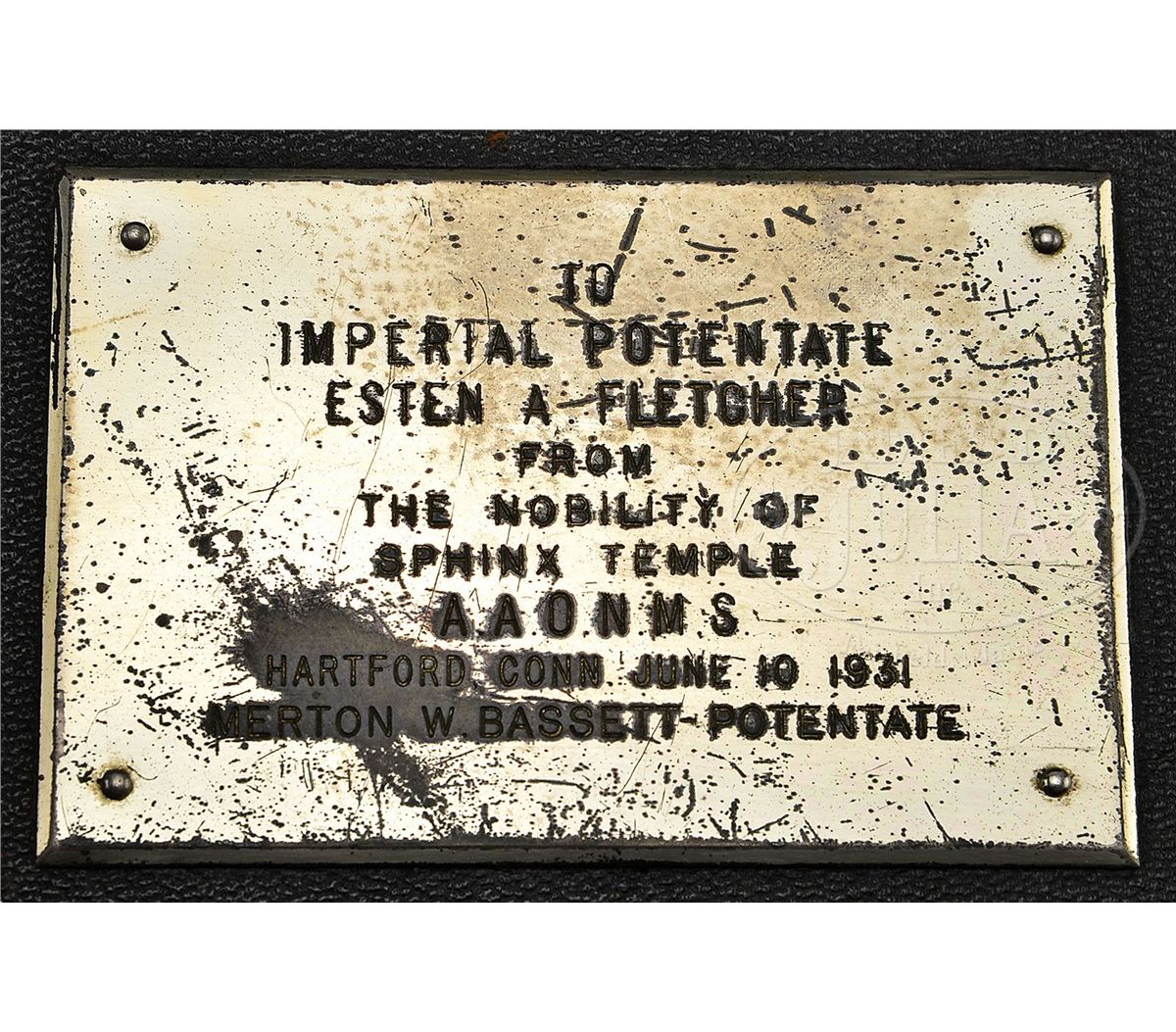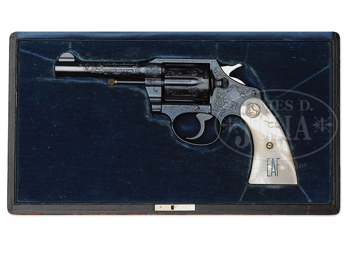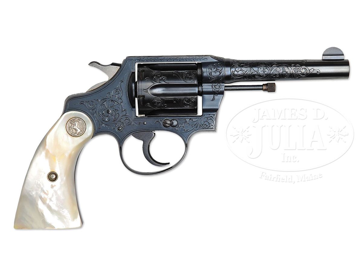 SN 403755. Cal. 38 Spcl. All blue finish with 4" bbl. Integral half moon front sight and 2-line address with model and cal. marking on the left side. Mounted with beautiful Colt silver medallion 2-pc smooth pearl grips inscribed on the left side "EAF". Revolver is beautifully engraved, probably by Wilbur Glahn. Engraving consists of about 60% coverage fine foliate arabesque patterns with pearled background and fine border line engraving around rear sides of the frame. Sides of the top strap are engraved in leaf and vine patterns. Foliate arabesque patterns extend over both sides of the bbl, onto the top strap, rear edge of the frame, backstrap and trigger guard with Mr. Glahn's distinctive "V" device on the buttsrap. Cylinder is engraved to match with fine line borders around the flutes. Accompanied by its orig blue velvet lined, black Moroccan leather covered casing which is form fitted in the bottom for the revolver. Top of the case is inlaid with a 3-3/4" X 2-1/2" silver plated brass plaque engraved "TO / IMPERIAL POTENTATE / ESTEN A. FLETCHER / FROM / THE NOBILITY OF / SPHINX TEMPLE / AAONMS / HARTFORD, CONN. JUNE 10, 1931 / MERTON W. BASSETT / POTENTATE". Esten Fletcher (1864-1941) was elected Imperial Potentate of the Ancient Arabic Order, Nobles of the Mystic Shrine June 1930 for a 1 year term into June 1931, which coincides with the date on the presentation plaque. Mr. Fletcher was active in local politics and charities and was even considered as a candidate for national politics, which he apparently declined. He was very active in the Masonic order, rising to the 33rd degree to which very few attain or even pursue. In order to become a 33rd degree Mason one must have impeccable character and a history of service, not only to the Masonic order but to the local community. Also accompanied by a Colt factory letter identifying this revolver in Cal. 38 with 4" bbl, blue finish, type of stock is not listed, factory engraved and shipped to Sphinx Temple, Hartford, Conn on June 19, 1931 in a 1 gun shipment, under factory order 3275, delivered by "Mr. Penfield". PROVENANCE: Esten A. Fletcher. CONDITION: Extremely fine plus, probably unfired. Overall retains virtually 100% of its crisp orig factory blue with no visible flaws. Grips are equally new. Case shows nicks and scratches on the outside and retains strong orig black finish. Interior is lightly faded inside the lid and moderately faded with light soil in the bottom. 4-47860 JR101