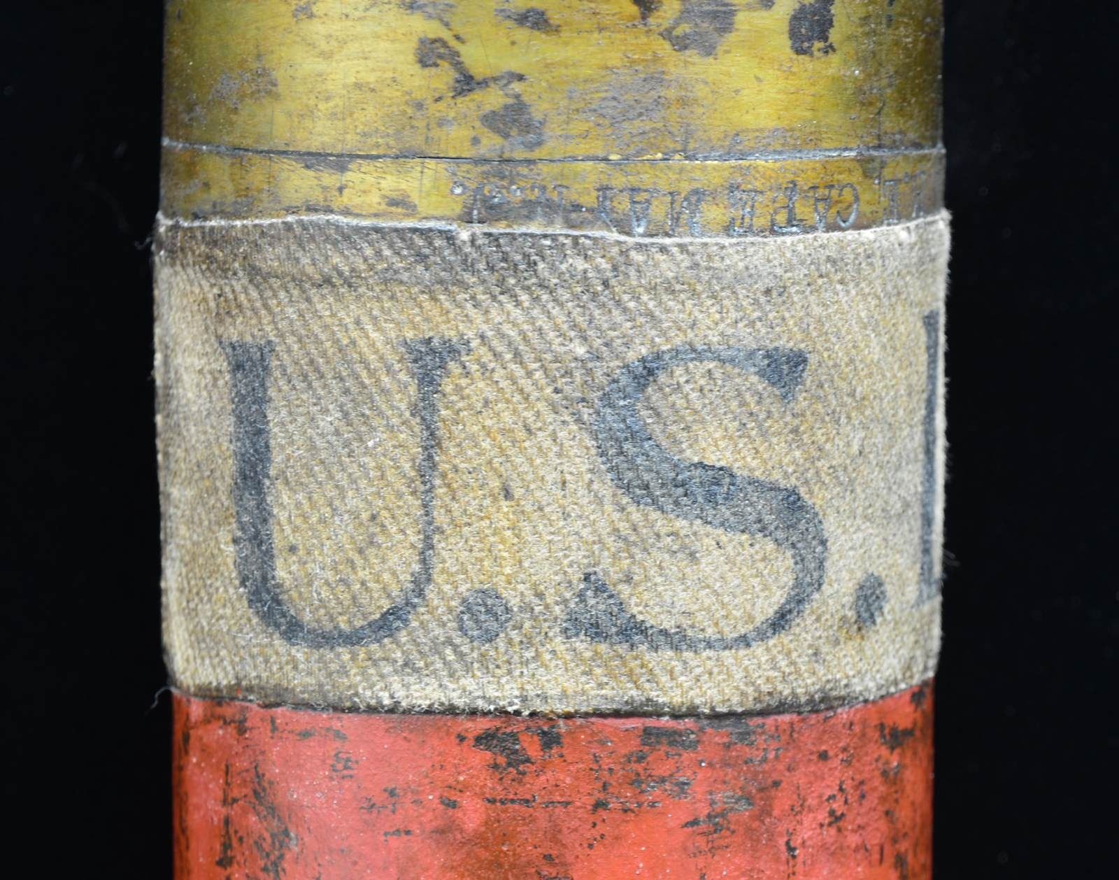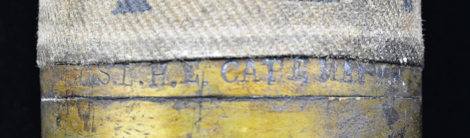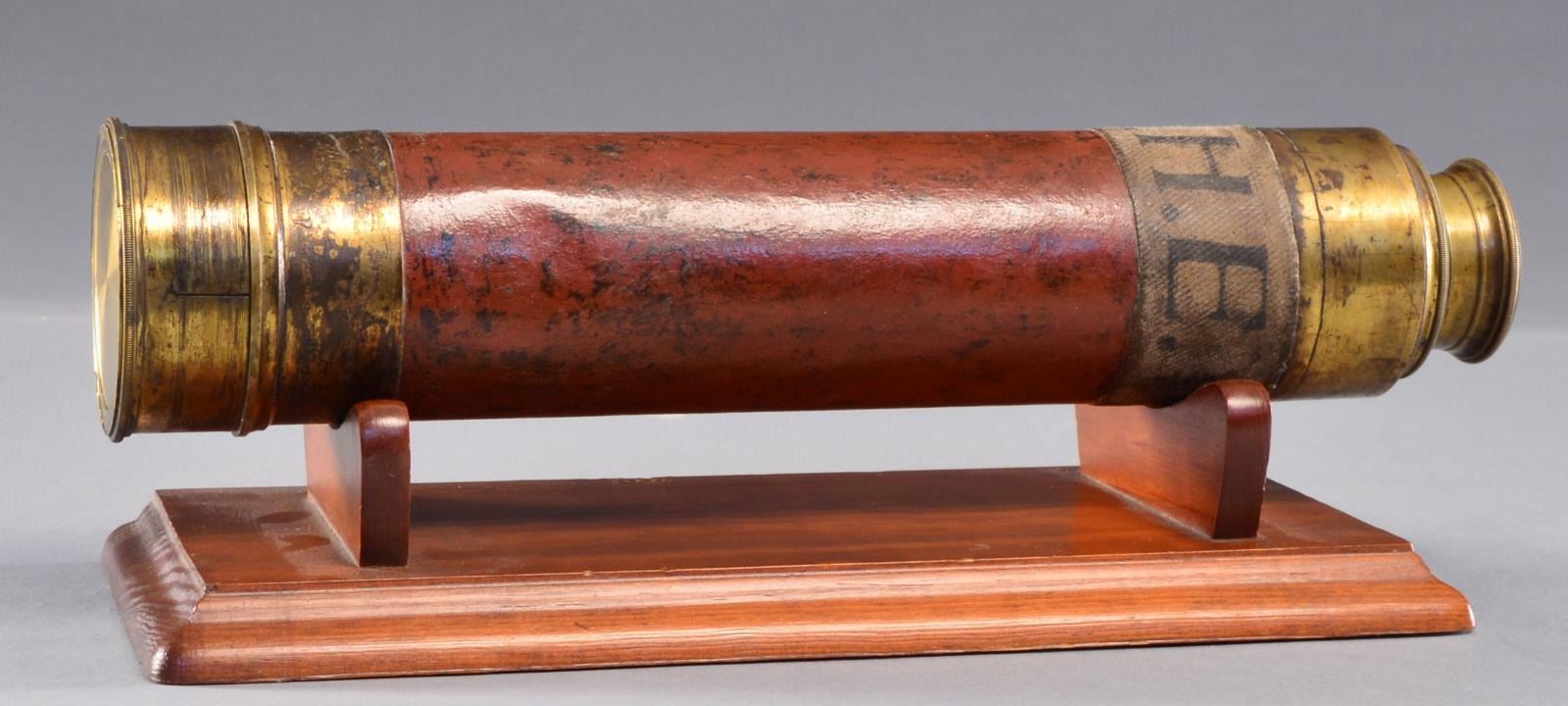 CAPE MAY NEW JERSEY LIGHTHOUSE. 48" Overall open, 13 1/2" closed, 2 1/2" objective lens, 3/4" eyepiece lens, 5 stage, opens to four feet w/ incredible optics as needed for lighthouse use in 19th century. Telescope is marked on original sail cloth fabric “U.S.L.H.E.” & stamped in brass “U.S.L.H.E. CAPE MAY N. J.” USLHE stands for United States Light House Establishment which was formed in 1792, Cape May was built in 1859 & was part of the USLHE till 1910 when the USLHE was privatized to contractors into USLHS (US Light House Service). This telescope is unmarked as to manufacturer but has all the attributes seen on Civil War era telescopes & field glasses, American made examples of this era are rarely maker marked. UNATTACHED ACCESSORIES: file w/ collector notes. CONDITION: very good to fine overall, optics are excellent, brass covers for both lenses are intact, painted body is intact, the sailcloth canvas strip painted U.S.L.H.E. worn & scuffed but lettering complete, brass has mottled medium mustard patina & some bright areas where the originally burnished & varnished metal is still bright. PROVENANCE: From the Collection of John "Tim" Breth Jr. (02-13782/JS). $2,000-3,000.