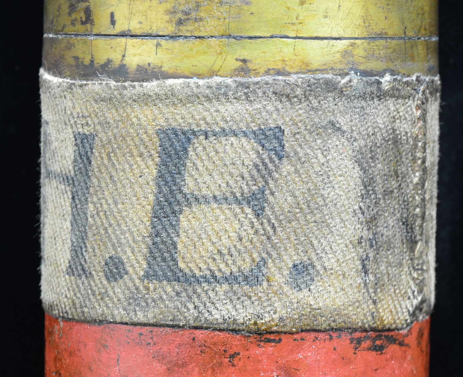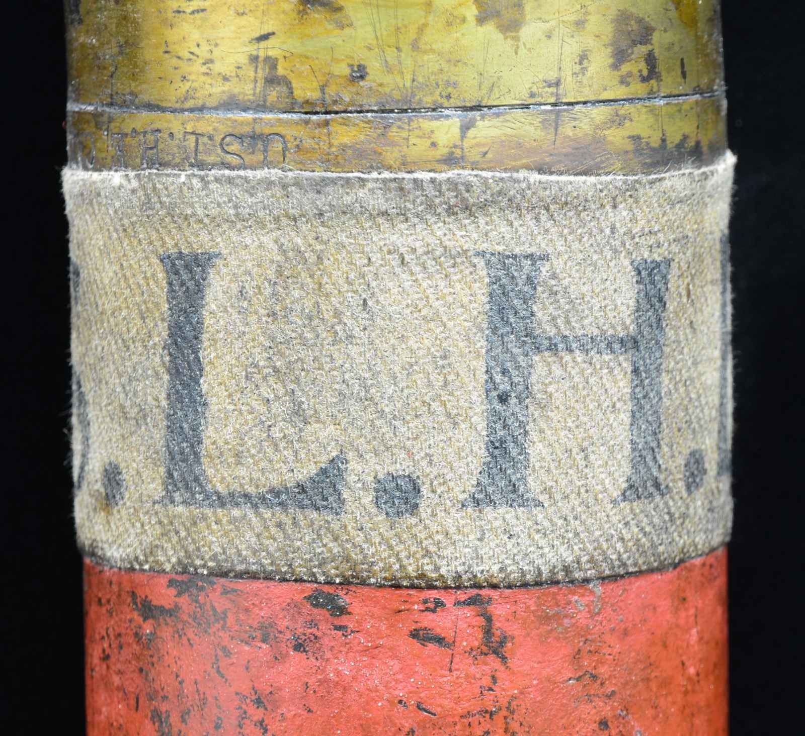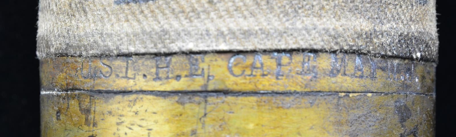 CAPE MAY NEW JERSEY LIGHTHOUSE. 48" Overall open, 13 1/2" closed, 2 1/2" objective lens, 3/4" eyepiece lens, 5 stage, opens to four feet w/ incredible optics as needed for lighthouse use in 19th century. Telescope is marked on original sail cloth fabric “U.S.L.H.E.” & stamped in brass “U.S.L.H.E. CAPE MAY N. J.” USLHE stands for United States Light House Establishment which was formed in 1792, Cape May was built in 1859 & was part of the USLHE till 1910 when the USLHE was privatized to contractors into USLHS (US Light House Service). This telescope is unmarked as to manufacturer but has all the attributes seen on Civil War era telescopes & field glasses, American made examples of this era are rarely maker marked. UNATTACHED ACCESSORIES: file w/ collector notes. CONDITION: very good to fine overall, optics are excellent, brass covers for both lenses are intact, painted body is intact, the sailcloth canvas strip painted U.S.L.H.E. worn & scuffed but lettering complete, brass has mottled medium mustard patina & some bright areas where the originally burnished & varnished metal is still bright. PROVENANCE: From the Collection of John "Tim" Breth Jr. (02-13782/JS). $2,000-3,000.