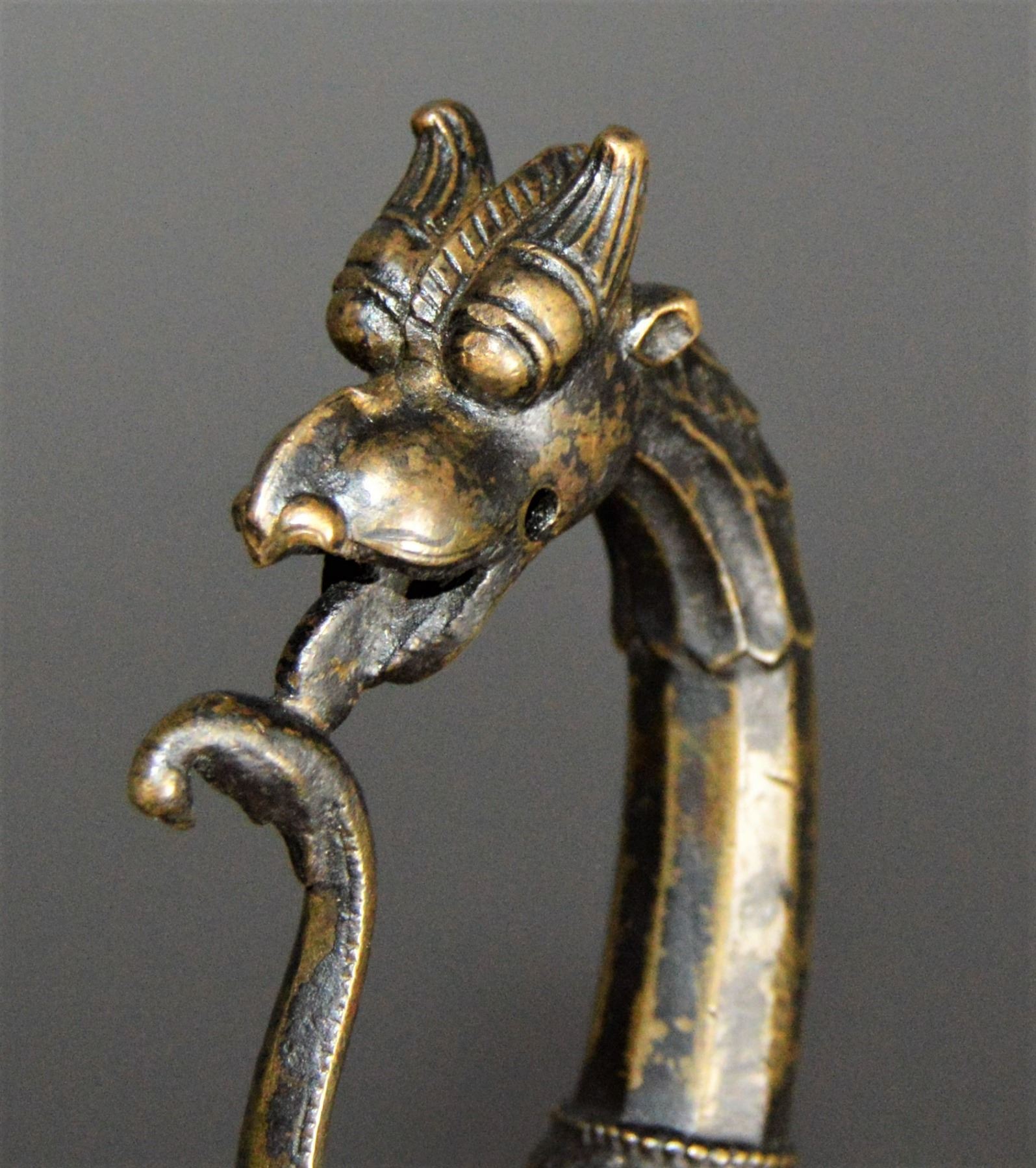 A VERY RARE MUGHAL DECCANI BRASS DAGGER HILT IN THE SHAPE OF A RAMPANT LION OR BEAST ( MONSTER ).