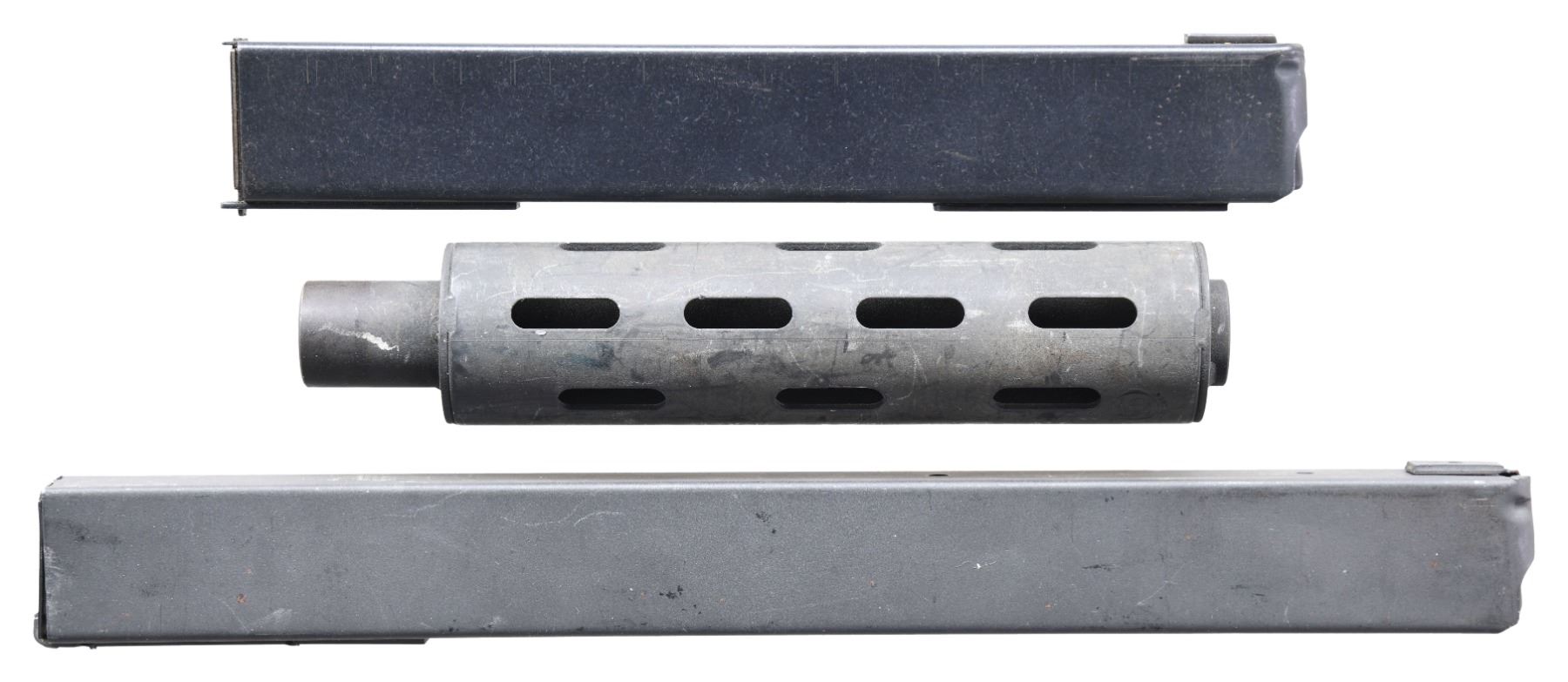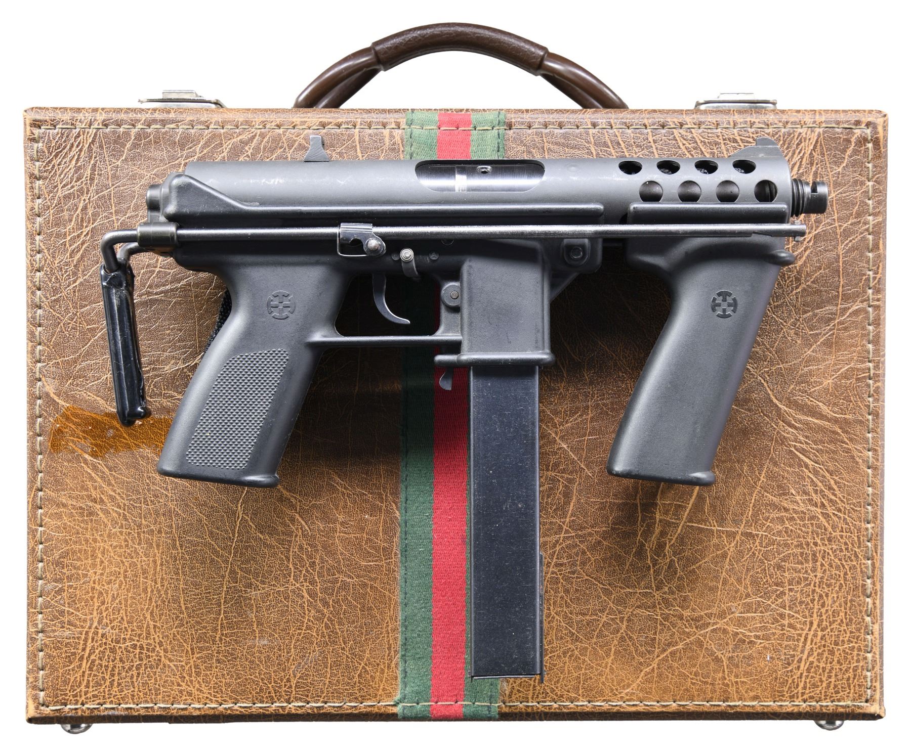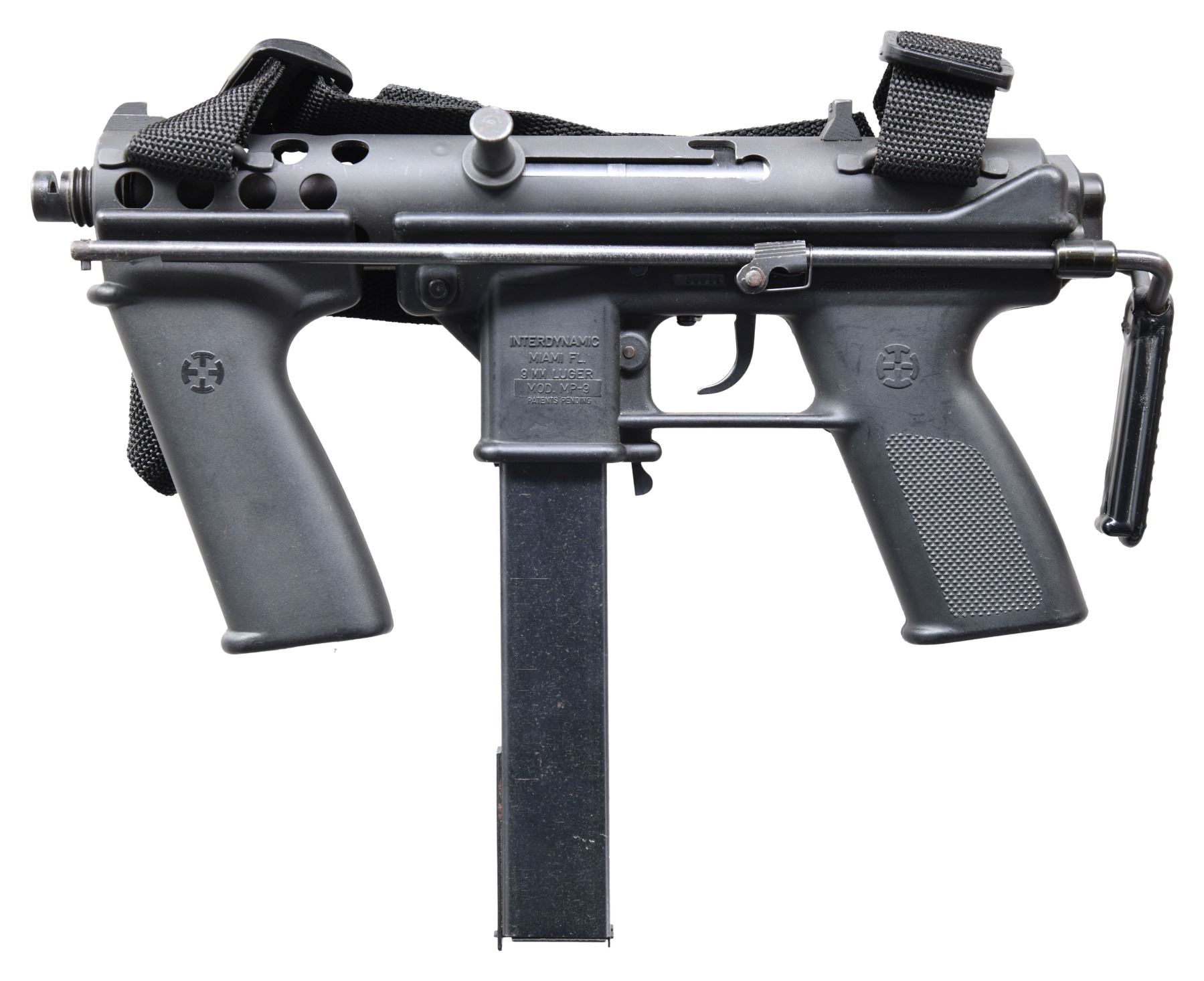 SUBMACHINE GUN. Cal. 9mm. S# 00011. Bbl. 5.25". A very special submachine gun, both in rarity & in its place in the firearms industry. The Interdynamic MP-9 is an open bolt, blowback, select fire, submachine gun that is the grandfather of the infamous KG-9, and the later TEC-9 pistol family. Introduced in 1983, less than 25 were manufactured before Congress passed the Hughes Amendment of the Gun Owner Protection Act, making it illegal to manufacture a new machine gun for individual ownership. While designed in Sweden, it never entered production in its home countery & set up an American subsidiary in the United States, headed up by Carlos Garcia & George Kellgren, who would later found Kel-Tec. They had earlier introduced a semiautomatic version, the KG-9, which was an open bolt, blowback operated system. Following the 1982 BATF ruling outlawing open bolt semi auto firearms, they were redesigned as a striker fired, closed bolt system & designated the KG-99. The U.S. based branch located in Miami, FL eventually changed company name to Intratec where they later marketed it as the Tec-9, later changing to the DC-9. Following the Federal knee jerk reactionary assault weapons ban, changes were made to comply, such as mfg. the bbl. w/out threads at the bore where it was re-branded once again as the AB-10 ("AB" is After Ban). This example is a rare, original, select-fire MP-9. It is not a later converted TEC-9, but the real deal, manufactured in numbers rumored to be less than 25 units as configured in select-fire, w/ a factory collapsing stock. Units that were full auto only, w/ no stock were also manufactured in slightly larger numbers. Polymer frame & tubular upper receiver extended to the front, as a ventilated barrel shroud. Factory barrel includes compensator cuts forward of the barrel threads. Fixed sights permanently attached to receiver. The safety is built into the charging handle which engages into a slot cut at approx. 11 o'clock in the tubular receiver. It is engaged by rotating the bolt so the safety coincides w/ the safety slot. Parkerized matte black finish on exposed metal surfaces. Polymer receiver is injection molded black in color. Mag. release is located below the trigger to the rear of the mag. well. Selector is located forward of the trigger inside the trigger guard. Collapsible wire stock extends 8.5" rear of the receiver when extended. The MP-9 is functional w/ the stock open or closed. Vertical front pistol grip resides below the barrel shroud. Left side sling attachment points, currently sporting black nylon sling. MAGS: (3 total). 2 steel 32 rd. 1 steel 50 rd. UNATTACHED ACCESSORIES: Slotted, 7" barrel extension & leather briefcase. CONDITION: Matte black finish is complete & consistent w/ some gentle thinning in areas of mechanical intervention & some high spots. Bore is bright w/ strong rifling. Fire control mechanism appears to function correctly when cycled by hand. NATIONAL FIREARMS ACT MG REQUIRING BATF TRANSFER BEFORE TAKING POSSESSION. FULLY TRANSFERABLE.(03-1859/JZ). MODERN. CLASS III. 8,000-12,000.